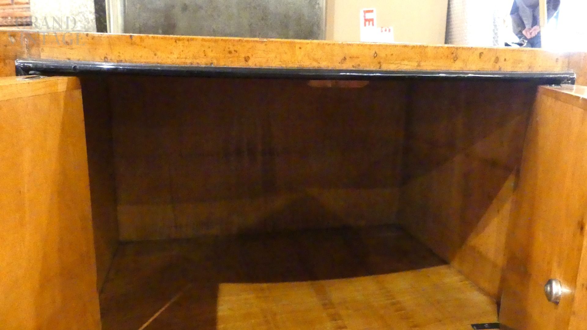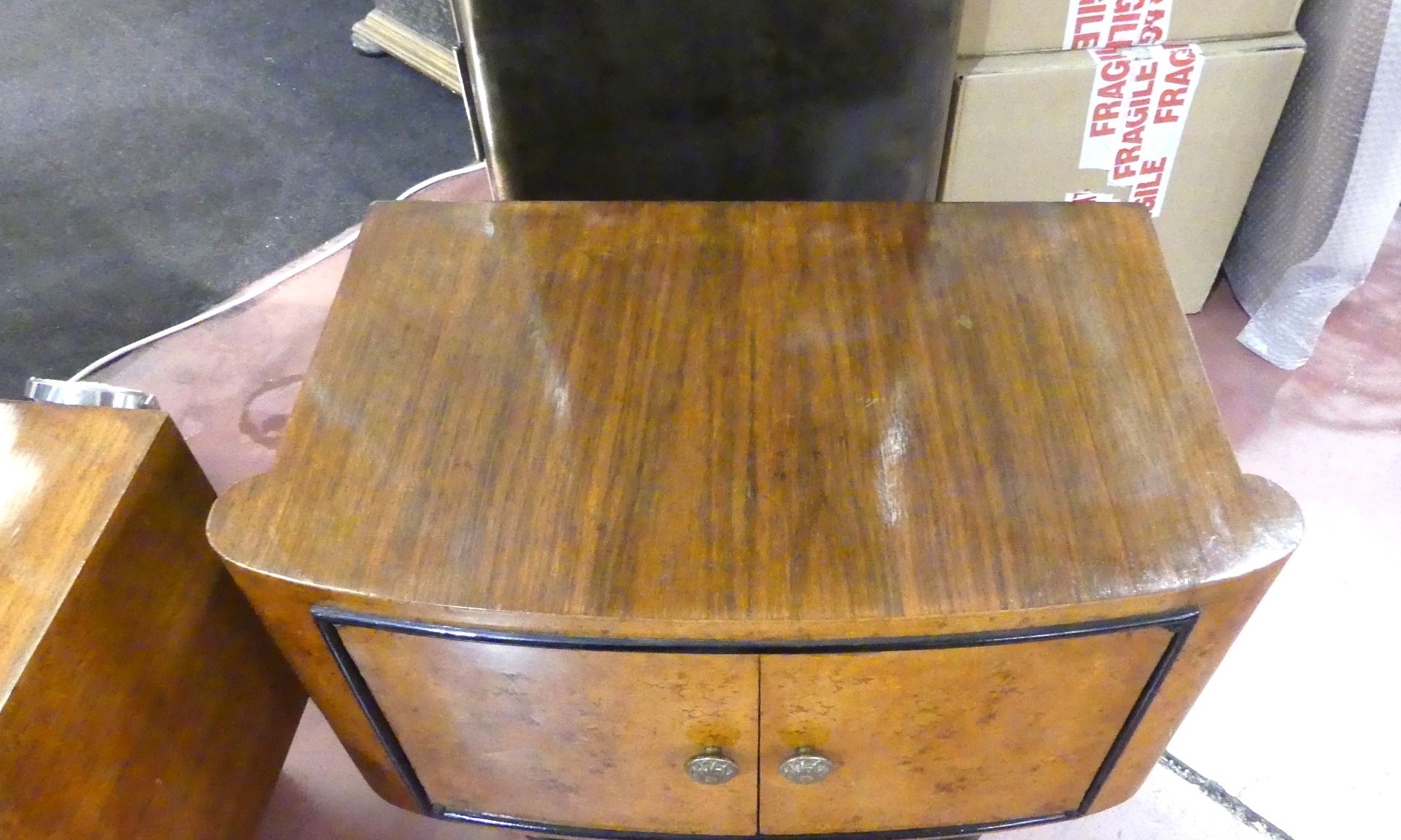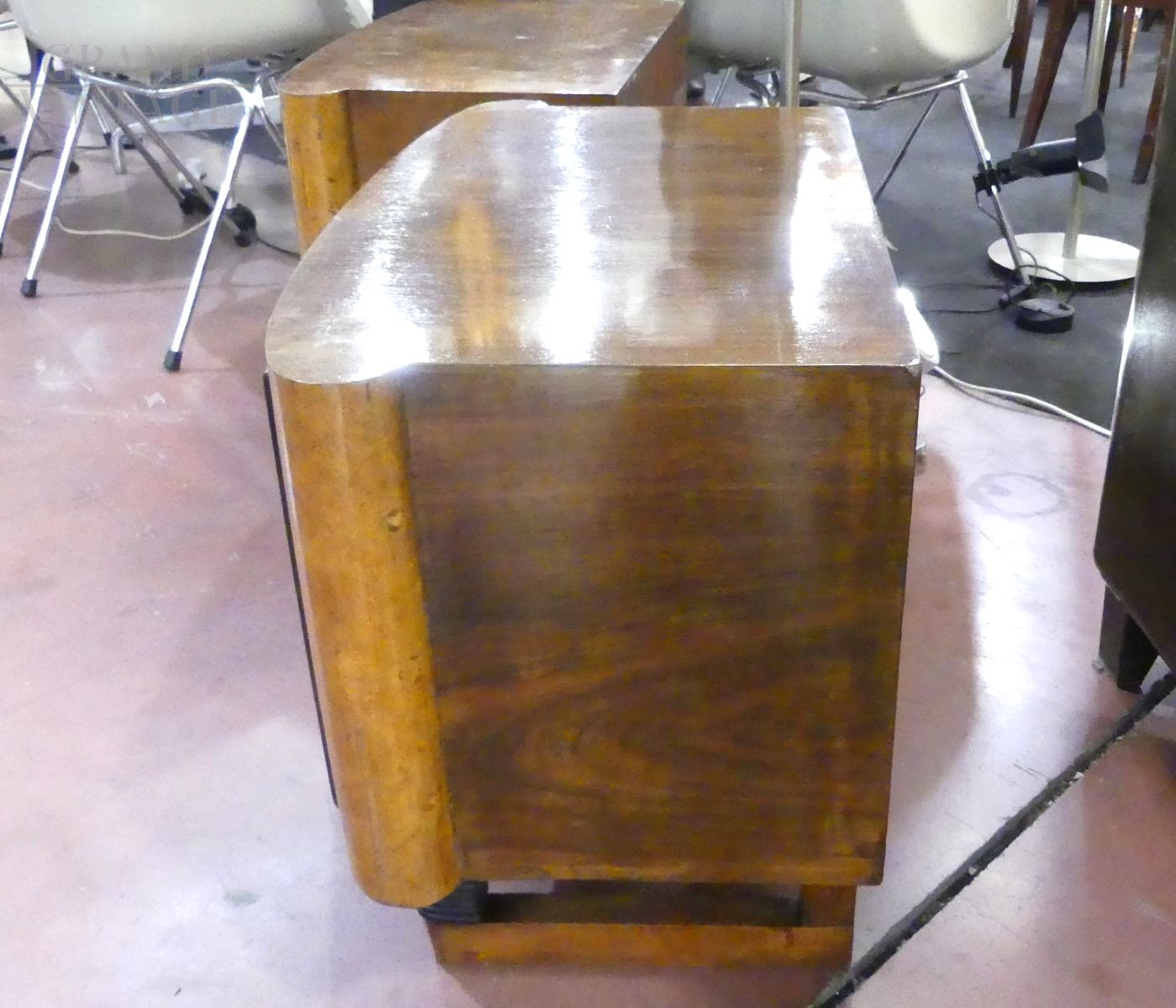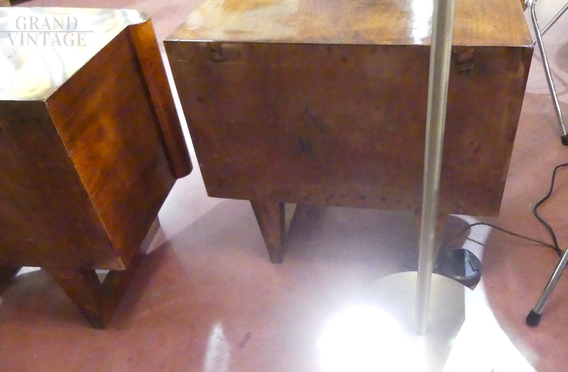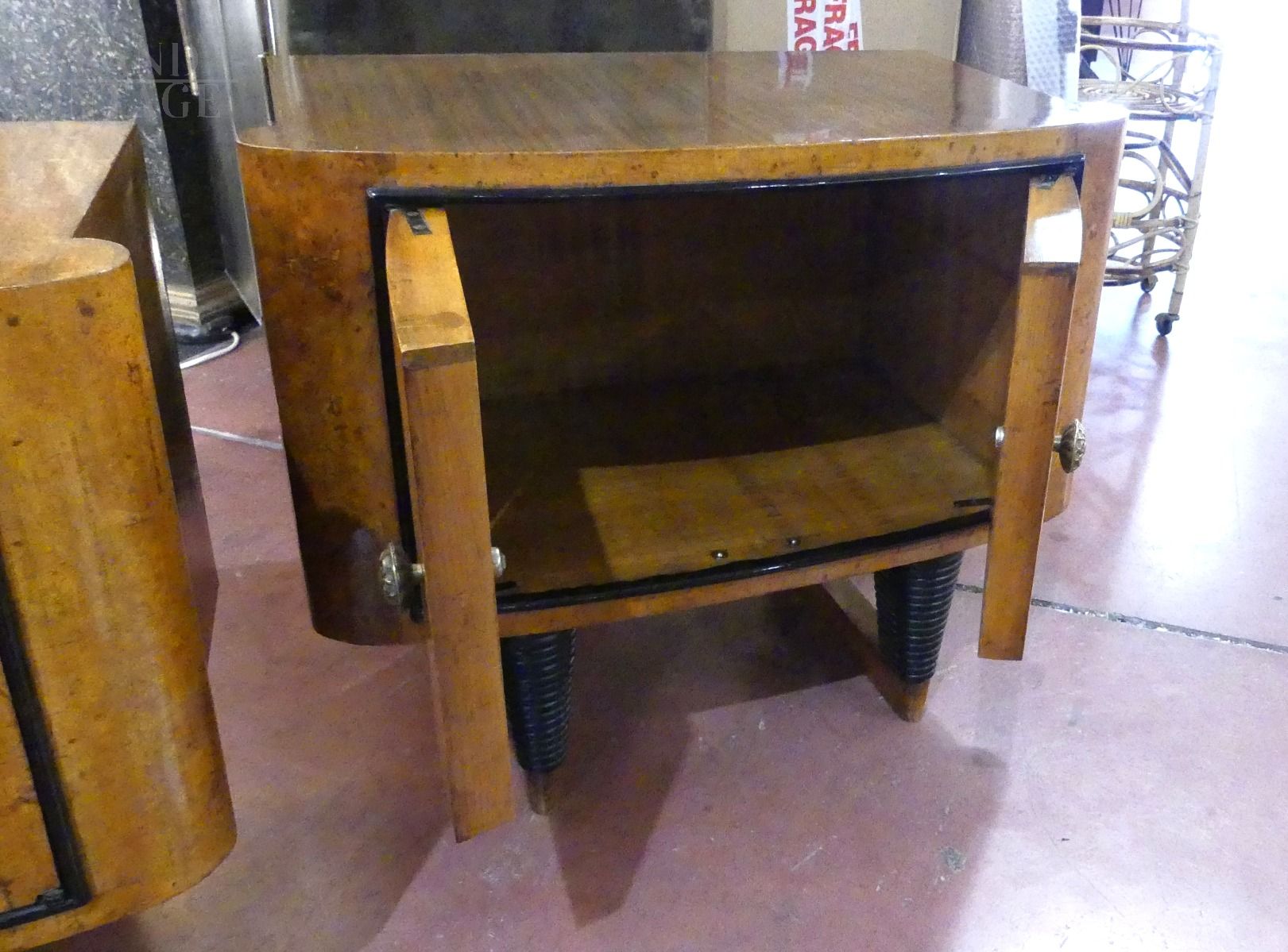 Bellissima coppia di comodini art déco anni '40 in radica di rovere e pioppo con profili ebanizzati, gambe molto particolari con decoro in torciglione ebanizzato e con un unico pezzo in legno che unisce le gambe anteriori alle posteriori.