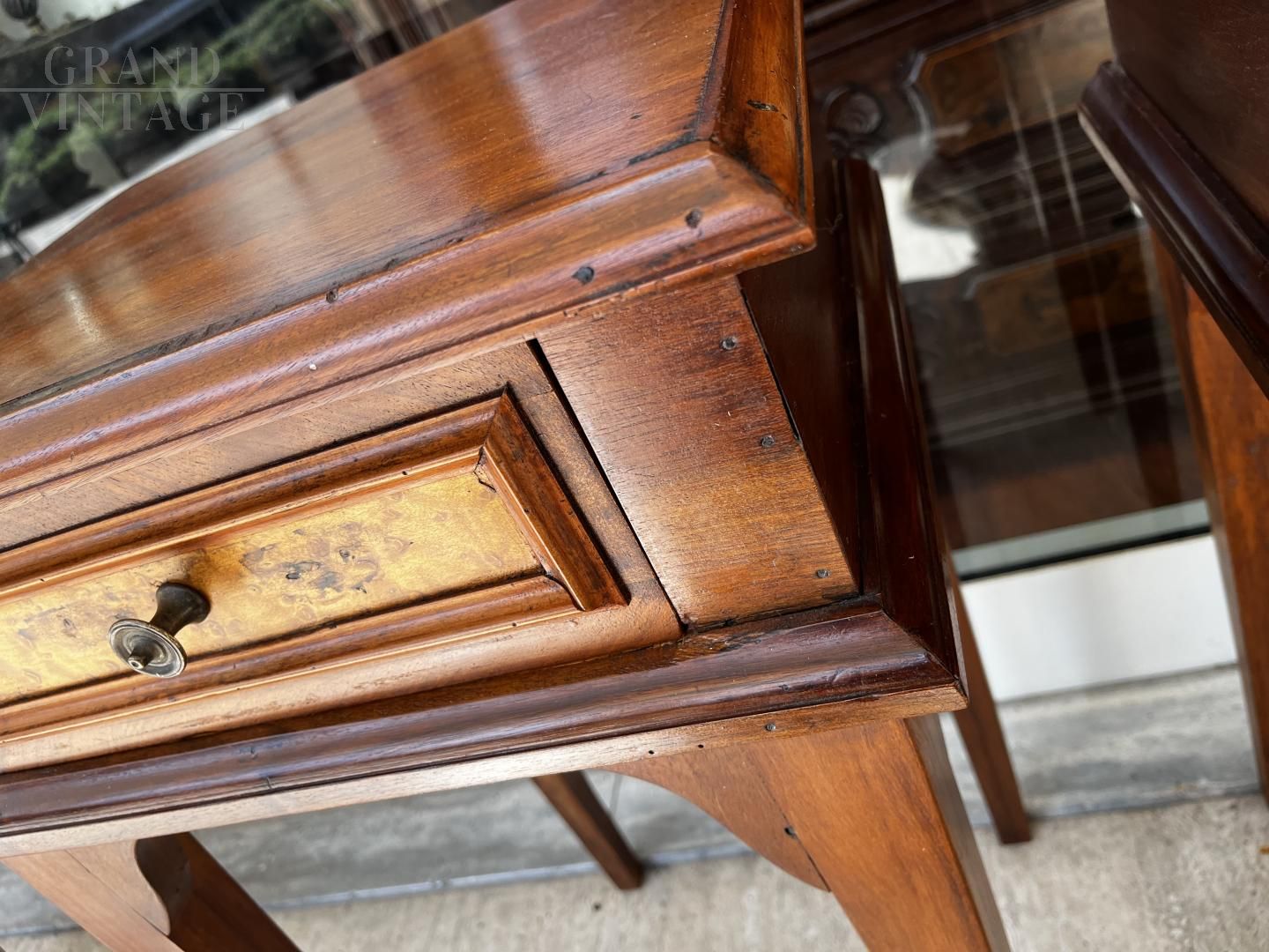 Coppia di comodini alti antichi di inizio '800 in legno di noce con cassettino in radica internamente rivestito, restaurati, utilizzabili anche come piedistalli.