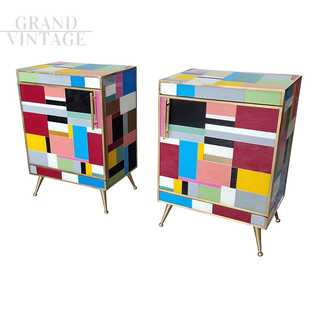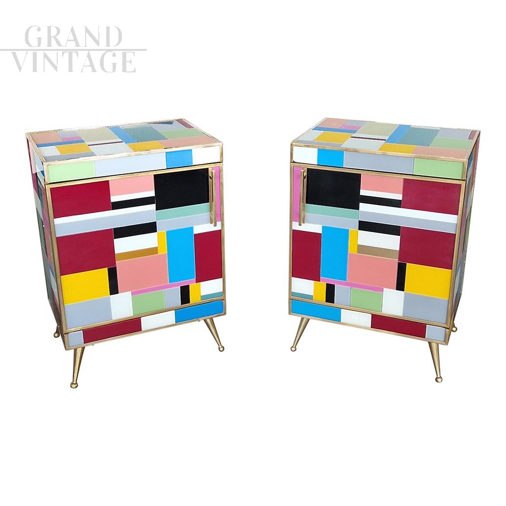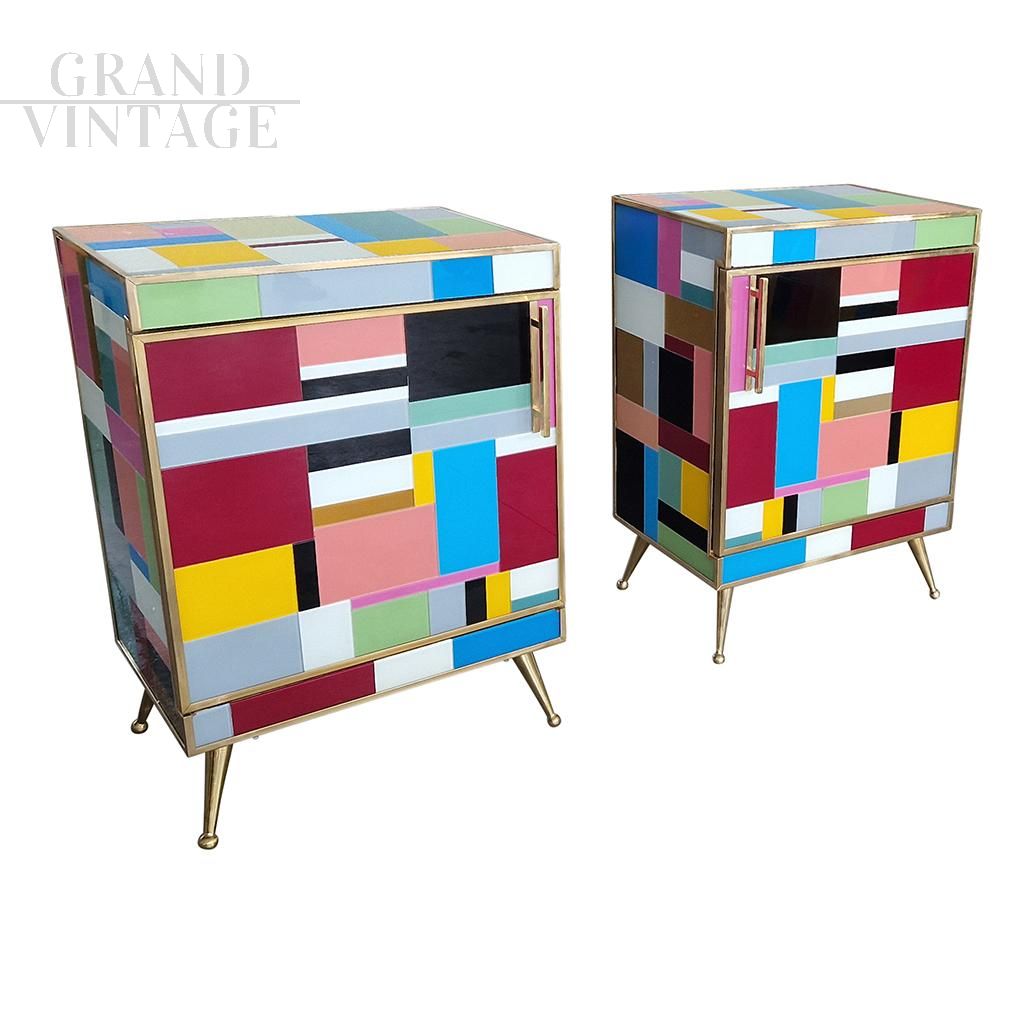 Coppia di comodini con un’anta, interamente realizzati a mano, con struttura in legno rivestita con vetro colorato, il comodino destro e sinistro sono complementari; profili, maniglie e piedi in ottone dorato. Ripiano interno in legno.