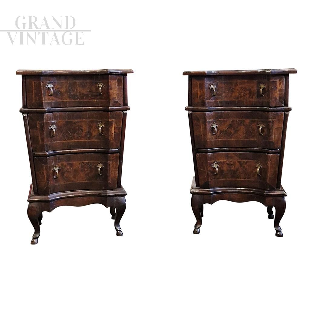 Coppia di comodini veneti antichi dell‘800 in noce e radica di noce.