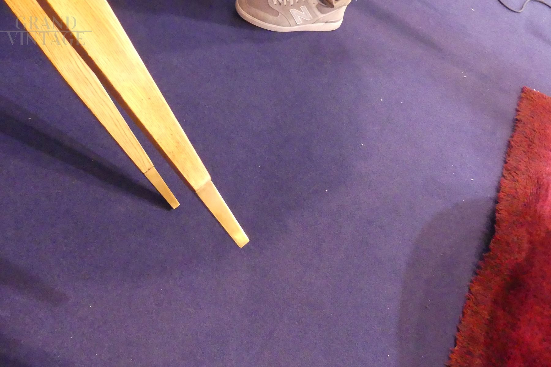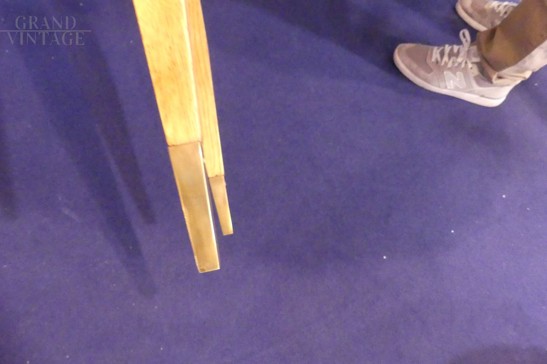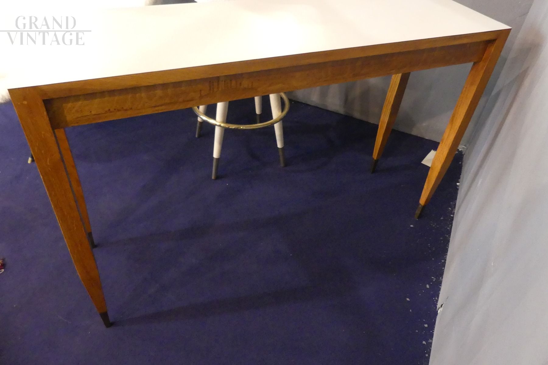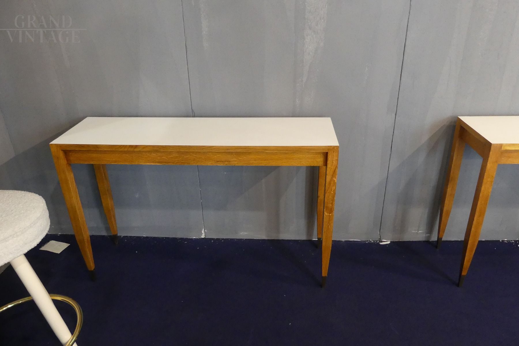 Coppia di bellissime consoles design di Gio Ponti in legno chiaro di noce con piano in formica e piedi in ottone.