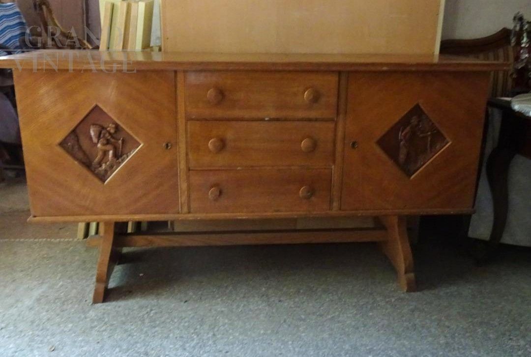 Coppia di credenze vintage coordinate in legno chiaro intagliate sulle ante laterali con bellissime scene di vita contadina, Italia anni '50. Una credenza ha tre cassetti centrali, l'altra ha un'anta centrale.