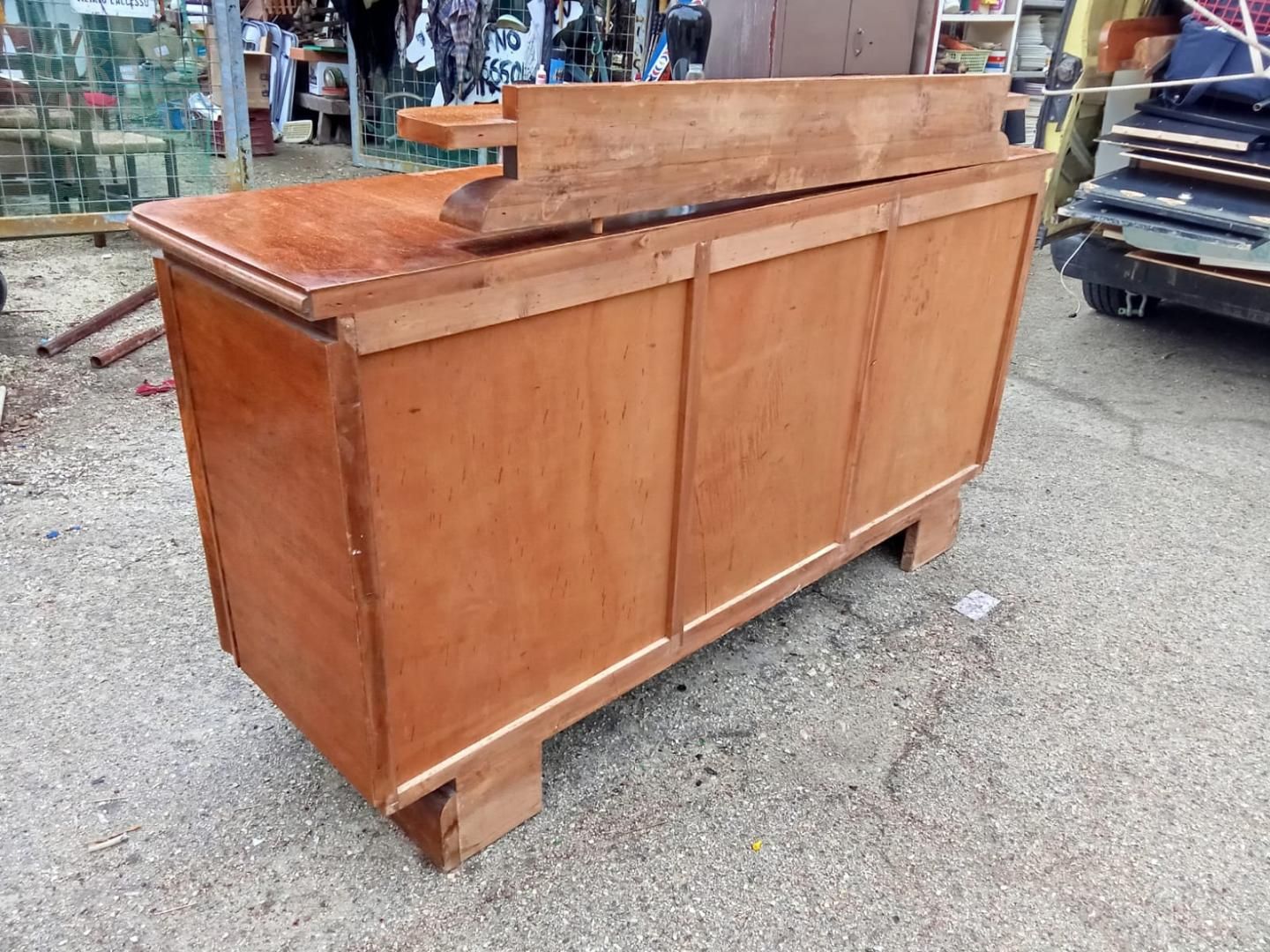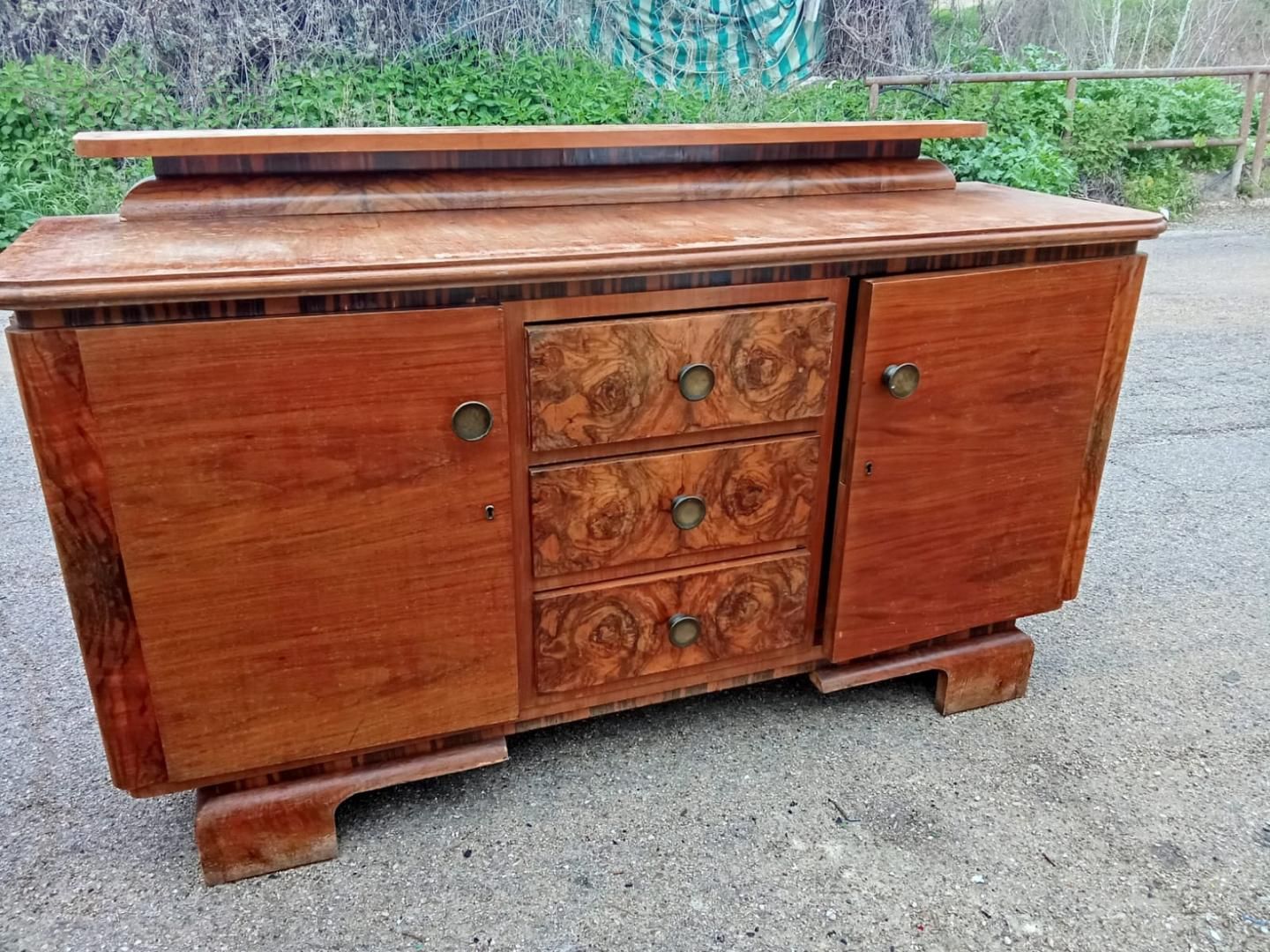 Meravigliosa e rarissima coppia di credenze Art Déco italiane degli anni '20 - '30, dal design di alta qualità, fatte completamente in legno massello, radica e piuma di noce. Sono composte da due sportelli laterali e cassetti centrali come da foto. Hanno laterali concavi in piuma di noce con filetto in radica più scura alla base e alla alzatina. Le maniglie in ottone sono originali così come le cerniere interne. Hanno bisogno soltanto di piccoli interventi di restauro e di lucidatura finale.