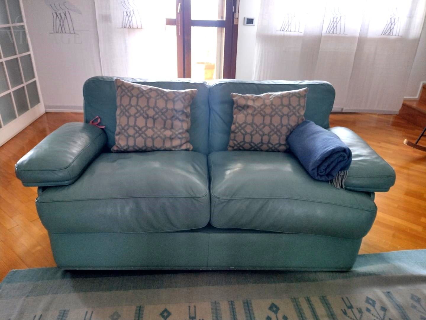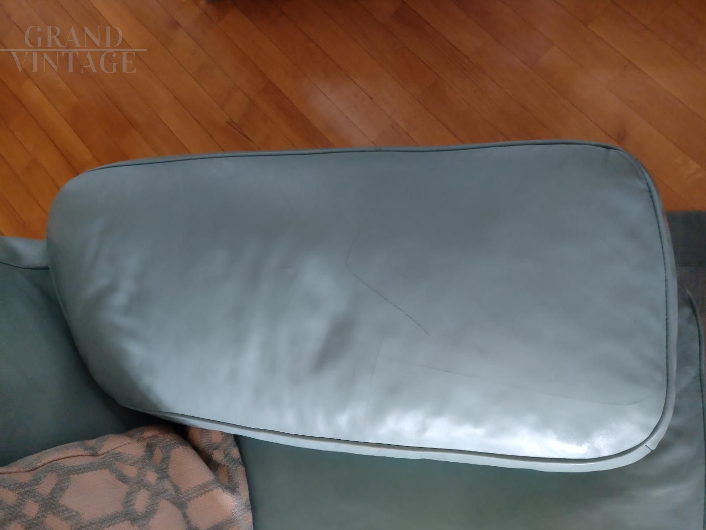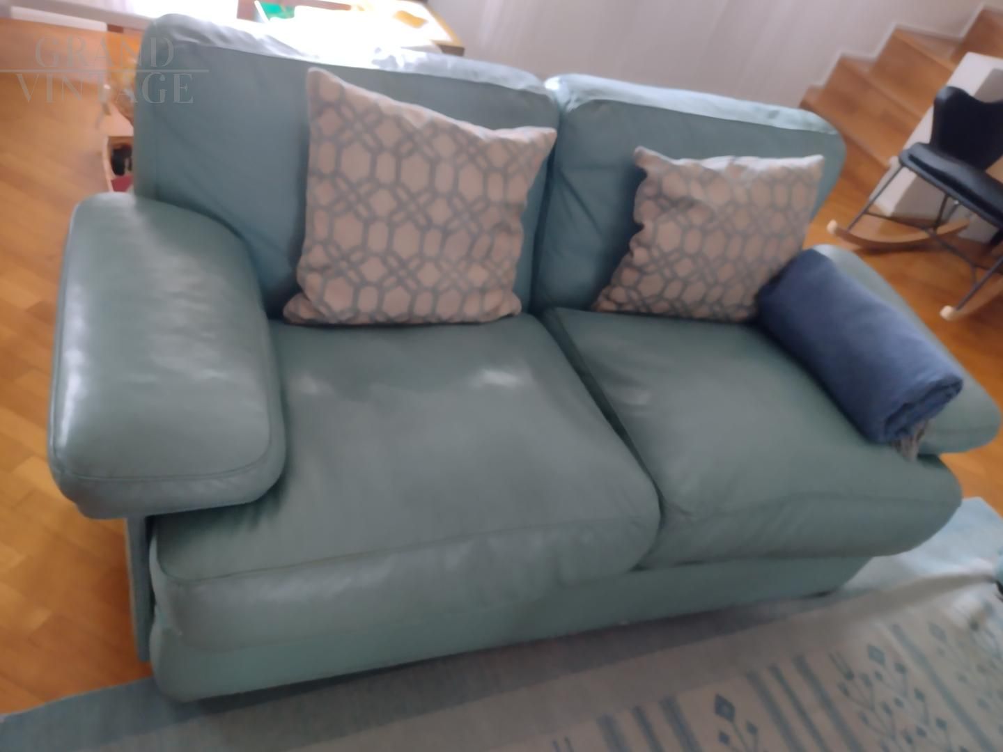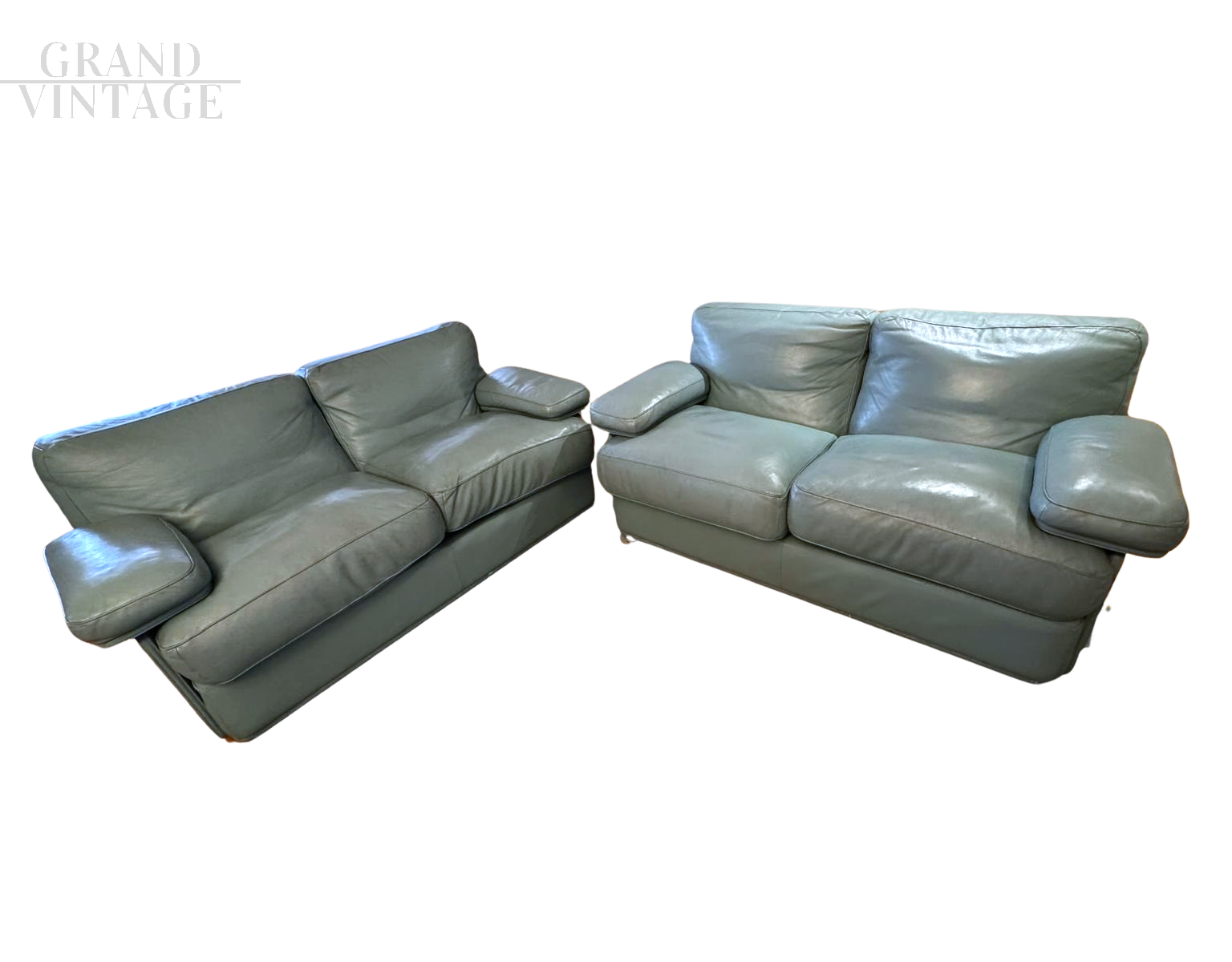 Coppia di divani a due sedute Poltrona Frau vintage in pelle di vitello color azzurro cielo, dell'inizio degli anni '80. In buone condizioni, a parte qualche segno su uno dei poggioli (come da foto).