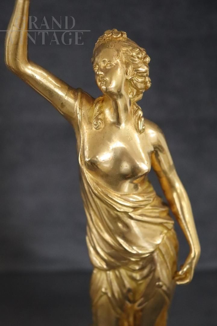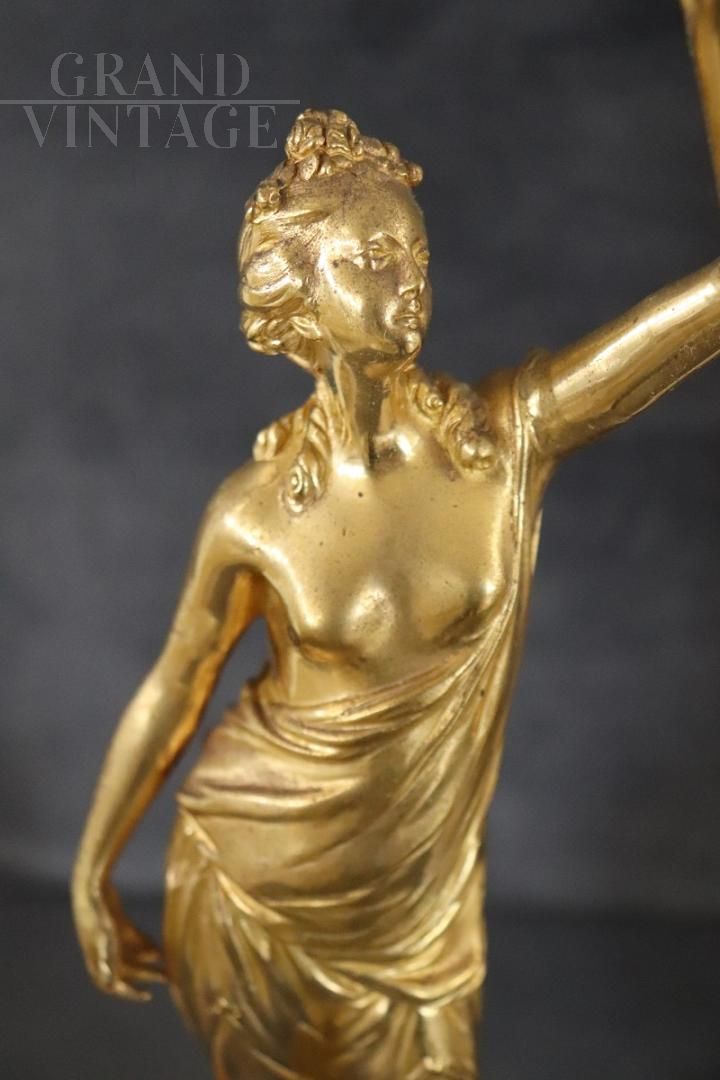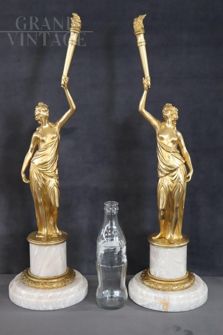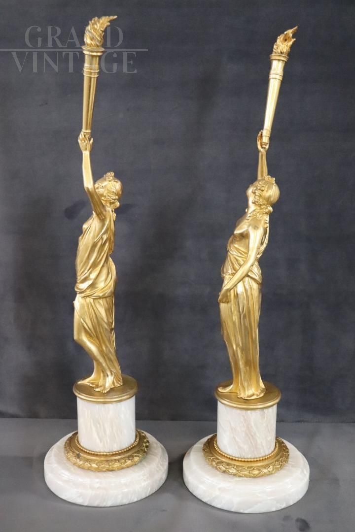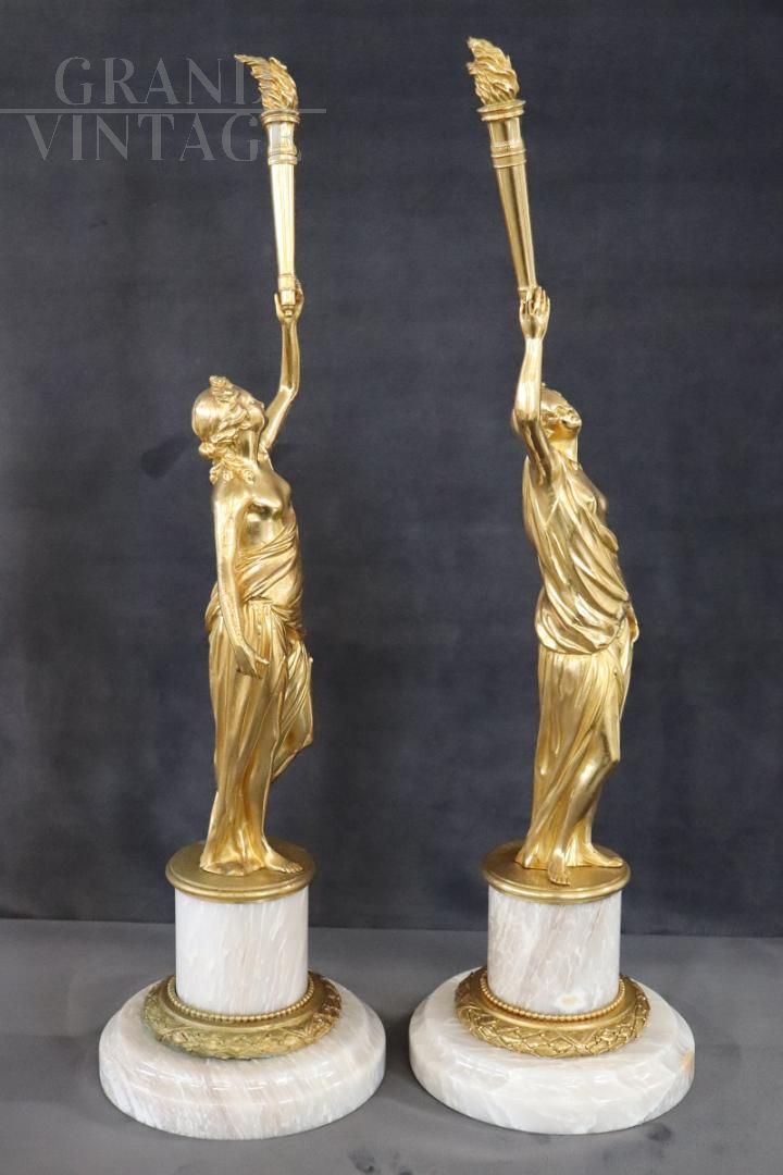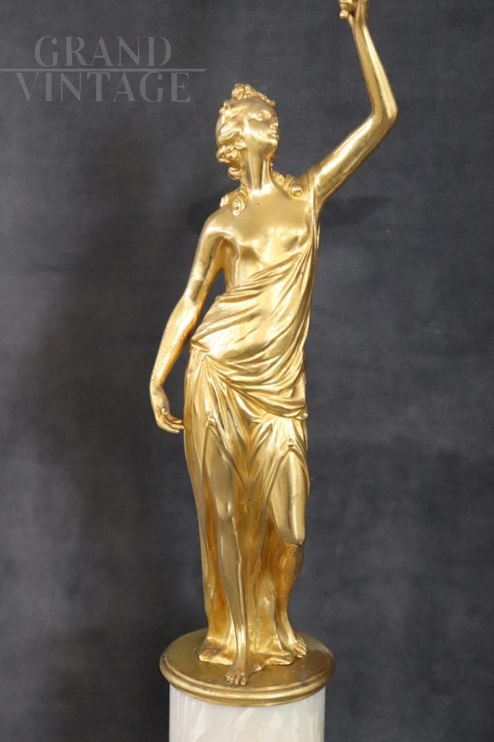 Splendida e raffinata coppia di sculture speculari in bronzo dorato della prima metà del XX secolo su base circolare in alabastro. Le sculture raffigurano due figure femminili di gusto classico, allegorie della libertà. Di grande raffinatezza e alta qualità artistica con una doratura eccellente. Ottime condizioni, prezzo trattabile.