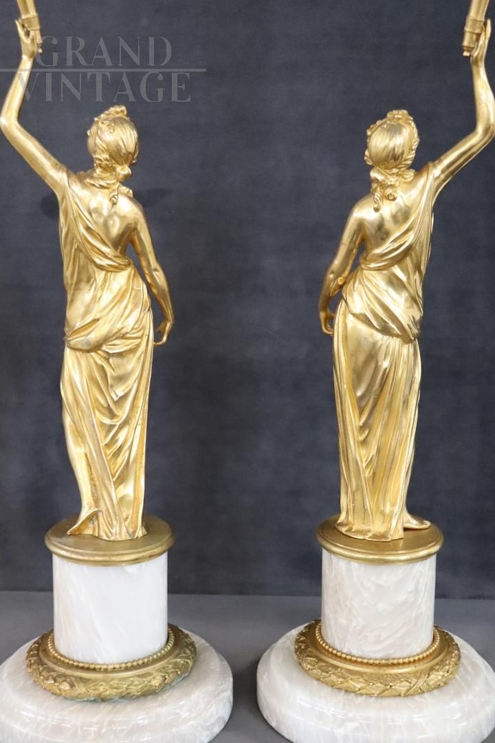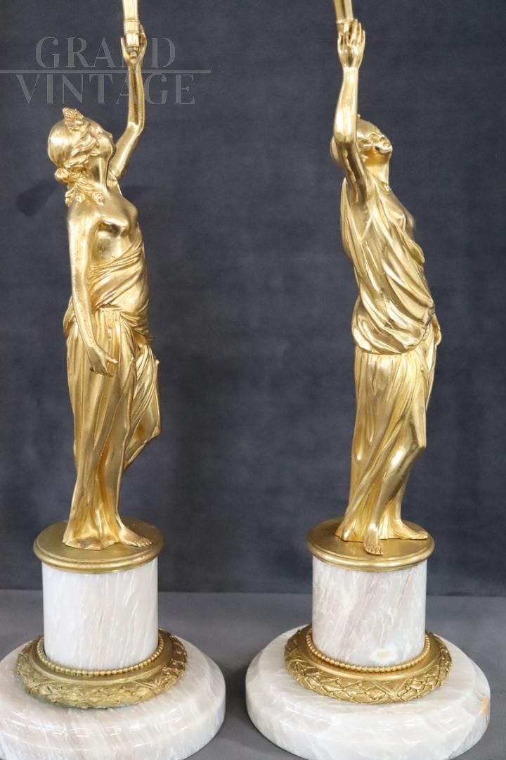 Coppia di figure femminili scultoree in bronzo dorato e alabastro