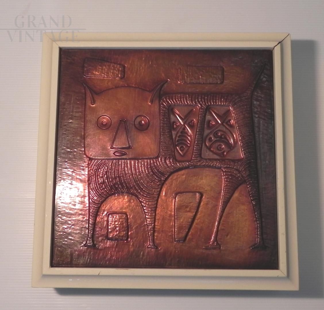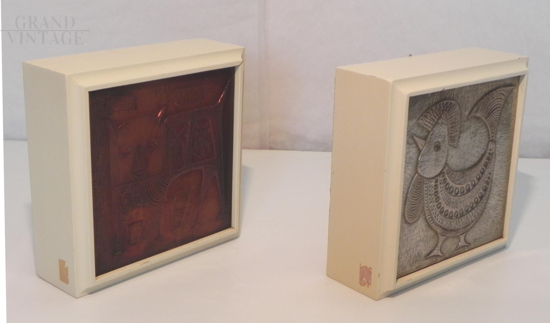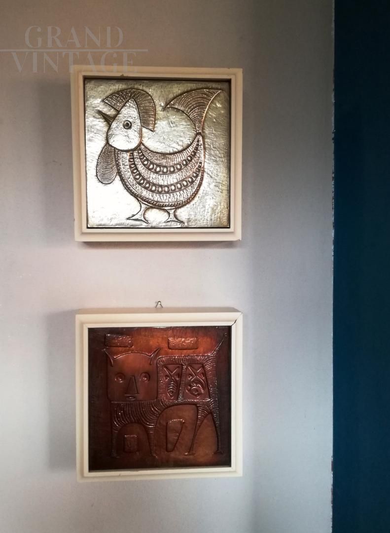 Coppia di formelle decorative anni '70 in ottone e rame a sbalzo raffiguranti in gallo e un gatto nello stile di Helmut Friedrich Schaffenacker, inserite nelle cornici originali scatolari in legno laccato, non presentano firma. Il decoro è realizzato per compressione su lamina in ottone e rame.