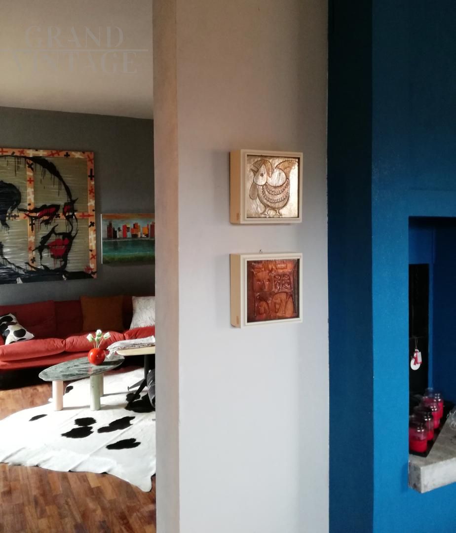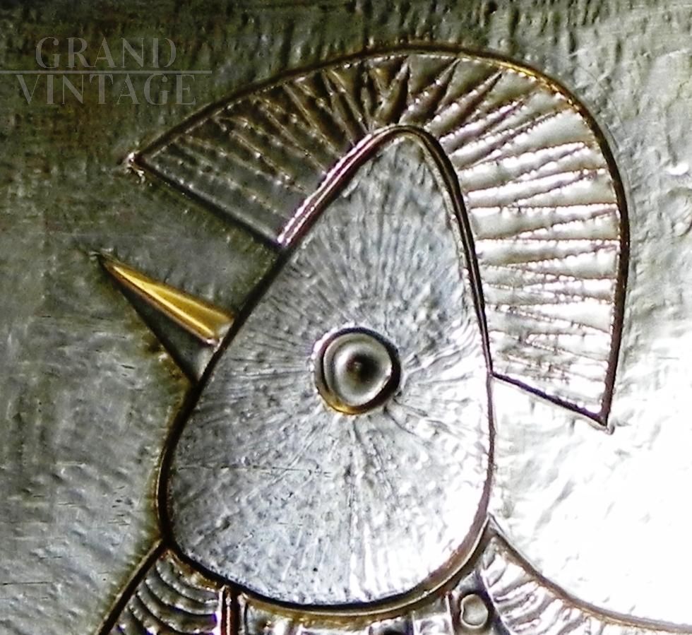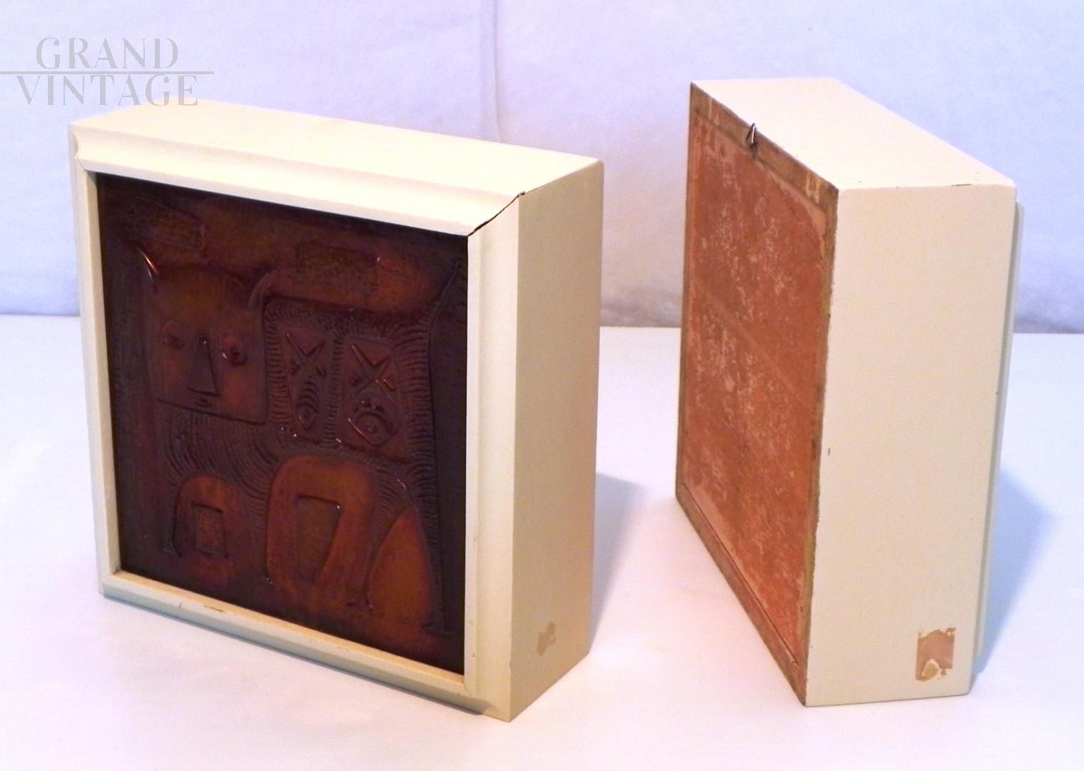 Coppia di formelle decorative anni '70 in ottone e rame a sbalzo raffiguranti in gallo e un gatto nello stile di Helmut Friedrich Schaffenacker, inserite nelle cornici originali scatolari in legno laccato, non presentano firma. Il decoro è realizzato per compressione su lamina in ottone e rame.