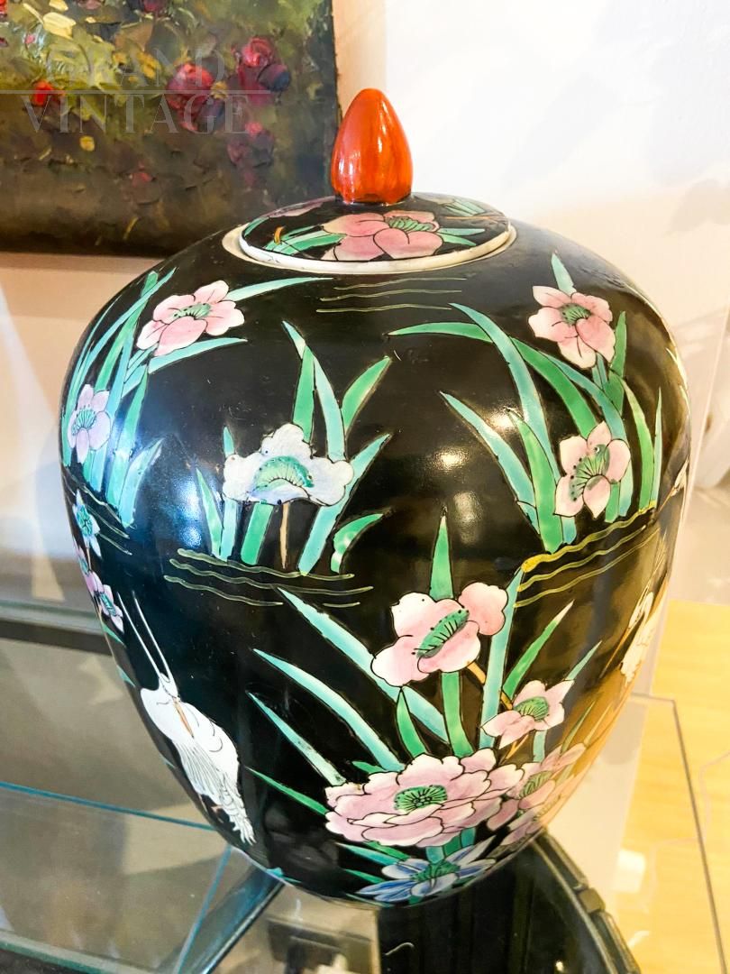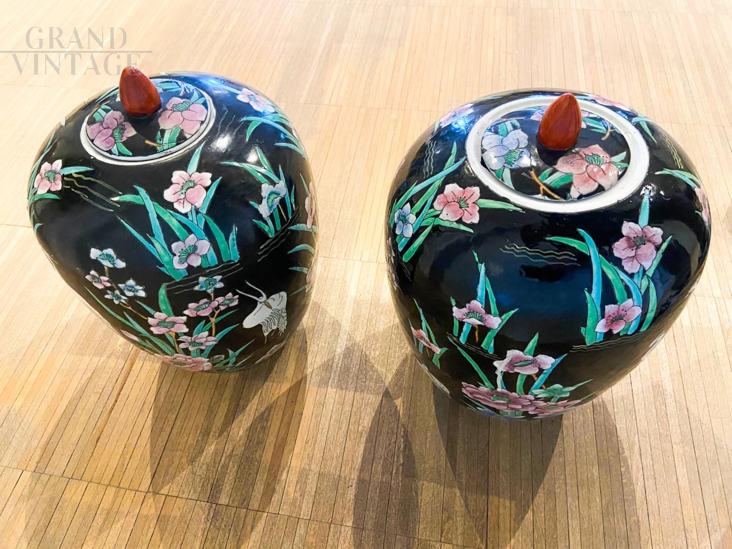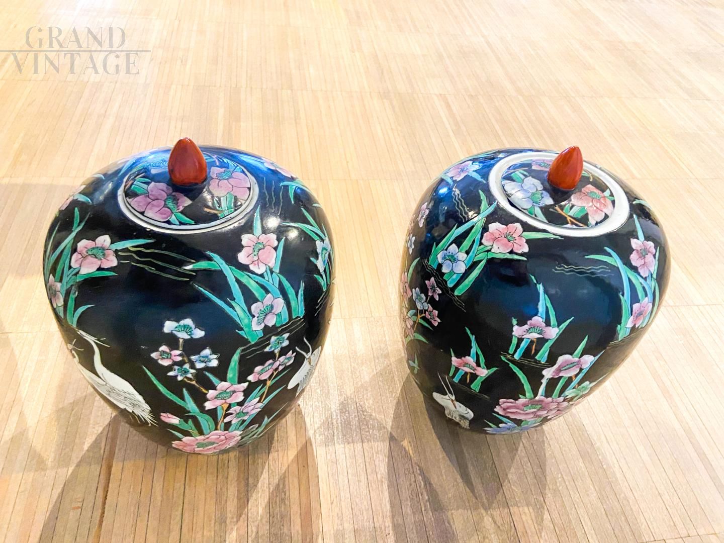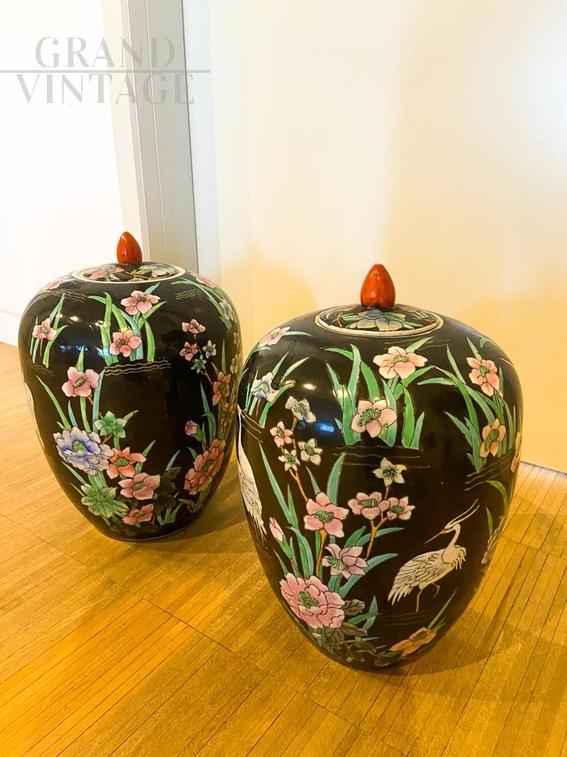 Coppia di grandi vasi potiches in porcellana cinese della prima metà del '900 con decorazione a smalti policromi con decori bucolici ed il Gru, simbolo di longevità, pace ed eleganza, sono animali di compagnia, delle Divinità Taostiche che insieme sorvolano tra le nuovole, più vicine al gusto occidentale. In ottimo stato di conservazione.
