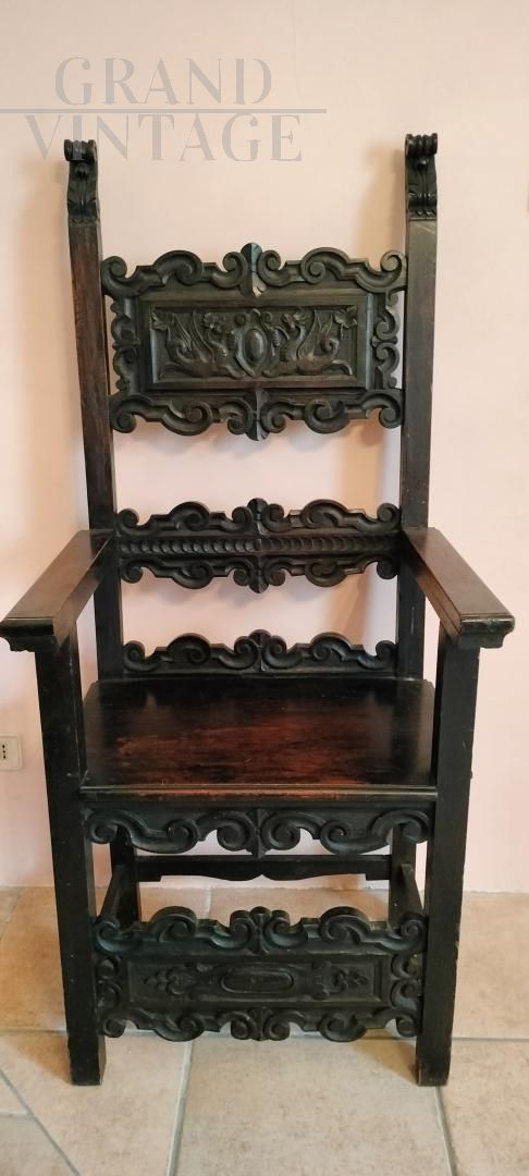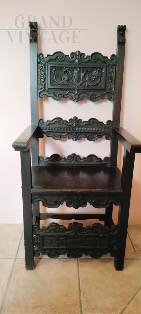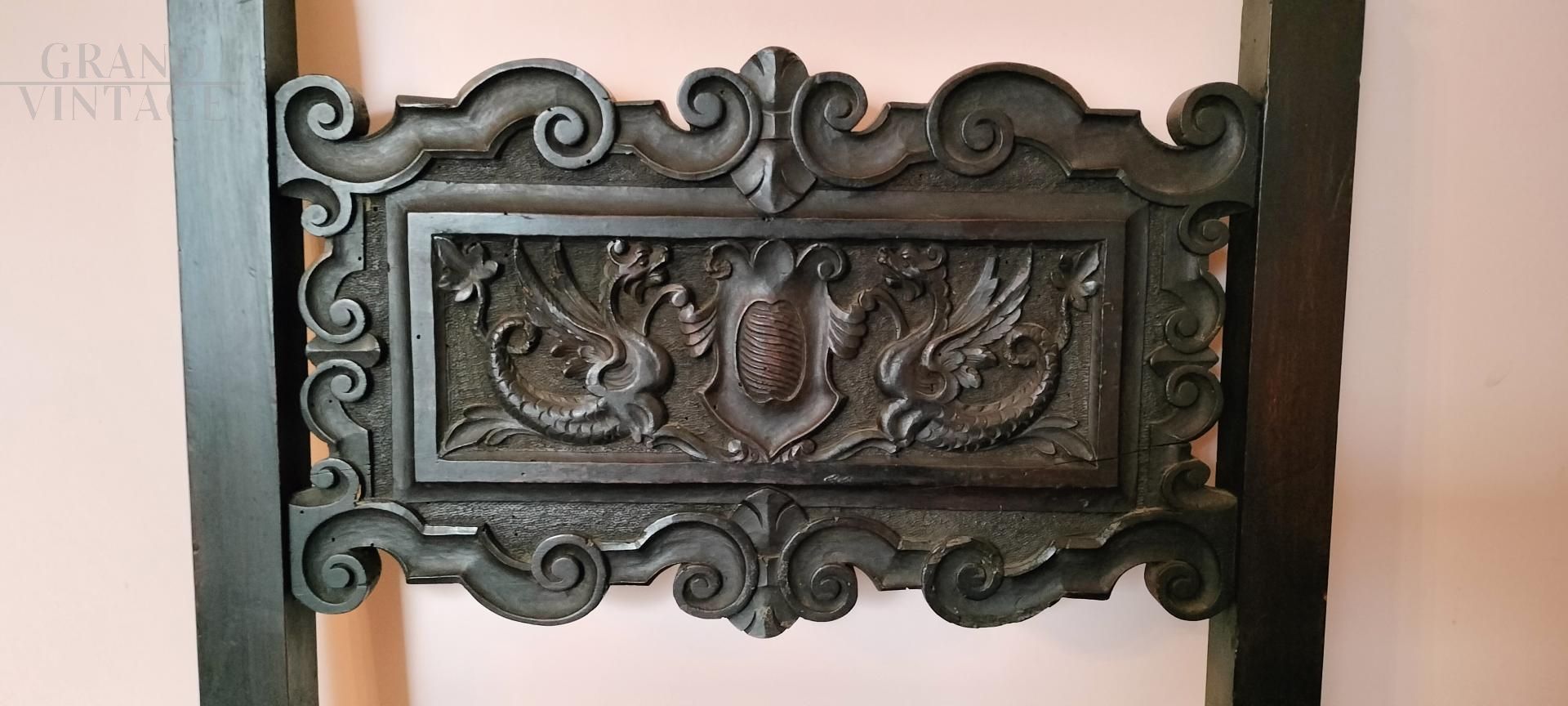 Coppia di grande sedie seggioloni antichi castellani finemente scolpiti a rilievo con disegni di draghi e ovale per stemma della casata di provenienza, epoca stimata primi '800, non restaurate, in condizioni originali molto buone.