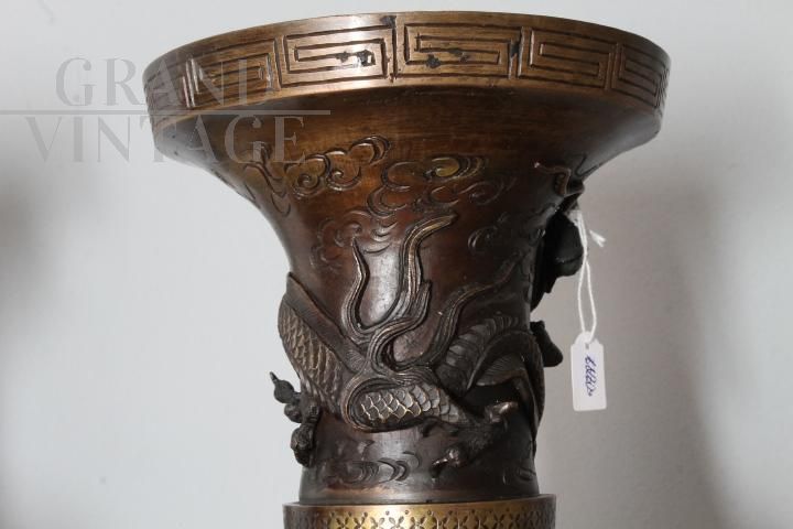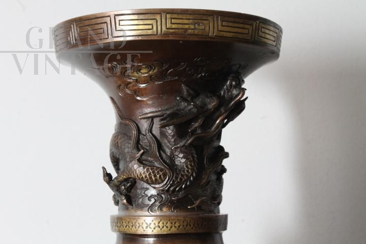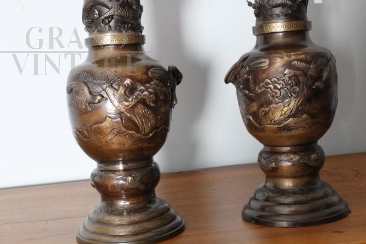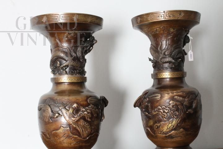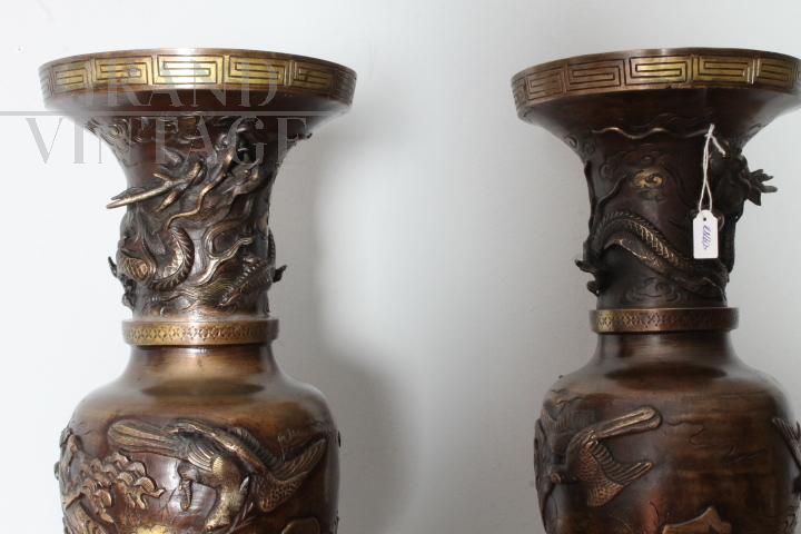 Splendida coppia di grandi vasi Giapponesi antichi del periodo Meiji di fine '800, realizzati in bronzo con lavorazione a rilievo con dragoni, in perfetto stato di conservazione con una bellissima patina. I vasi sono firmati! Altezza cm 45