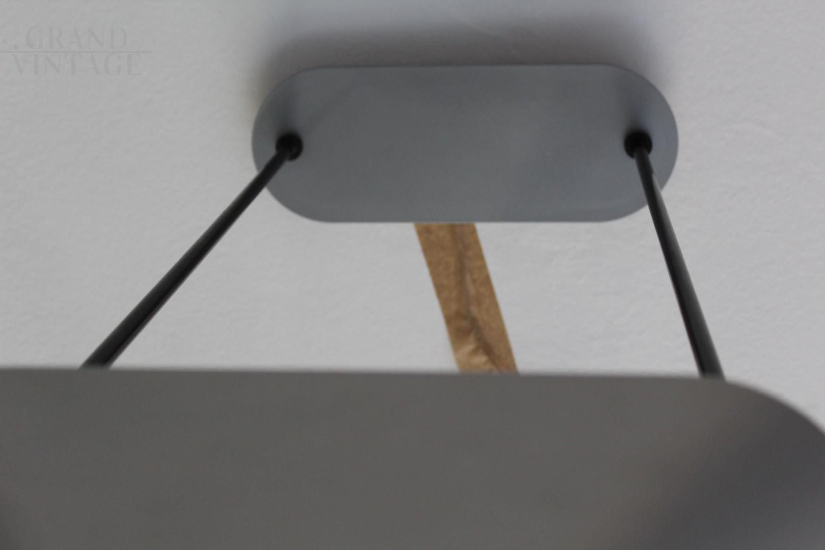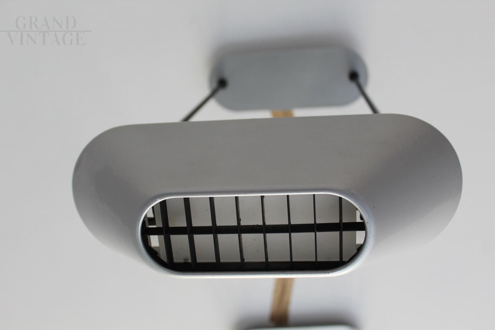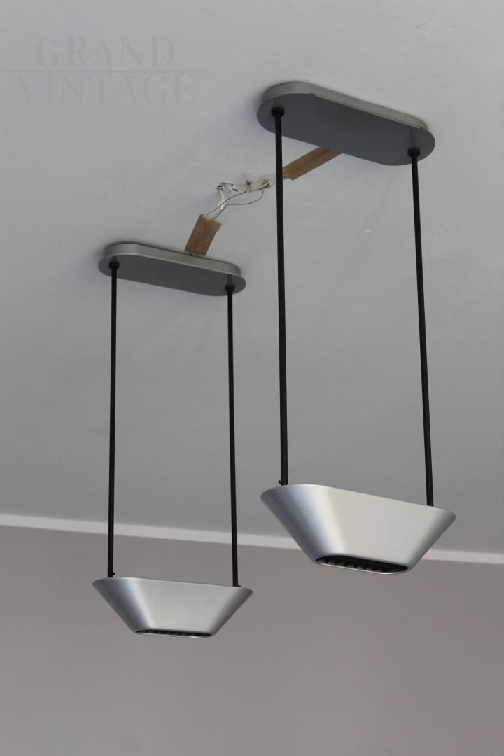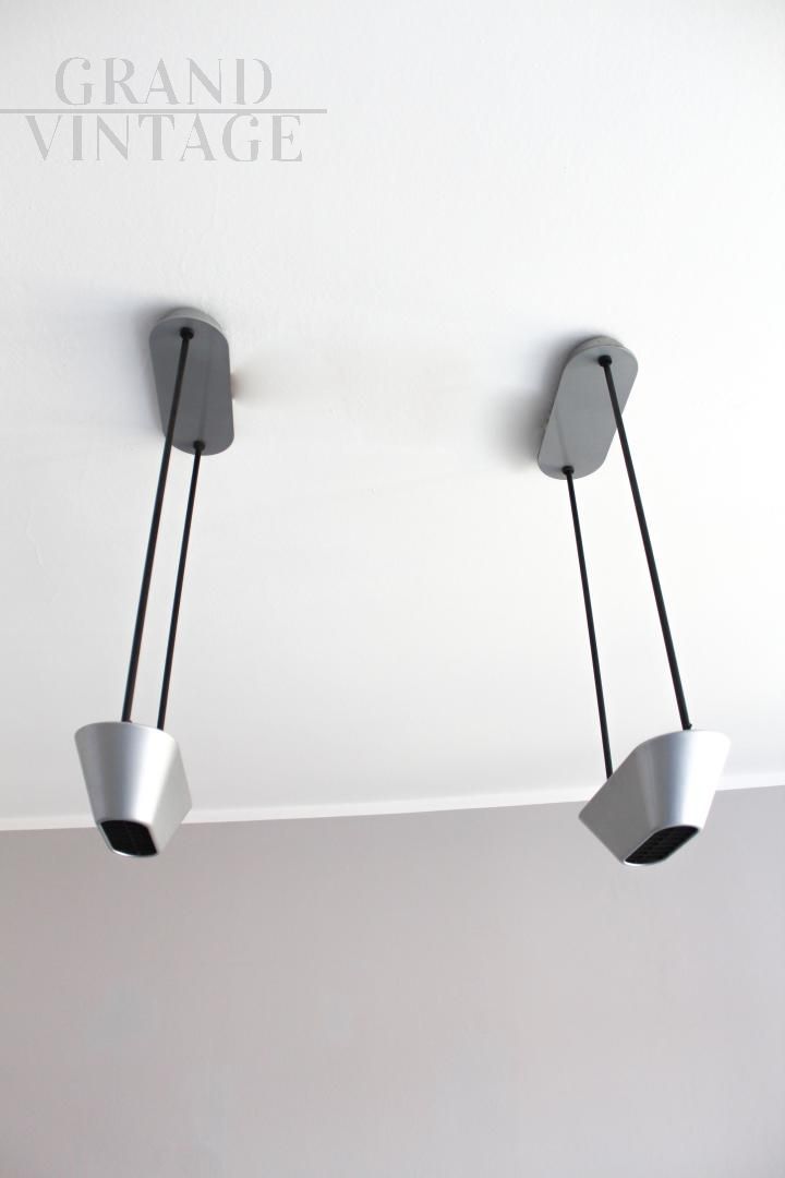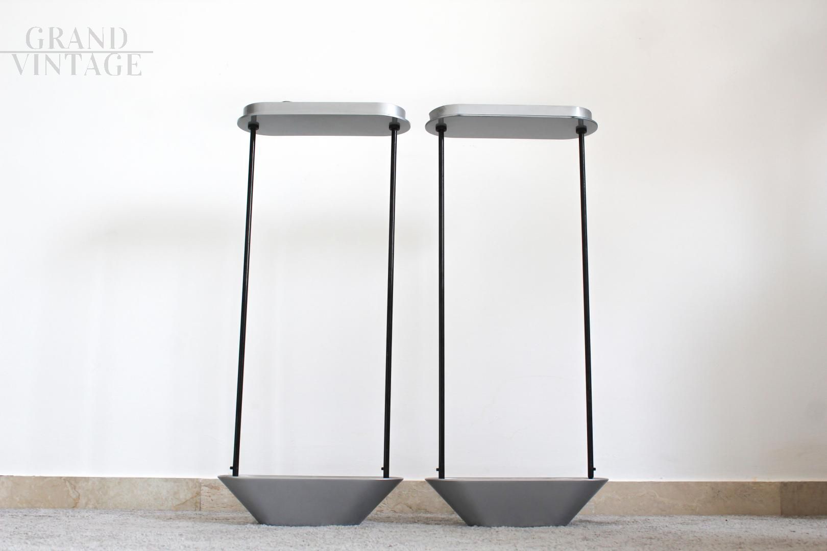 Coppia di lampadari Artemide modello Sidone, designer De Pas - D'urbino - Lomazzi, design italiano anni '80, con struttura in metallo laccato argento e steli regolabili in altezza.