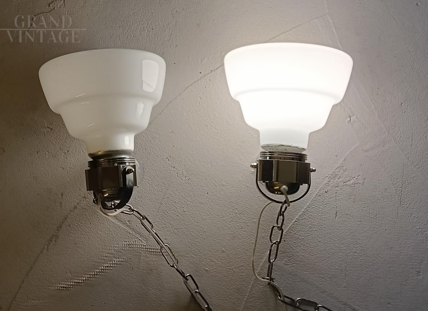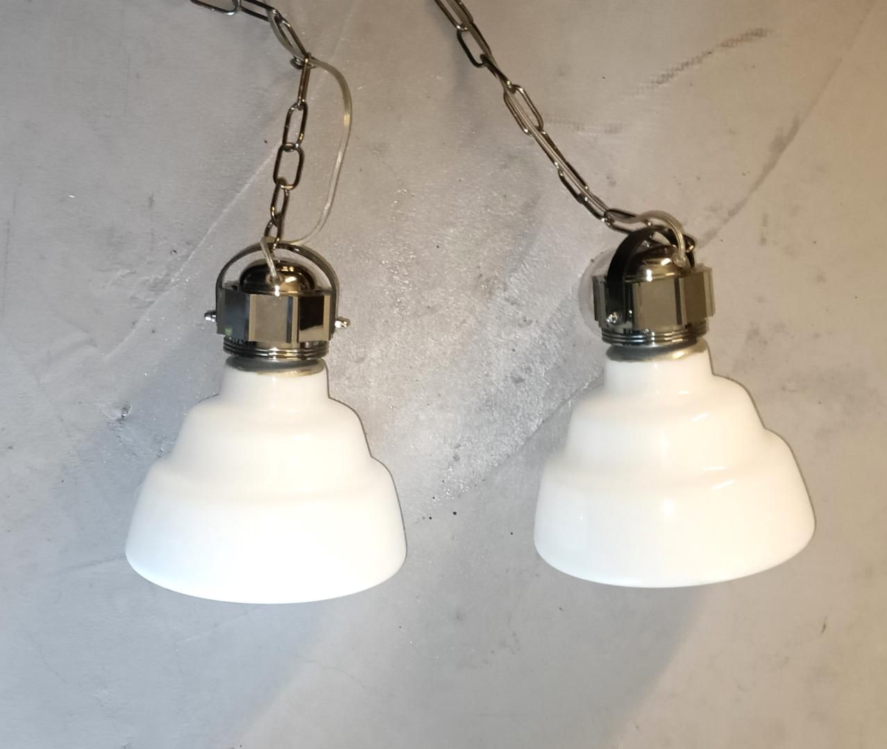 Coppia di lampade a sospensione Glass di Foscarini per Diesel, anni 2000, in vetro opalino. Le lampade furono progettate per i punti vendita Diesel (abbigliamento) e prodotte da Foscarini anni 2000. La catena è lunga cm 70, la lampada cm 28. Hanno un piccolo difetto di vernicatura sotto al portalampada cromato. (vedi foto)