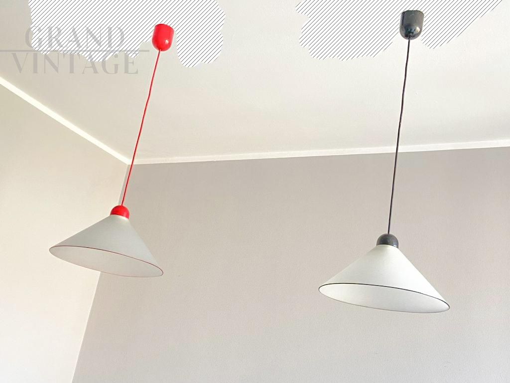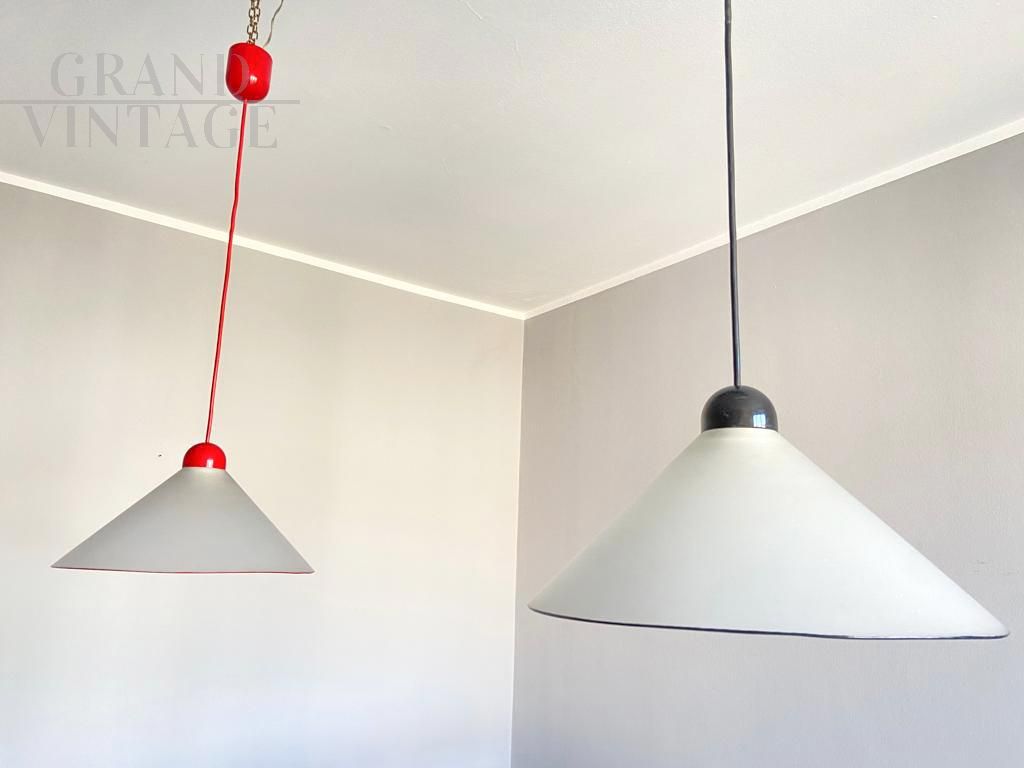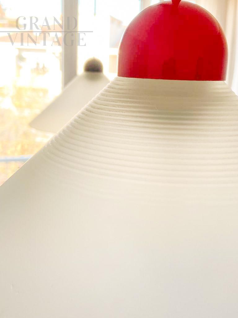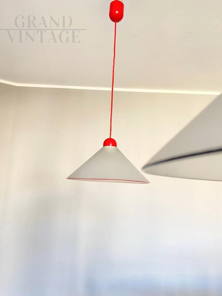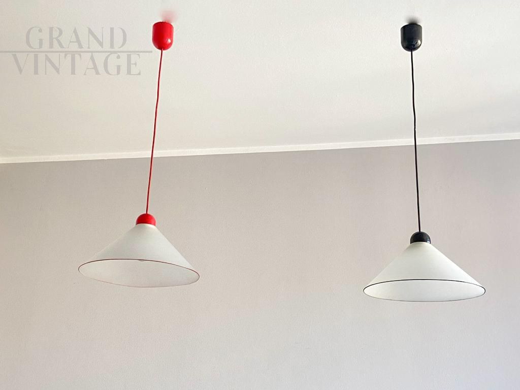 Coppia di lampade a sospensione modernariato Italiano anni '70 in vetro opalino con bordi colorati di rosso e di nero, molto scenografiche e iconiche, in ottimo stato di conservazione.