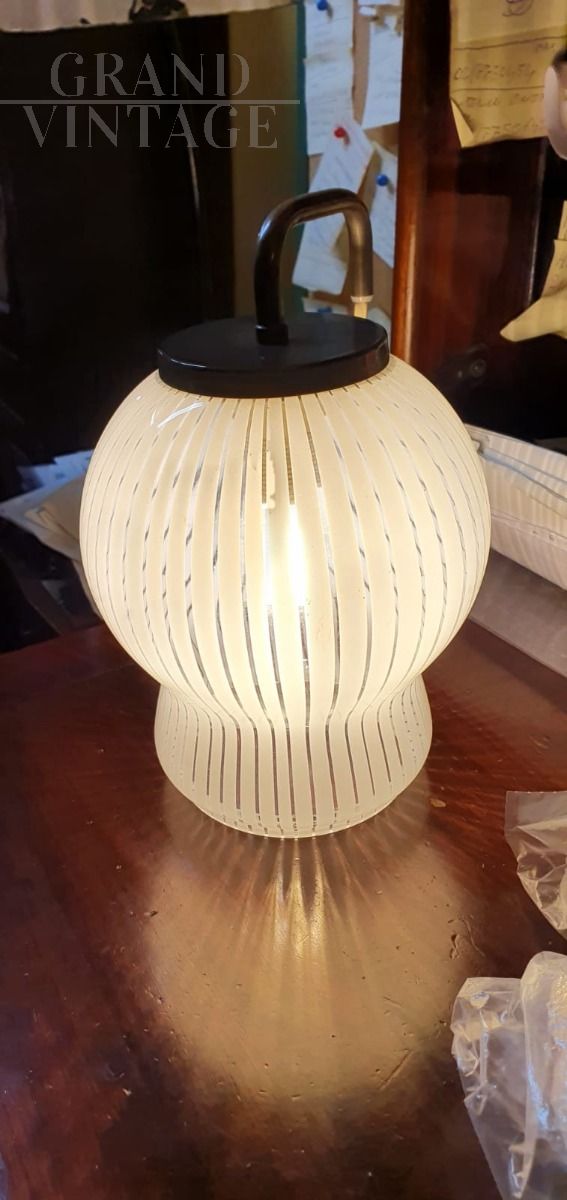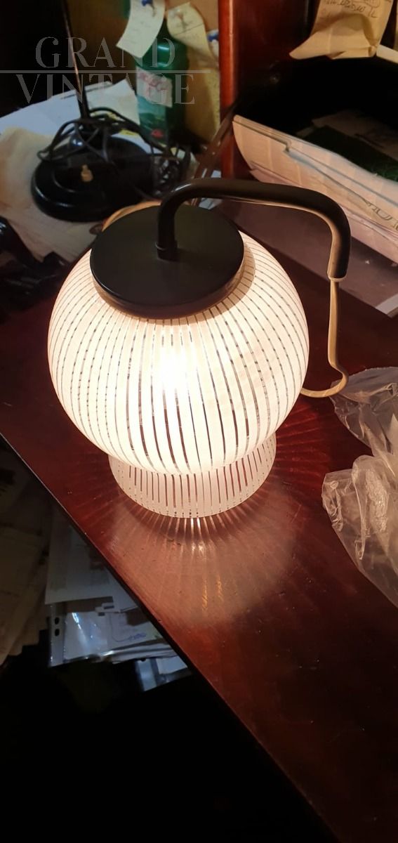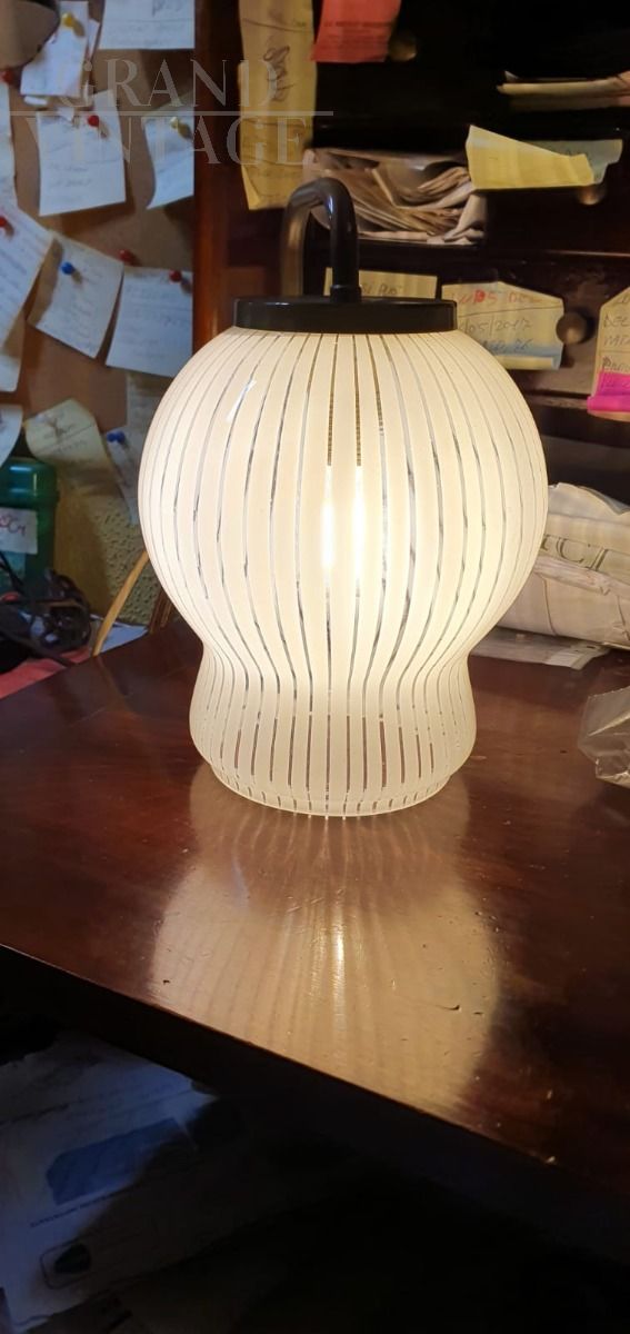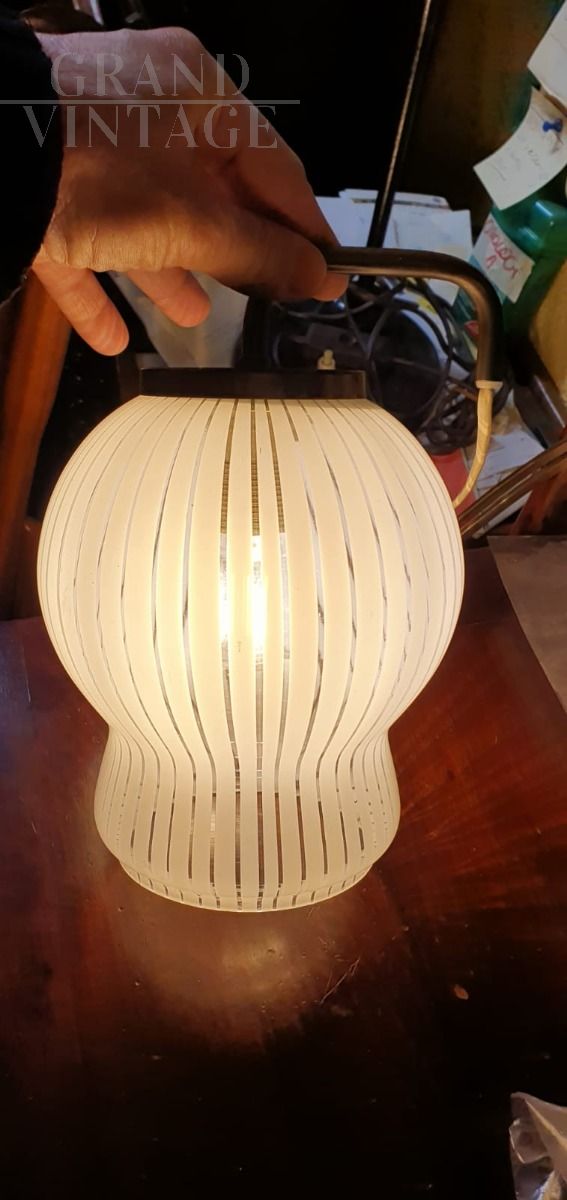Coppia di bellissime lampade abat-jour anni '70 in vetro trasparente rigato bianco con struttura in ottone, rara forma e fattura di qualità. Le lampade sono in ottime condizioni, nessun difetto visibile, l'ottone è mantenuto in patina ma è possibile lucidarlo e renderlo dorato, secondo i gusti.