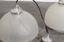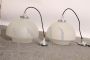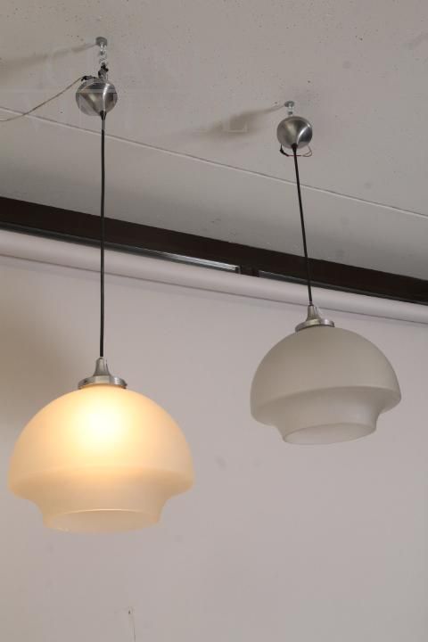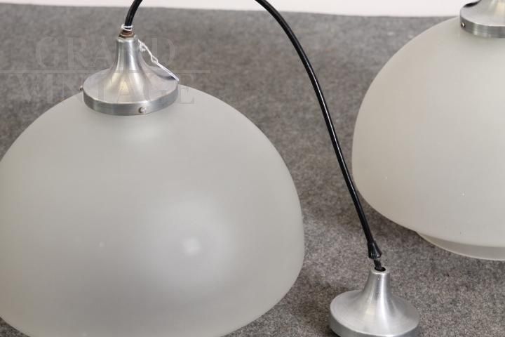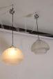 Coppia di Lampade da soffitto in vetro opaco satinato e acciaio. Design degli anni '70 produzione Italiana, restaurata e elettrificata. Funzionanti. Spedizione possibile in tutta Italia in sicurezza. Una delle due presenta lieve difetto dovuto al tempo (visibile in foto). Originali, pronte da appendere.