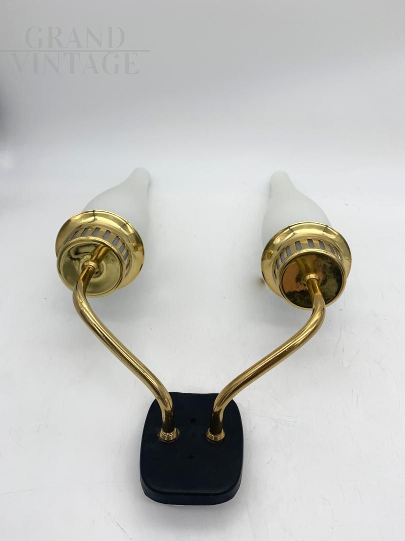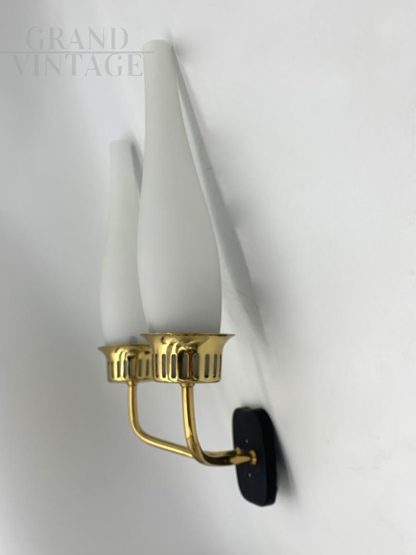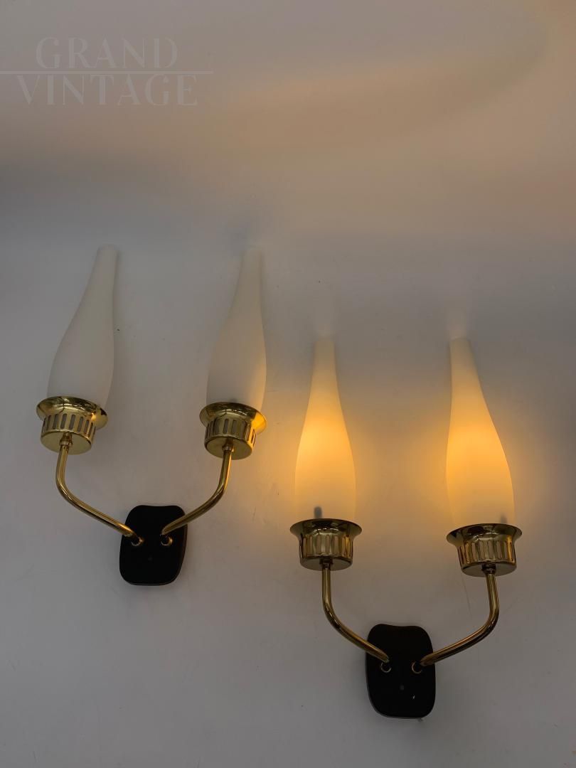 Coppia di appliques lampade da parete attribuite a Stilnovo molto particolari, ciascuna con due punti luce in vetro bianco latte su struttura in ottone e ferro. Le applique sono in ottime condizioni, con pochi naturali segni del tempo e con vetri non crepati, e ciascuna ha impianto elettrico rifatto a nuovo con 2 attacchi per lampadine di tipo E14. Le parti in vetro possono essere rimosse dalla struttura per un trasporto più sicuro. Su richiestale lampade si possono preparare per l'impianto elettrico Americano.