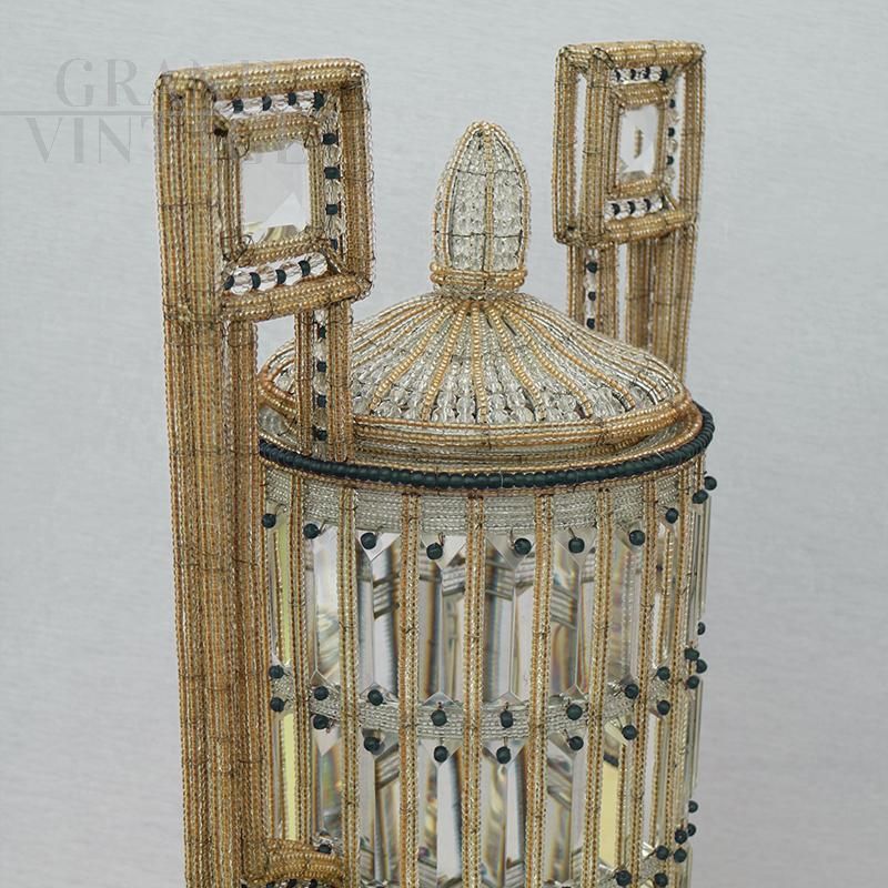 Bellissima coppia di lampade da tavolo in stile Art Déco con struttura dorata rivestita in perle di vetro e vetri sfaccettati che proiettano dei meravigliosi giochi di luce. La coppia di lampade in stile Art Déco è caratterizzata da uno schermo cilindrico con piedistallo rotondo e manici a forma di meandro, nonché da una copertura a specchio con un fiocco alto. Simmetricamente disposto con perle in vetro trasparente e blu e con pannelli in vetro sfaccettato. Elettrificate e funzionanti.