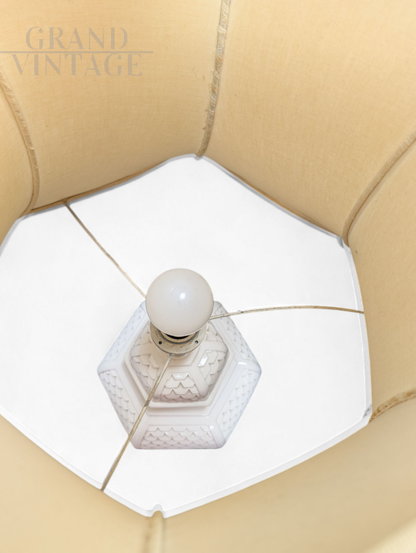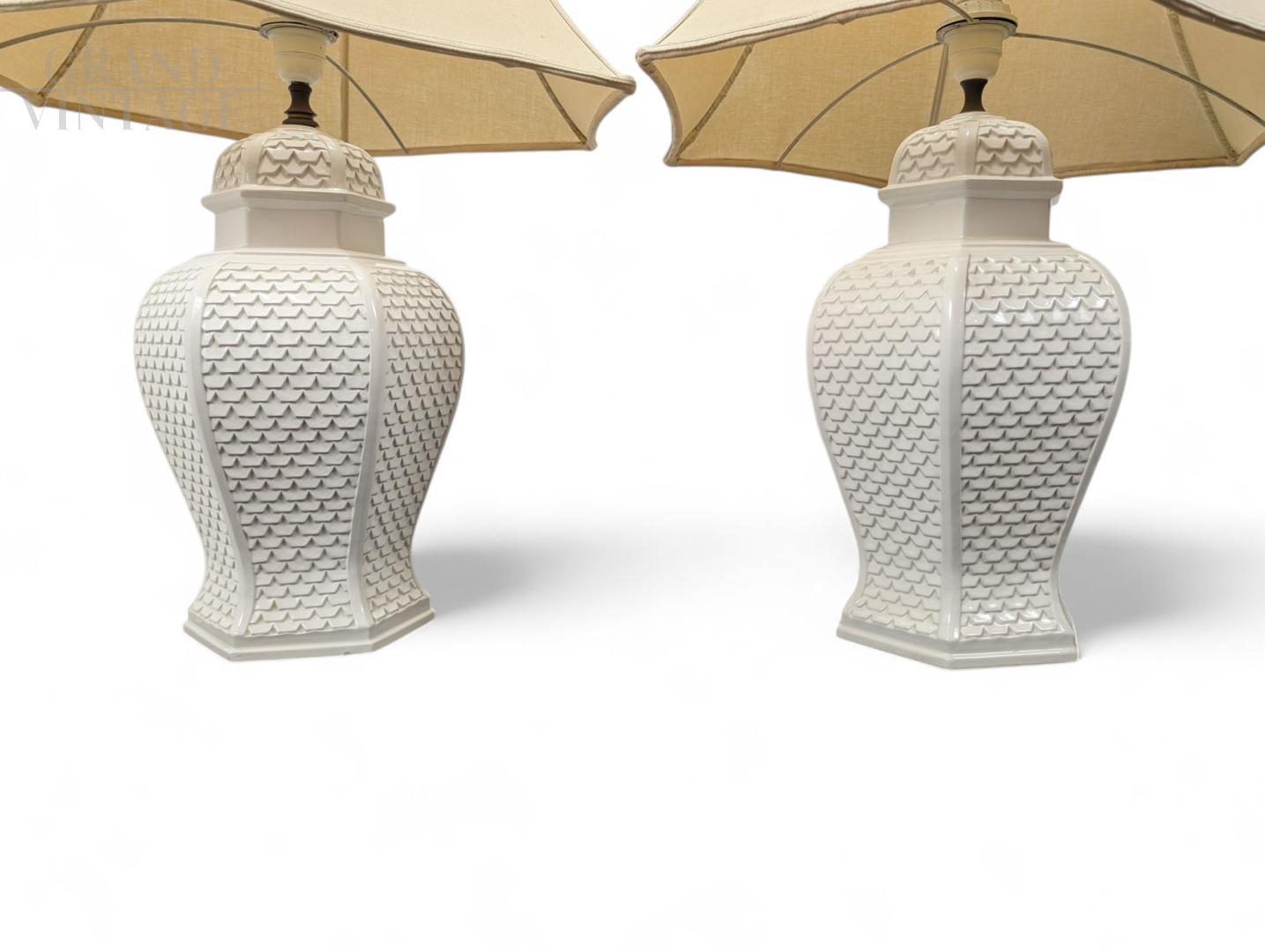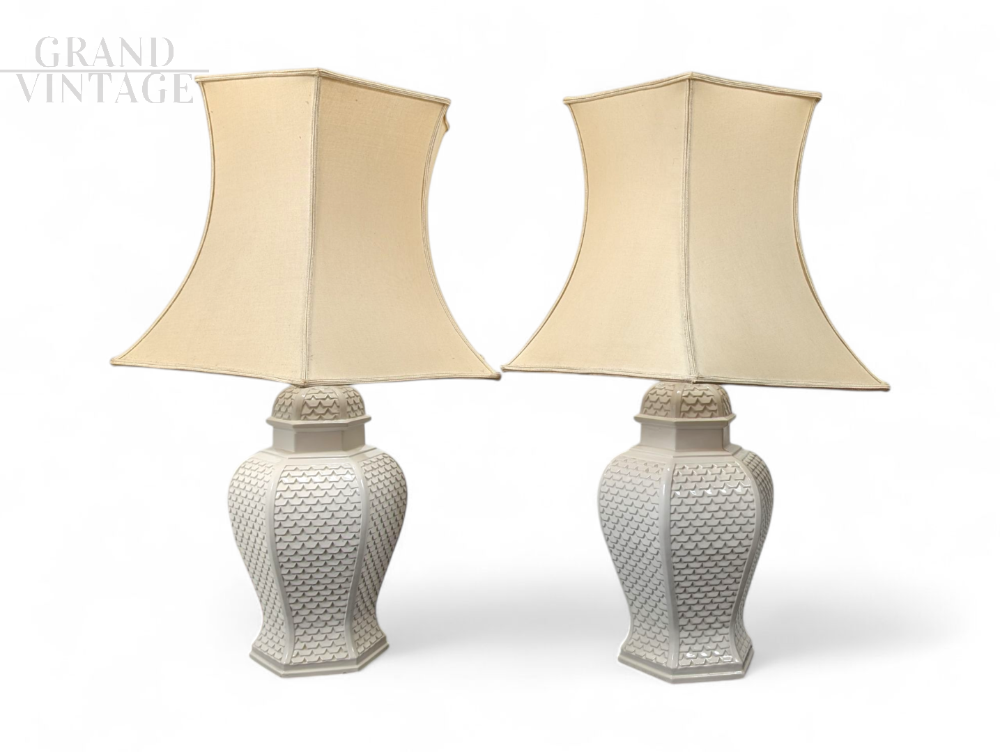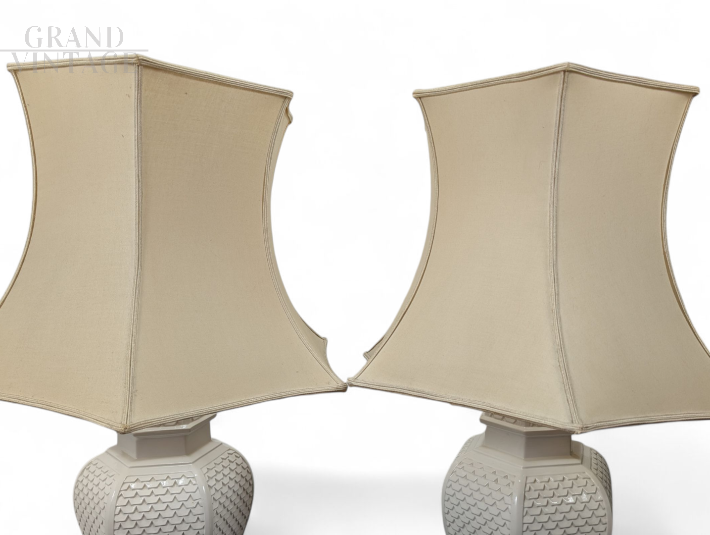 Elegante coppia di lampade da tavolo abat-jour realizzate in porcellana smaltata bianca finemente lavorata, prodotte in Italia negli anni '60. La superficie è decorata con un raffinato motivo a rilievo "a squame", che dona profondità e texture al design. Le basi esagonali e slanciate conferiscono un’eleganza classica, mentre i paralumi in tessuto beige, dalla forma svasata e curvilinea, completano l’insieme con un tocco caldo e sofisticato. Un perfetto equilibrio tra tradizione artigianale italiana e design decorativo mid-century. Ideali per ambienti living, camere da letto o ingressi ricercati. dimensioni 80 x 56 cm (altezza, diametro) SKU 415127