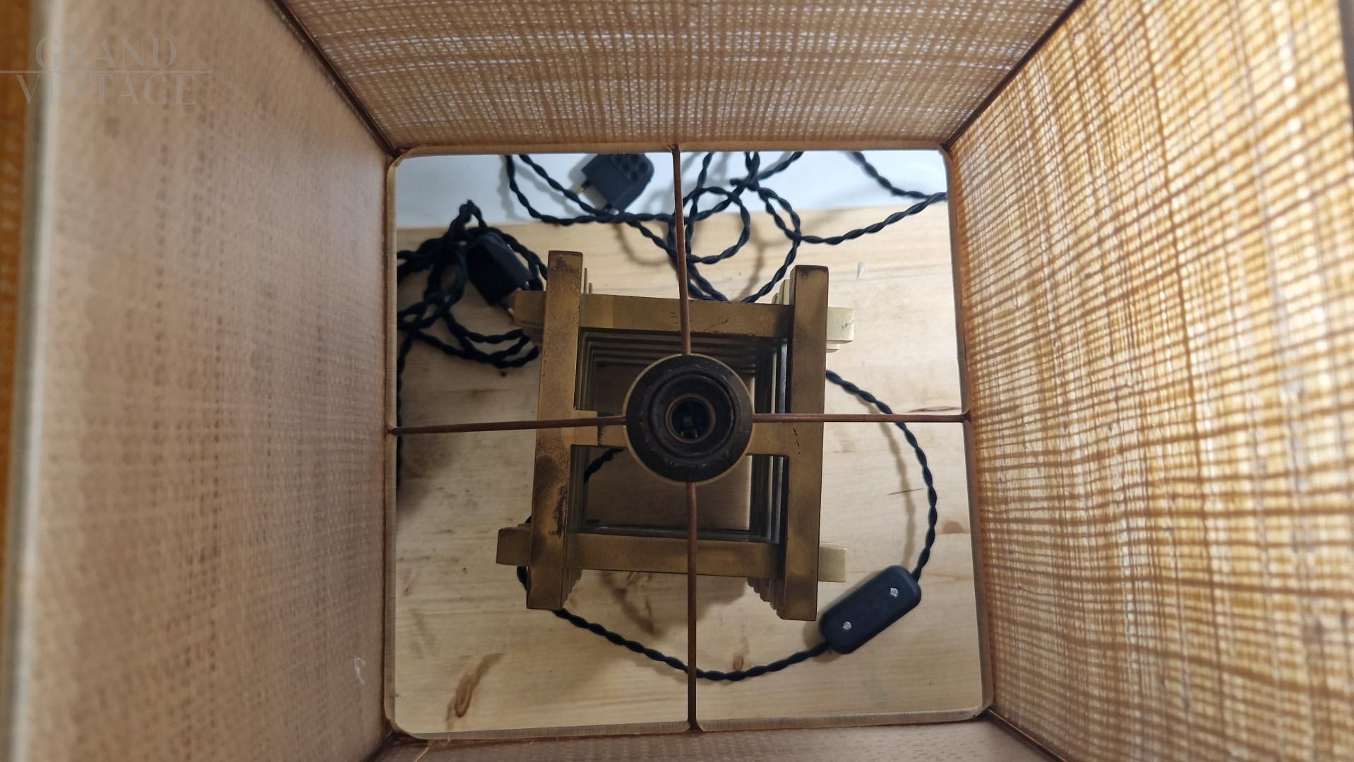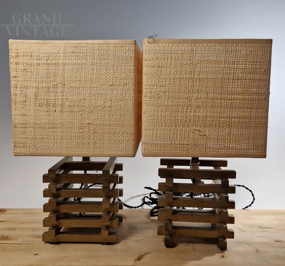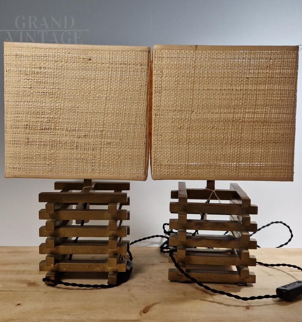 Coppia di lampade da tavolo moderniste in ottone e rattan