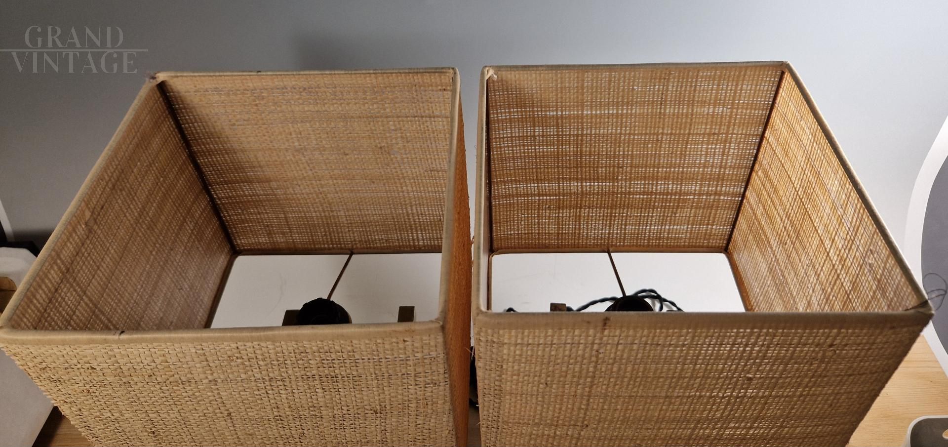 Coppia di lampade da tavolo design moderniste in ottone patinato con paralume in rattan intrecciato.