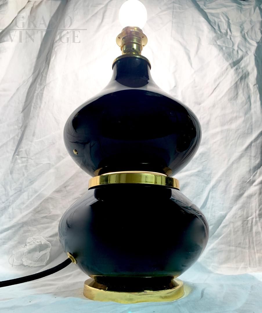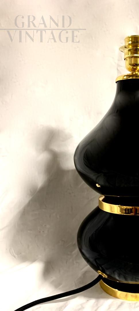 Fantastica e rara coppia di lampade da tavolo attribuibili a Seguso anni '70 in vetro di Murano trasparente color viola scuro-nero, con dettagli dorati, perfette per illuminare un arredamento in stile Hollywood Regency. in buone condizioni, originali made in Italy, hanno pochi segno del tempo, i vetri sono intatti e non crepati. Impianto elettrico originale e funzionante, con attacco per lampadina di tipo E27, adatto anche all'utilizzo di le lampade al led. Ci sono anche le lampadine all'interno del vetro, diffondono una luce tenue a causa del vetro molto scuro, ma al contempo d'atmosfera. Le lampade sono adatte ad accogliere un paralume sulla cima, che non è compreso.