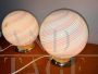 Coppia di lampade a sfera Swirl in vetro di Murano artistico con vortice di colore rosa e bianco, la base è in ottone dorato, complete di bollino.
