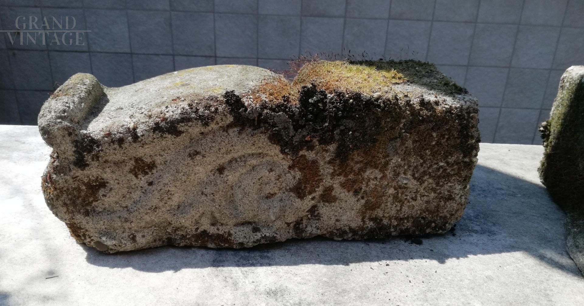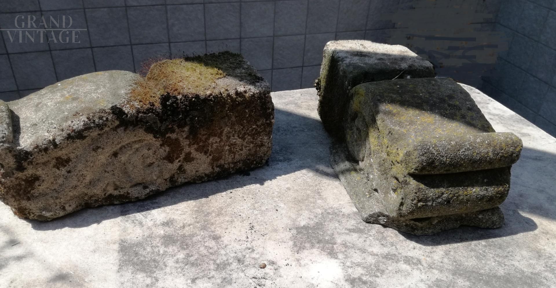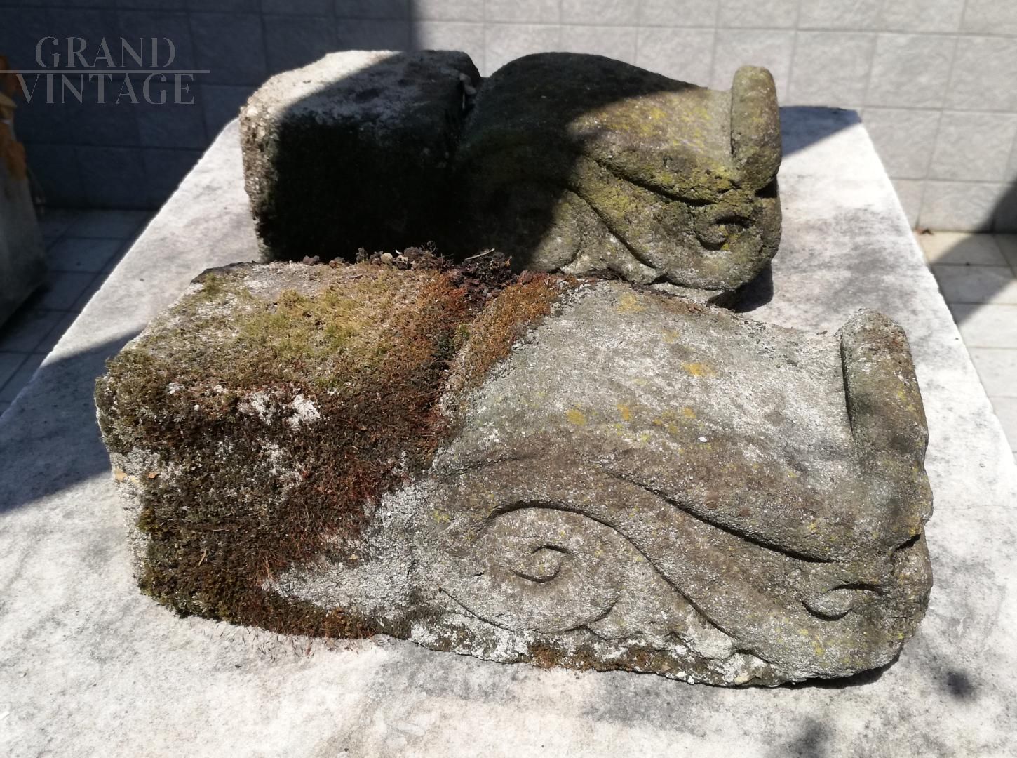 Coppia di mensole di sostegno in pietra in stile gotico. Queste mensole venivano utilizzate per il sostegno di sporti, davanzali, ballatoi, balconi, camini, fontane... negli edifici gotici e rinascimentali. La condizione è buona, non ci sono crepe e/o rotture. Possono essere riutilizzate allo scopo originario, ma presentano muschio ed incrostazioni.