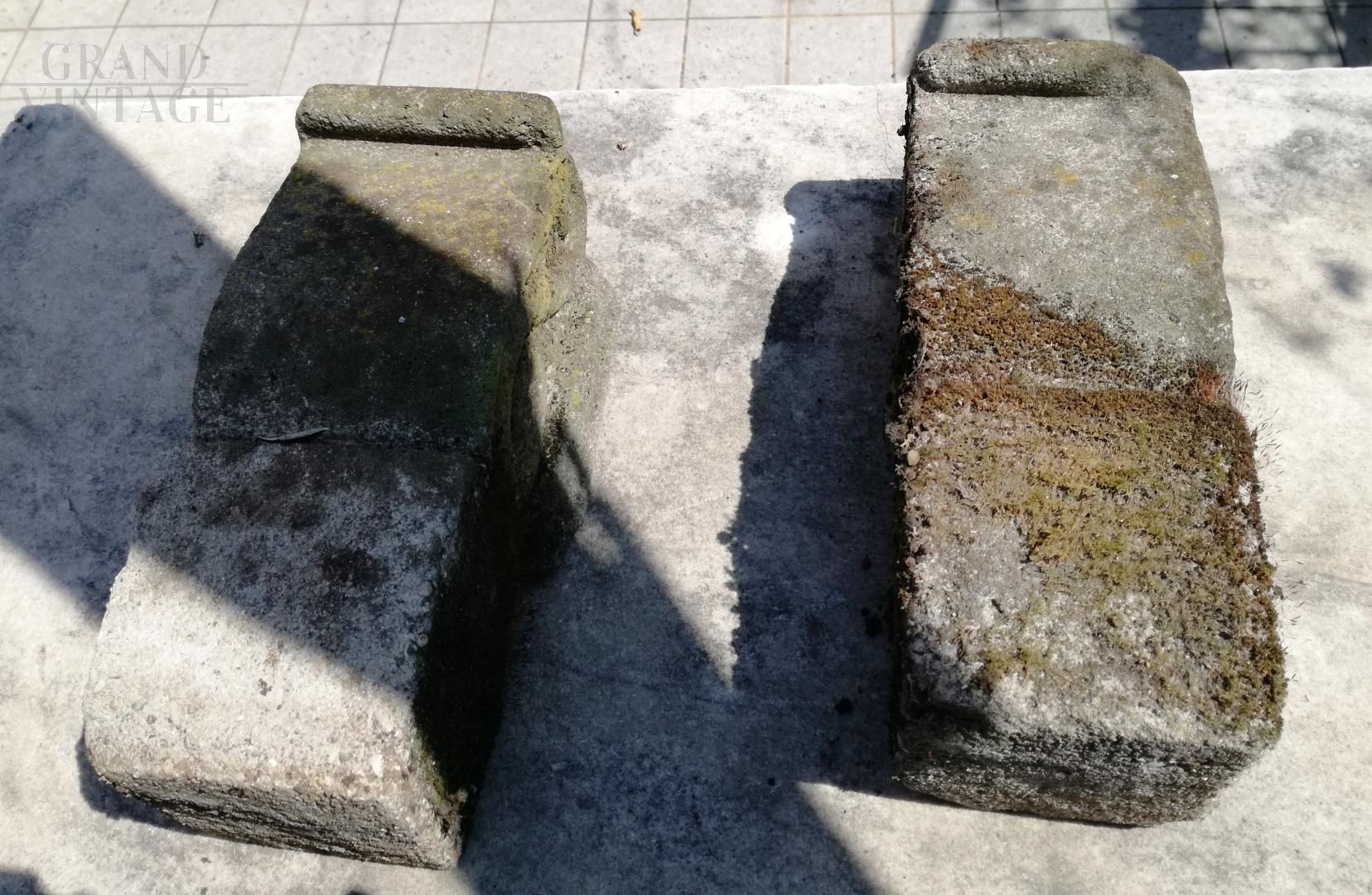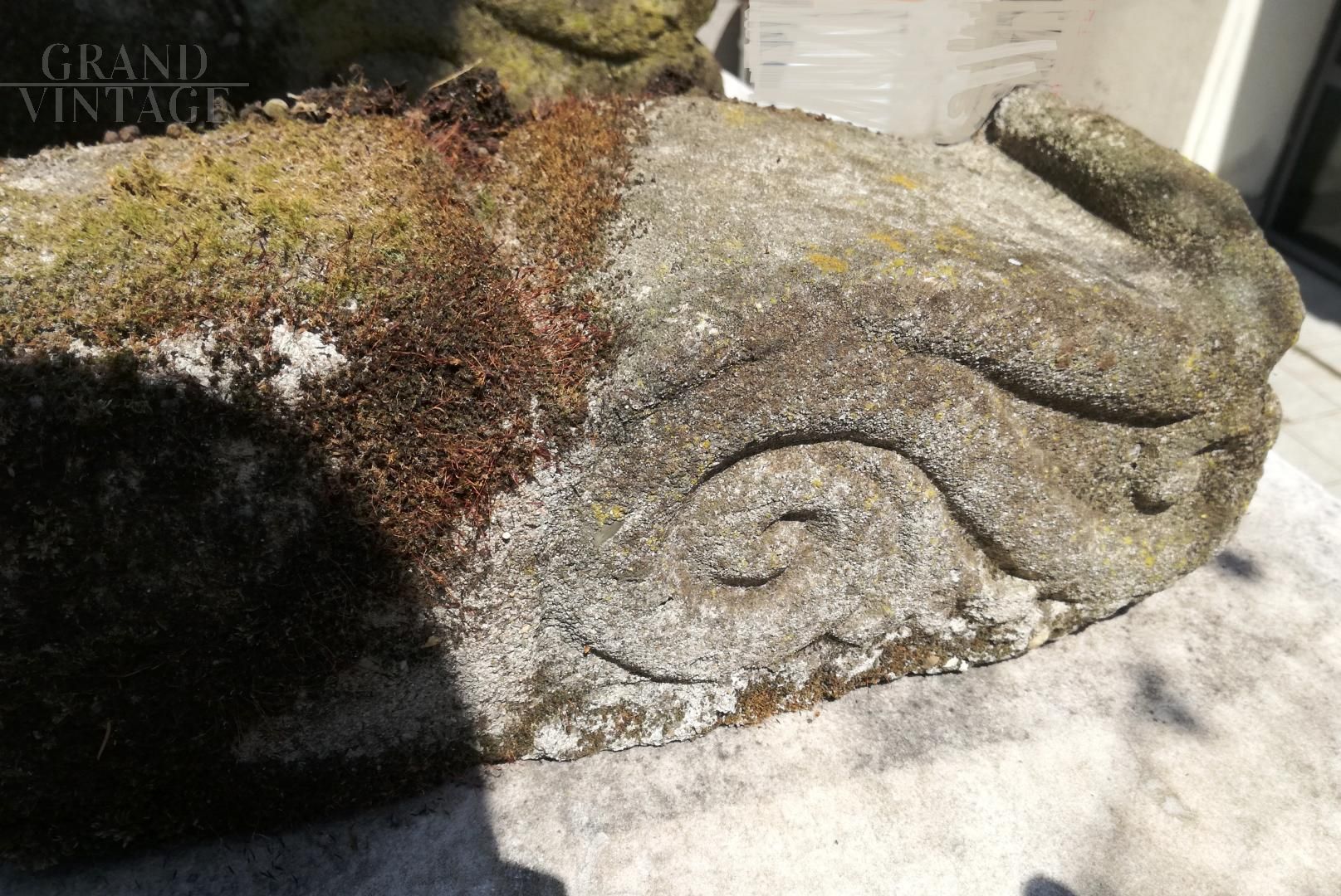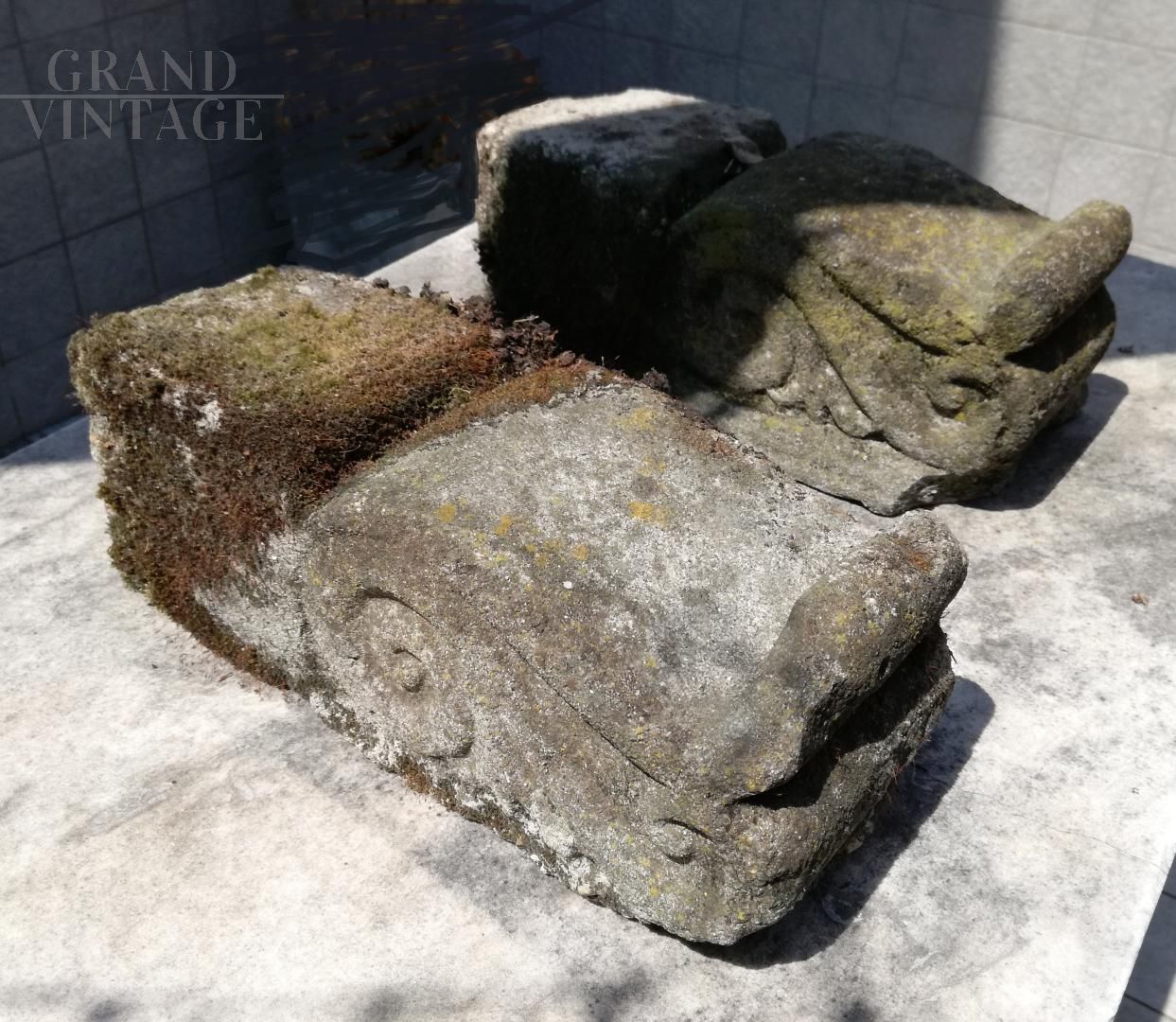 Coppia di mensole di sostegno in pietra in stile gotico. Queste mensole venivano utilizzate per il sostegno di sporti, davanzali, ballatoi, balconi, camini, fontane... negli edifici gotici e rinascimentali. La condizione è buona, non ci sono crepe e/o rotture. Possono essere riutilizzate allo scopo originario, ma presentano muschio ed incrostazioni.