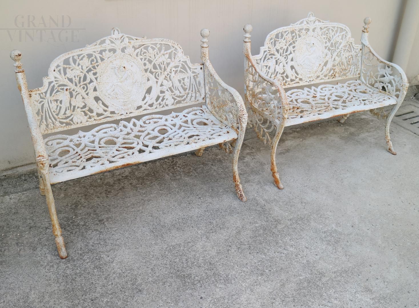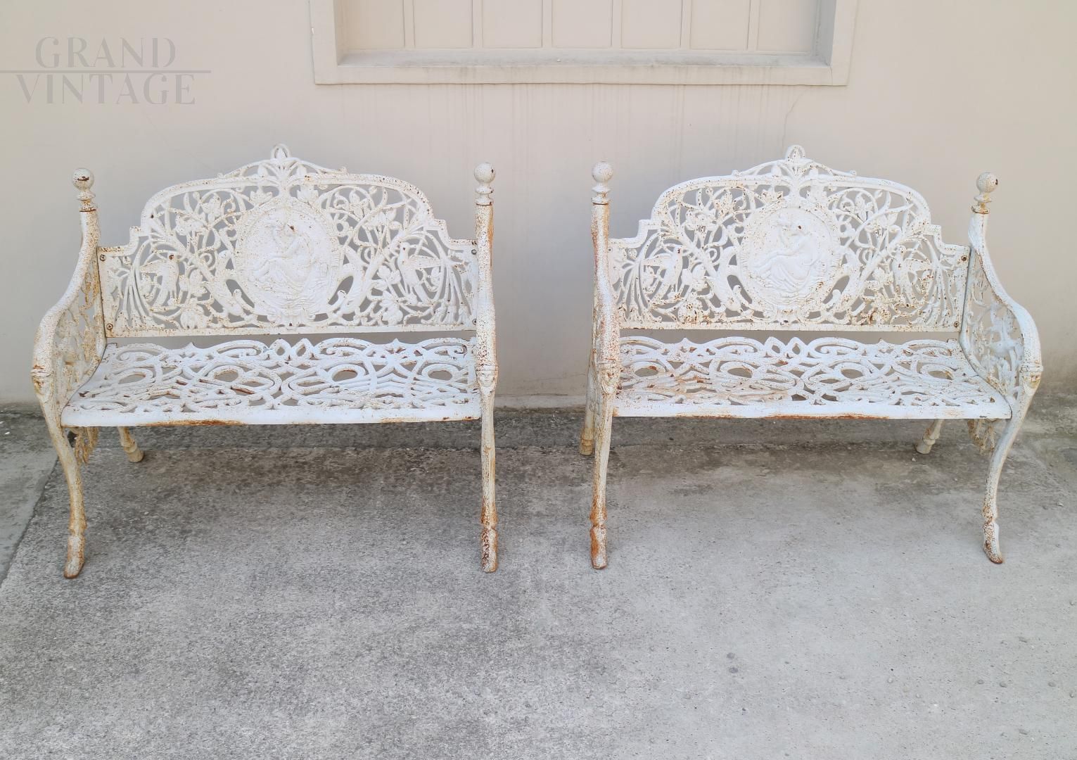 Coppia di panchine vintage da giardino in ghisa