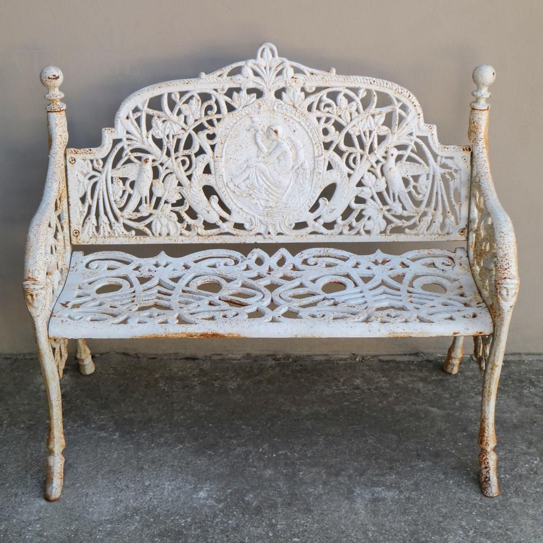 Coppia di panche da giardino vintage in ghisa di colore bianco, con un'elegante placca decorativa circolare sullo schienale. Queste splendide panche da giardino sono straordinariamente decorative e pesanti, e si adattano bene a giardini di stile antico, vintage o shabby chic. Dimensioni: larghezza 107 cm, profondità 55 cm, altezza 91 cm.