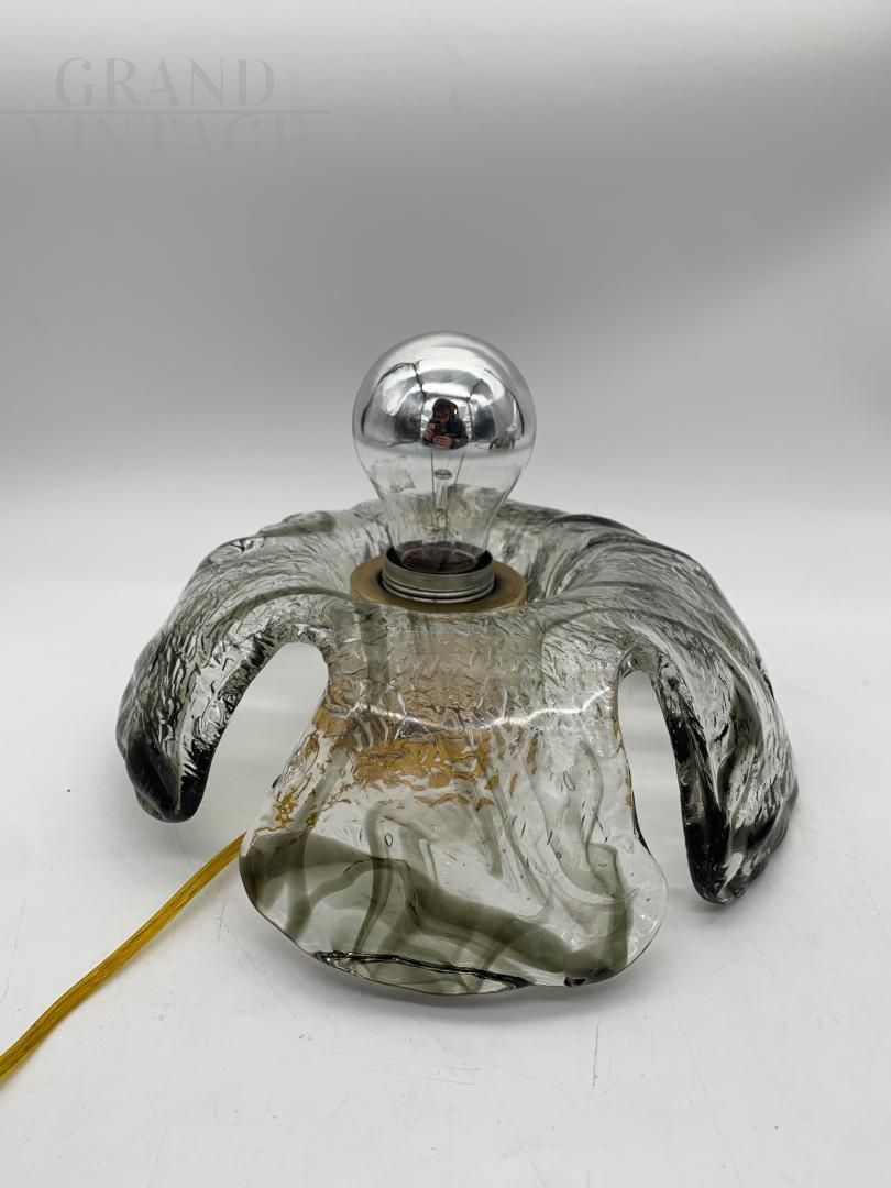 Fantastica coppia di lampade plafoniere o appliques di La Murrina anni '70 in vetro artistico di Murano grigio con forma a fiore. Le lampade sono in ottime condizioni, restaurate e con impianto elettrico rifatto, vetro lavorato a mano su piastra con vari colori tendenti al grigio e marchiato La Murrina. Il vetro è intero, non rotto nè crepato. Ciascuna lampada contiene un attacco per lampadina di tipo E27. Sono consigliate le lampadine al led. La struttura metallica ha qualche segno del tempo.
