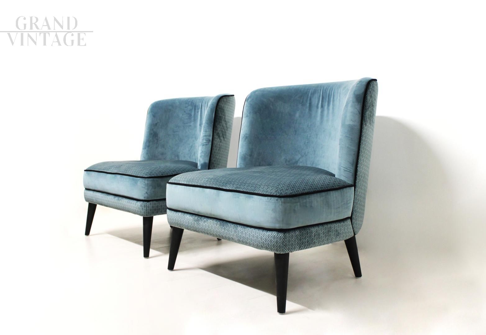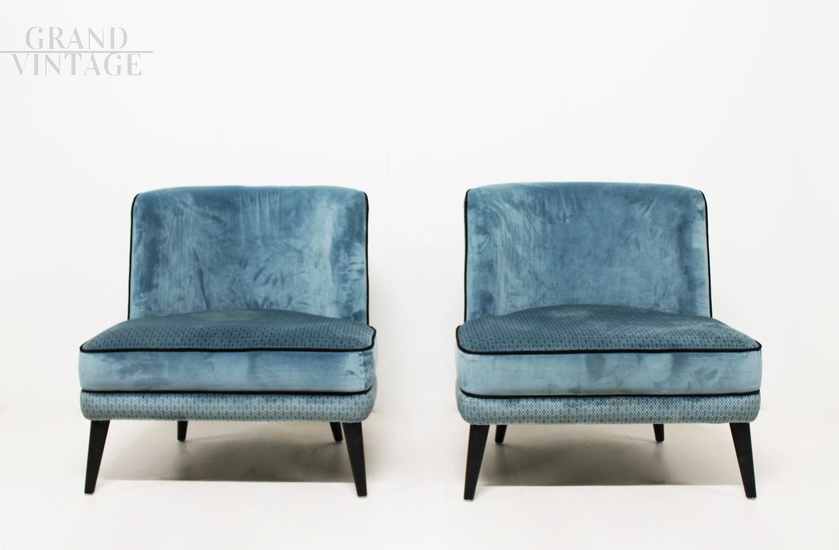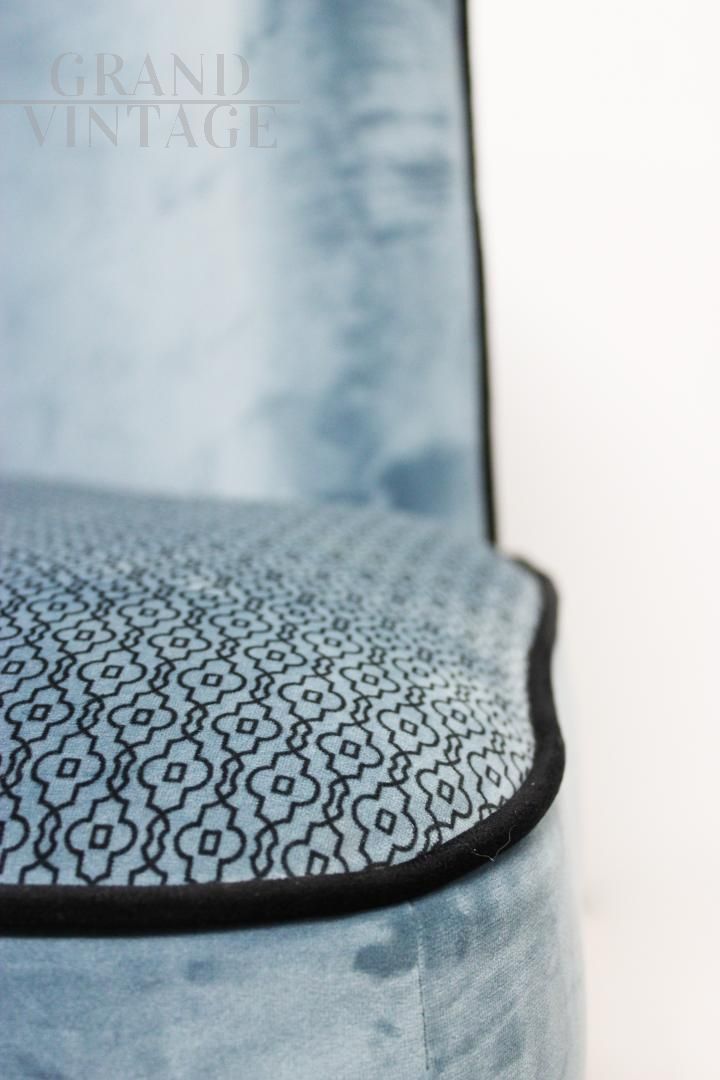 Particolare coppia di poltroncine in stile vintage francese, larghe e senza braccioli, interamente in velluto a fantasia color azzurro con profilo nero.