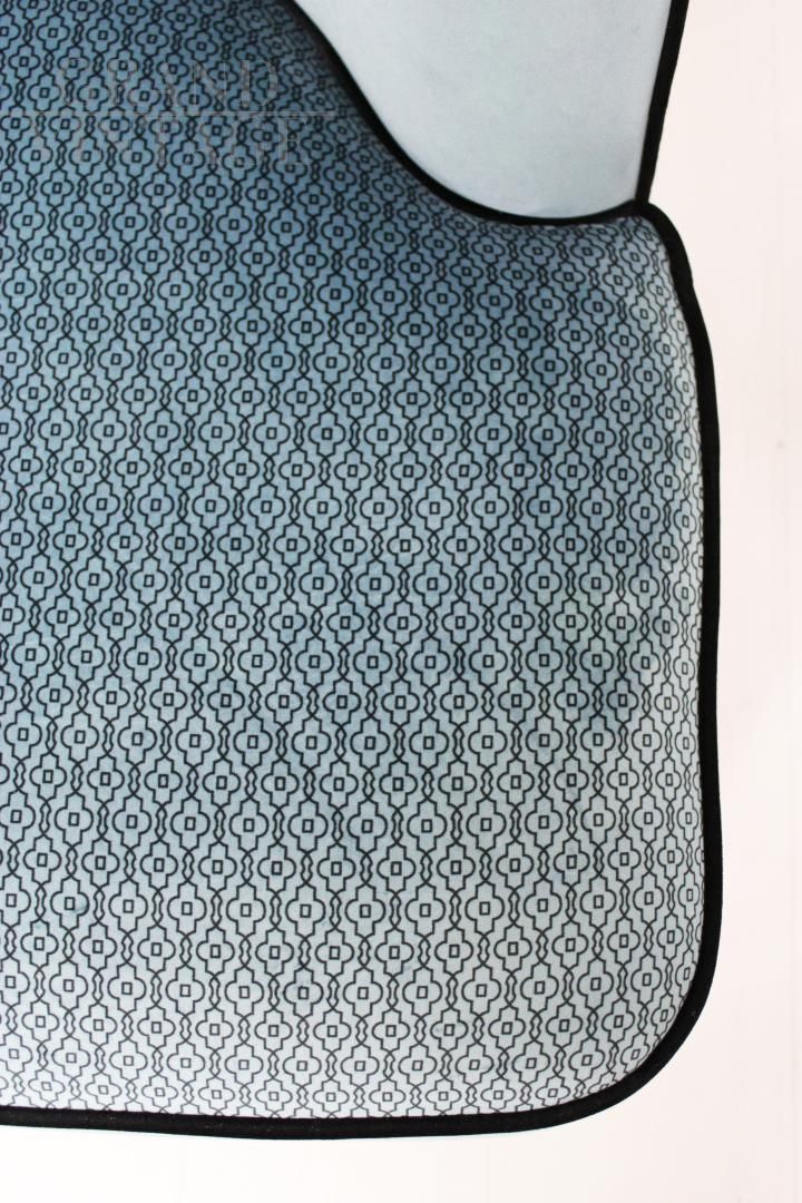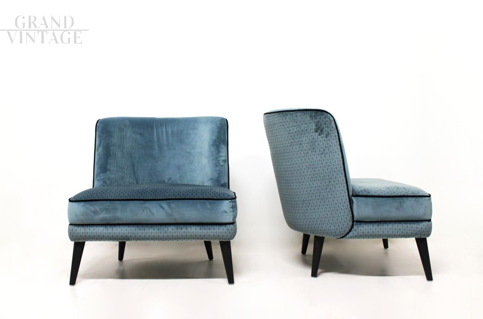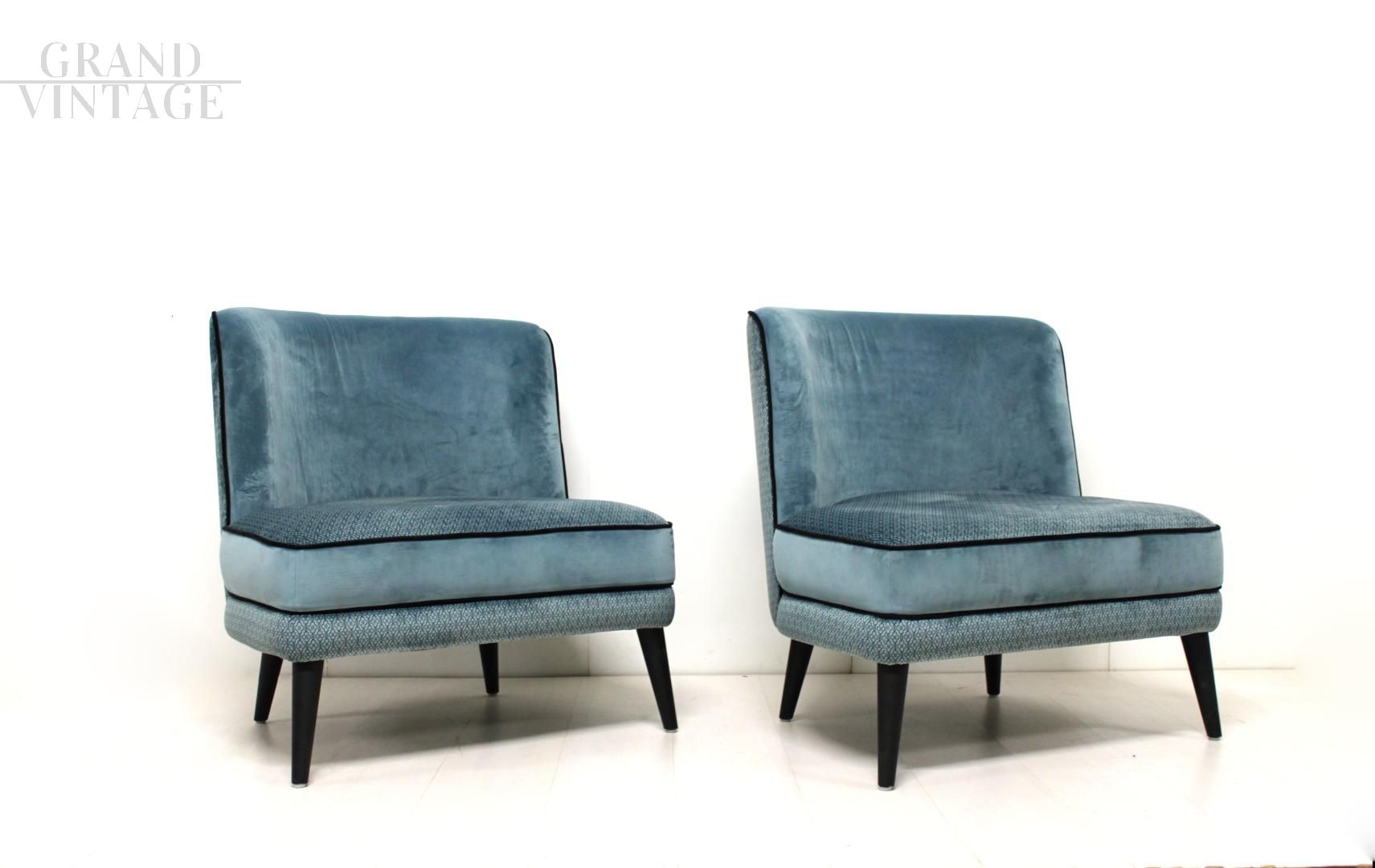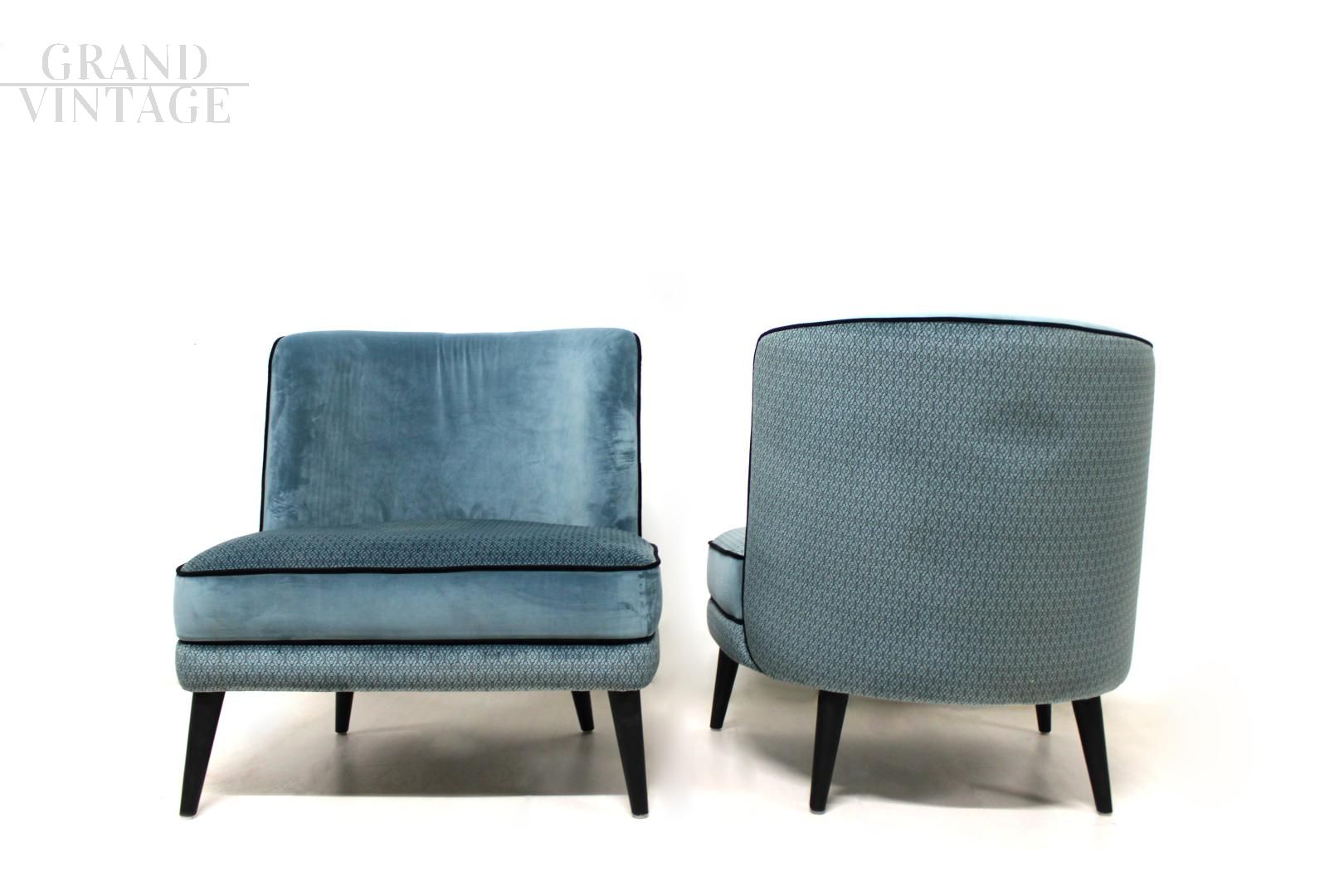 Particolare coppia di poltroncine in stile vintage francese, larghe e senza braccioli, interamente in velluto a fantasia color azzurro con profilo nero.