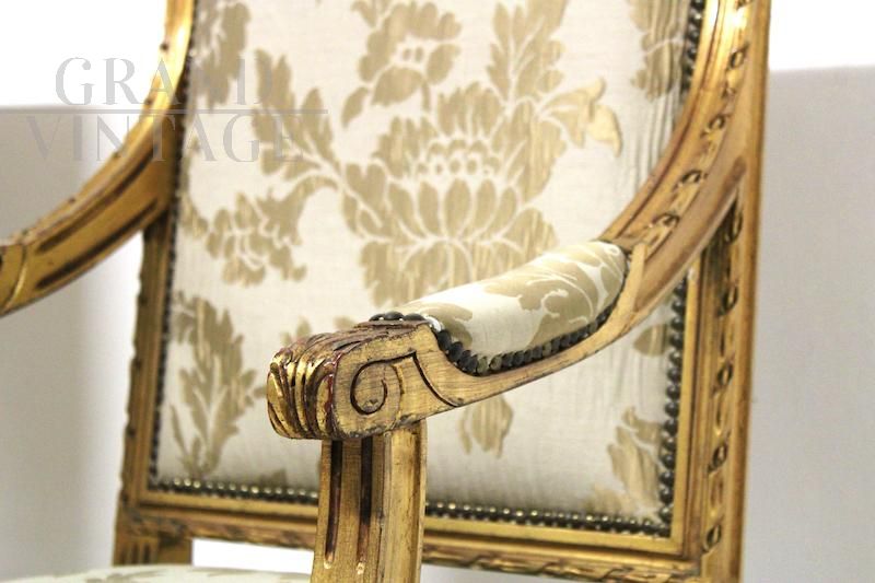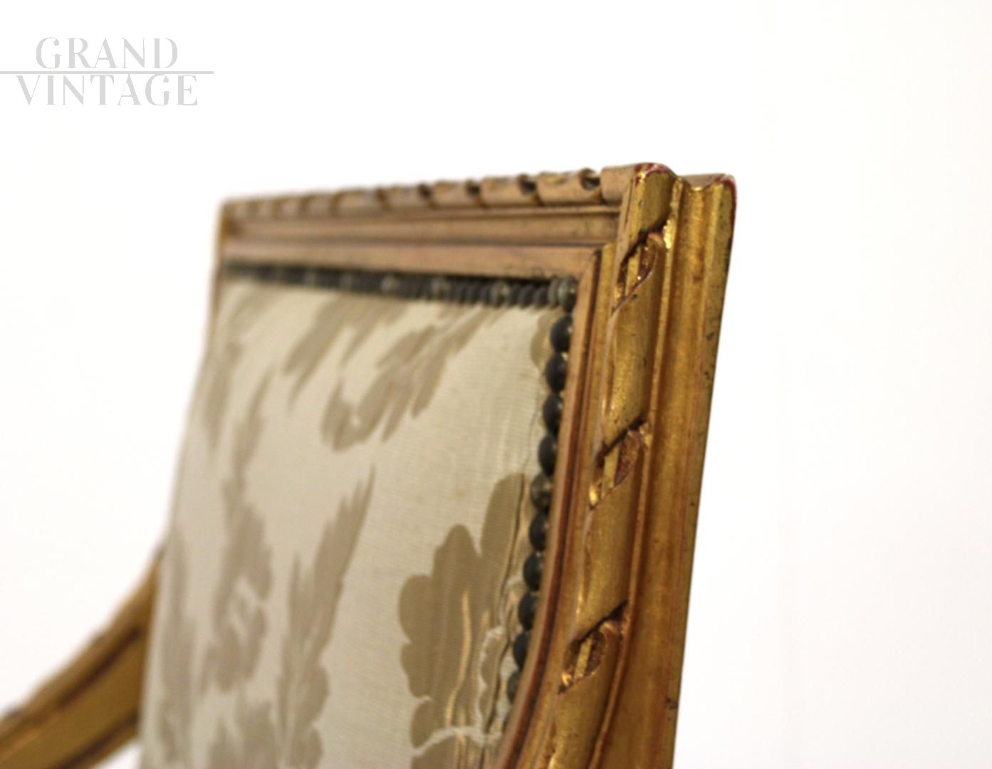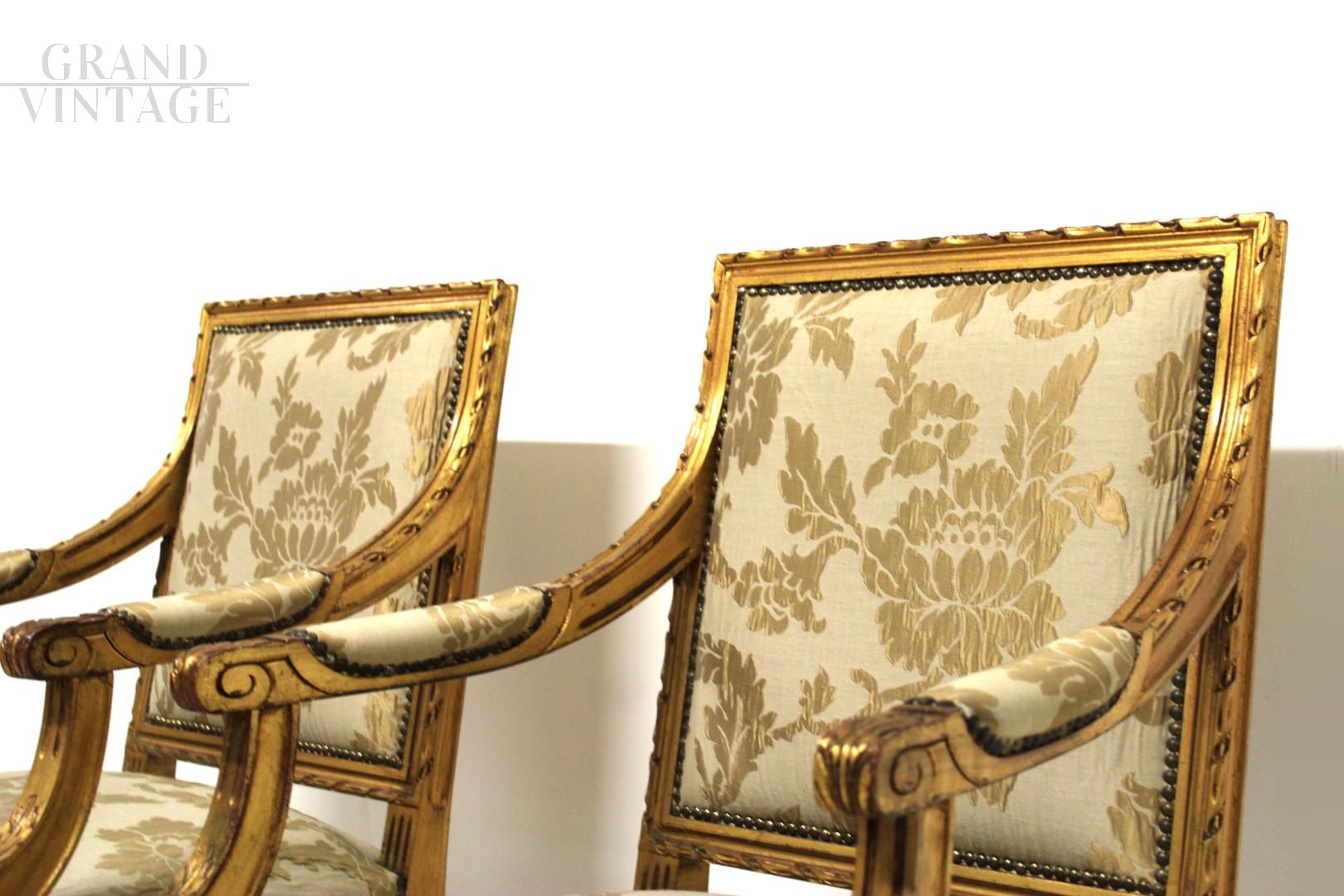 Coppia di poltroncine barocche stile Luigi XVI con struttura in legno e finitura in foglia d'oro, rivestimento in tessuto broccato originale.