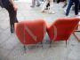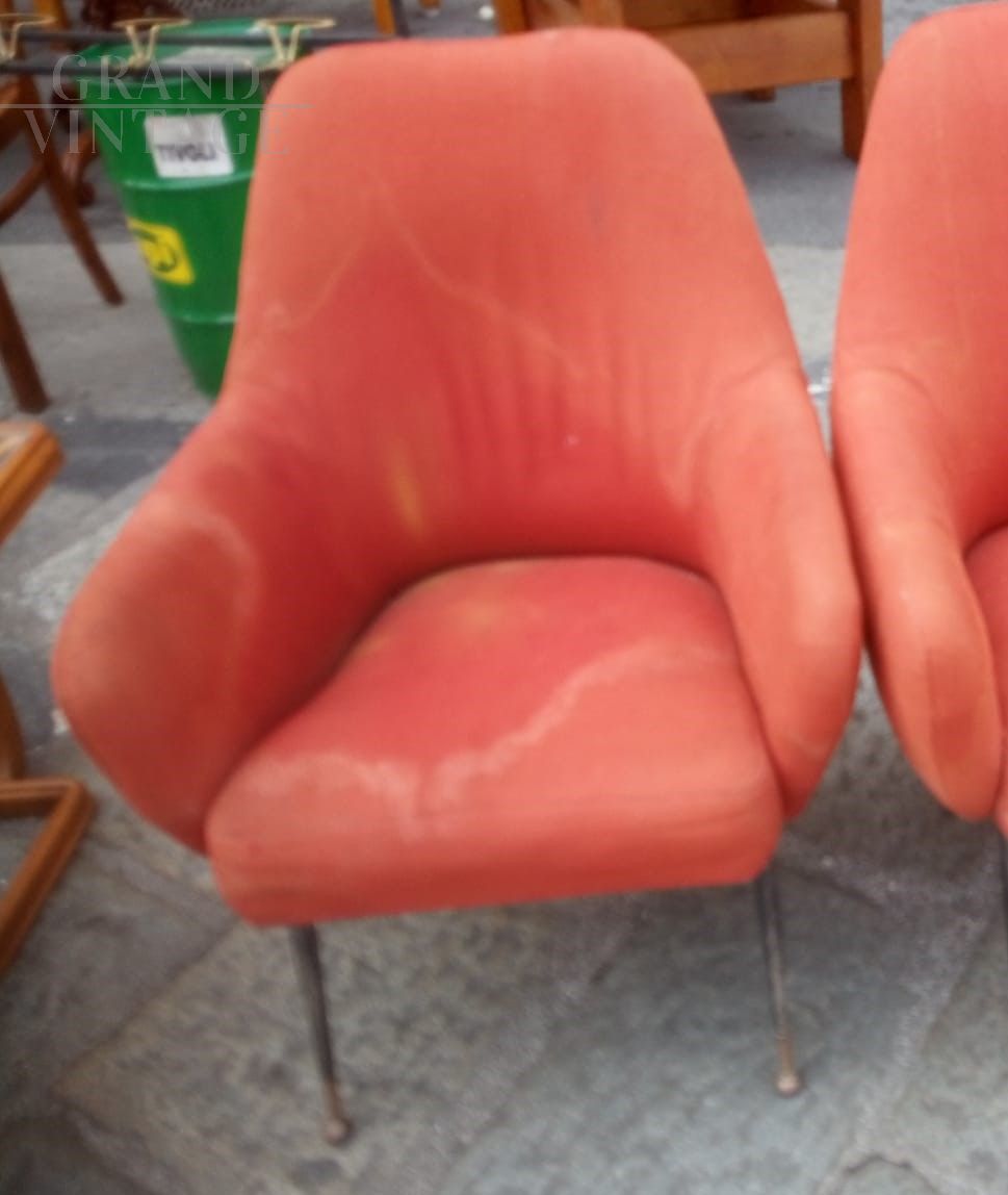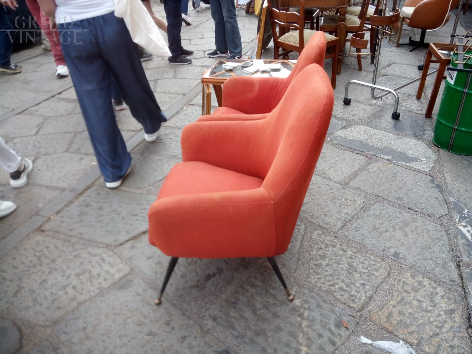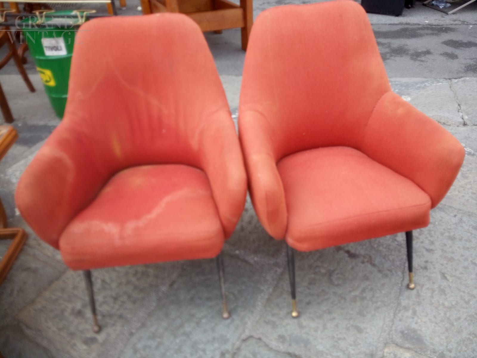 Coppia di poltrone modernariato classiche in tessuto rosso con piedi in ottone. Le poltroncine presentano i segni del tempo, come da foto, e necessitano di un intervento di ritappezzamento. A livello strutturale sono resistenti e in buone condizioni.