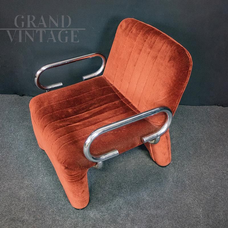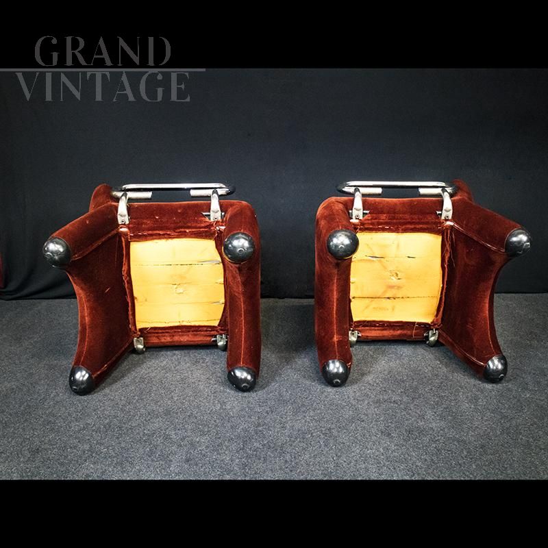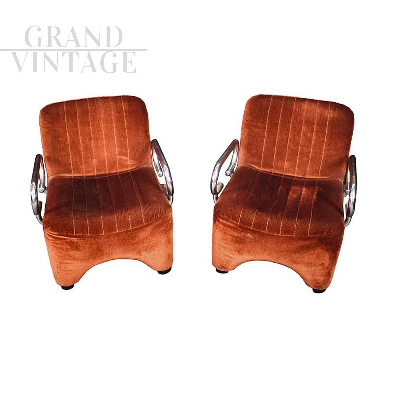 Coppia di poltroncine vintage anni '60 in stile space age, con struttura in acciaio cromato e rivestimento in velluto color mattone - bordeaux originale dell'epoca. Le poltrone sono in buono stato di conservazione con piccoli segni del tempo.
