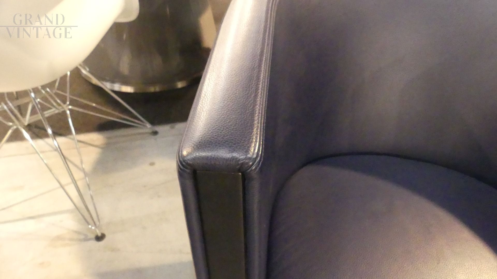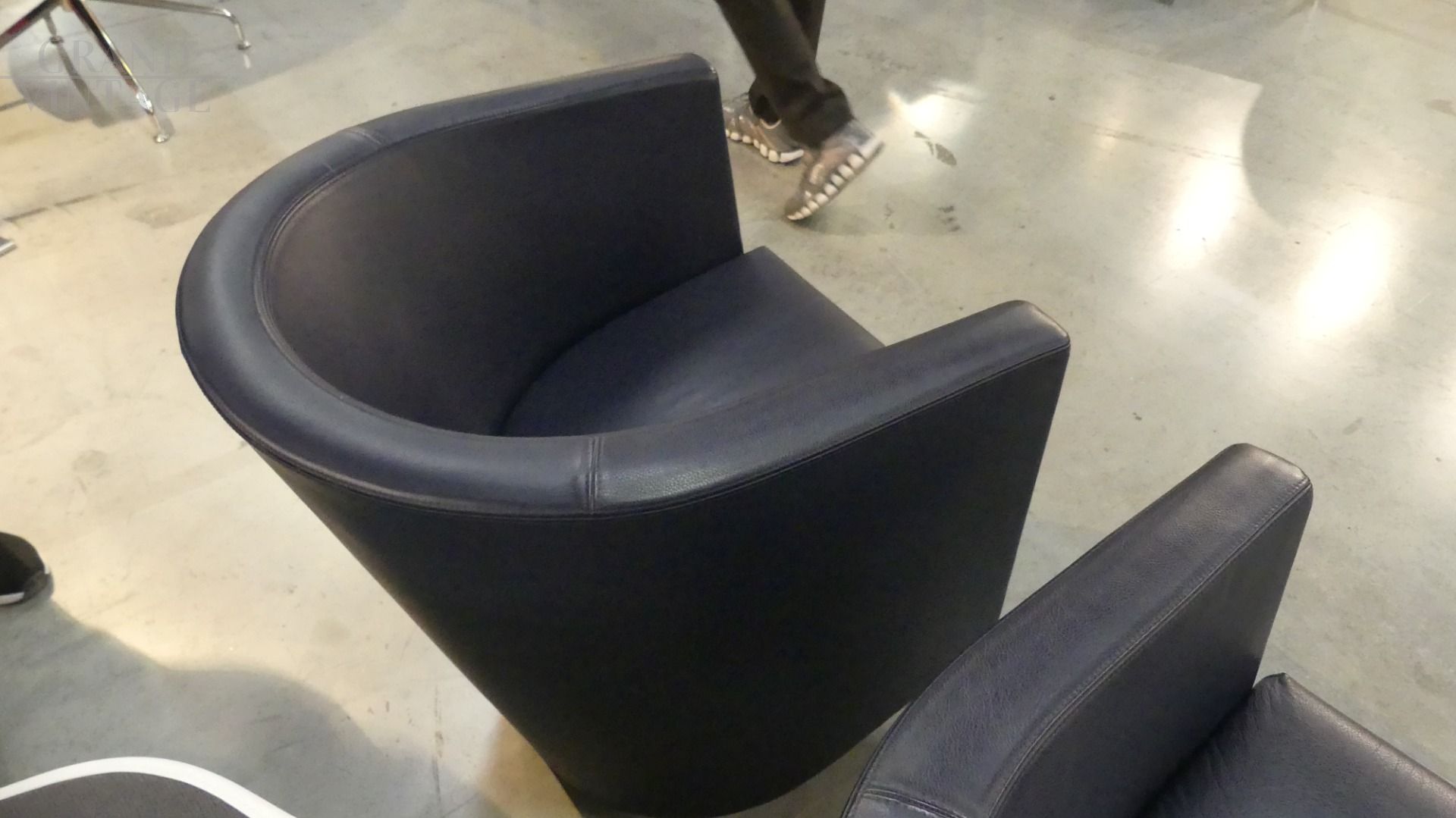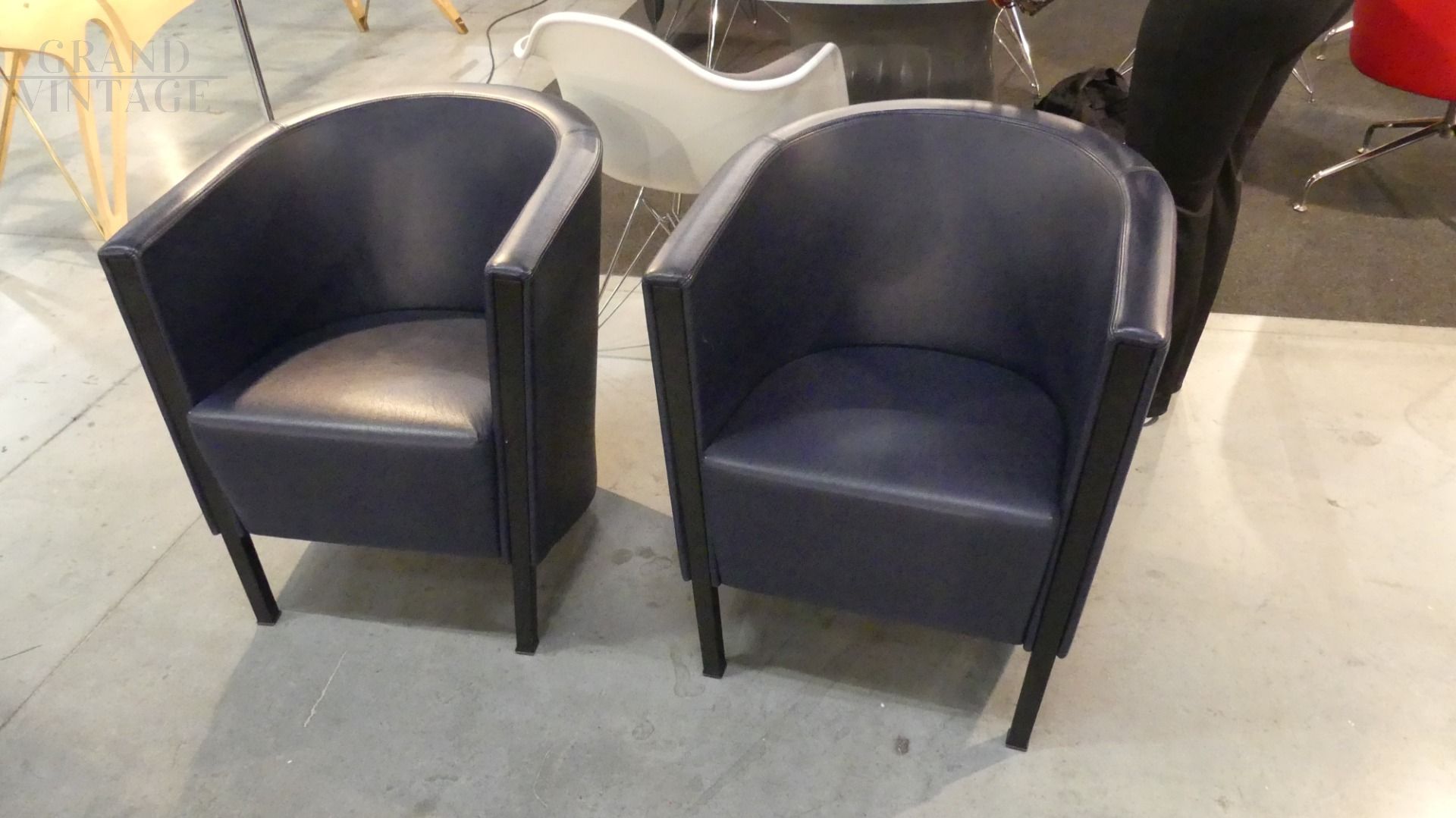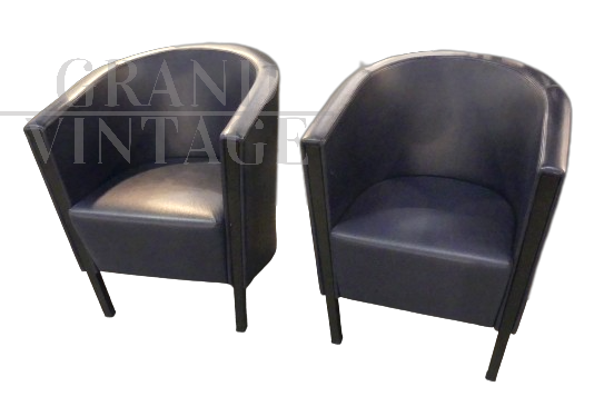 Coppia di poltroncine Novecento di Antonio Citterio per Moroso in vera pelle blu scuro, con il caratteristico appoggio a ferro di cavallo nella parte posteriore. In ottime condizioni.