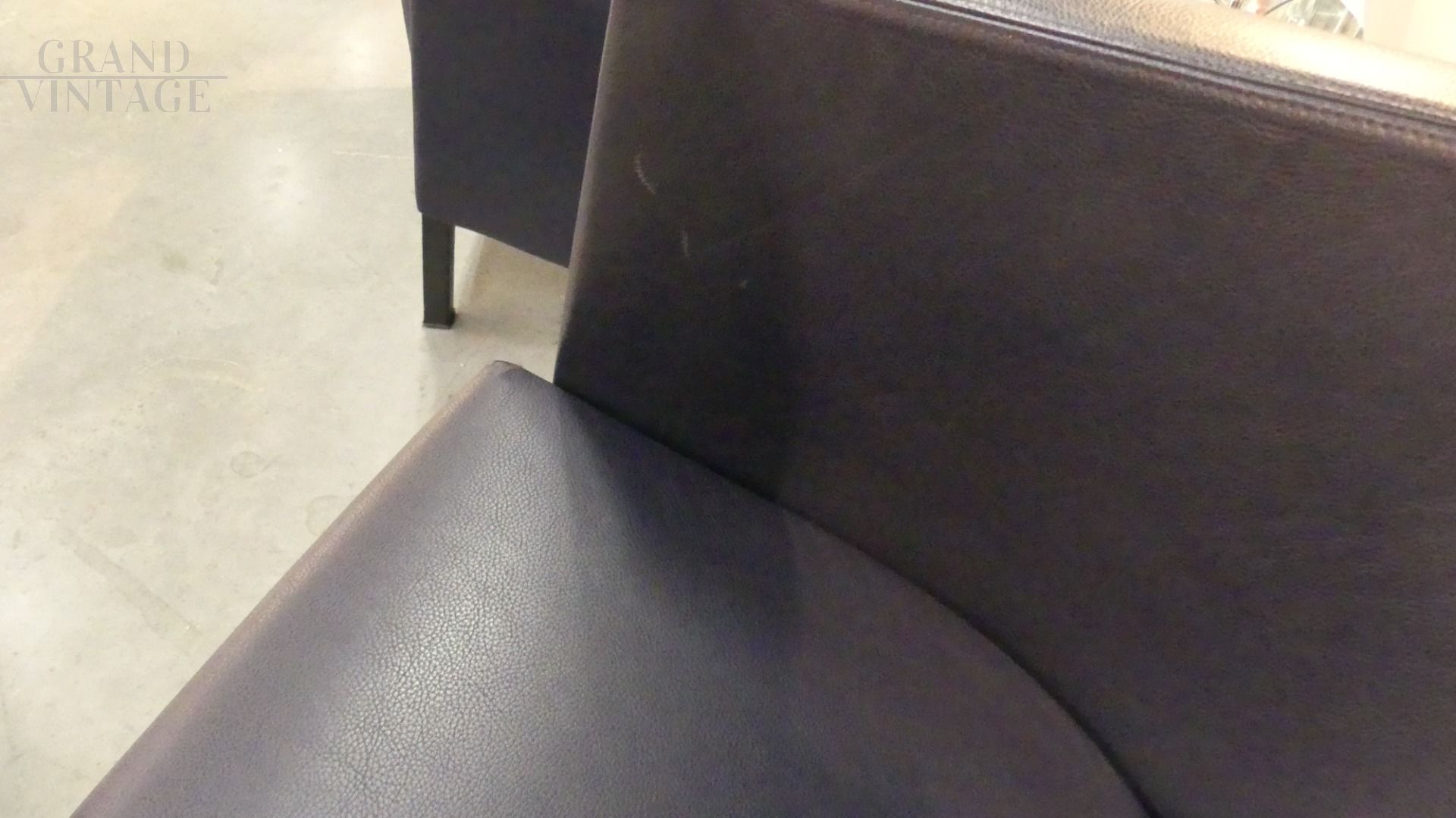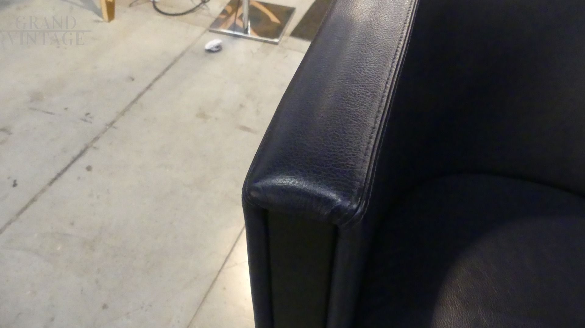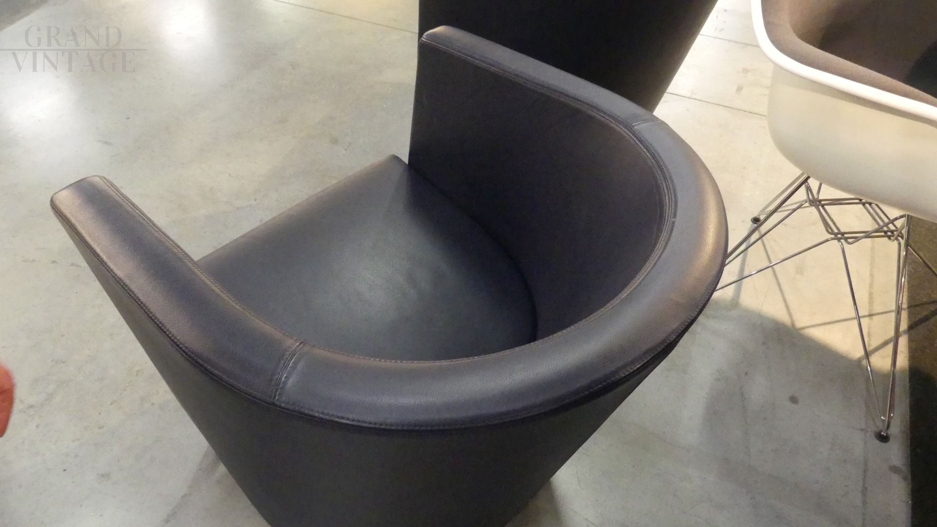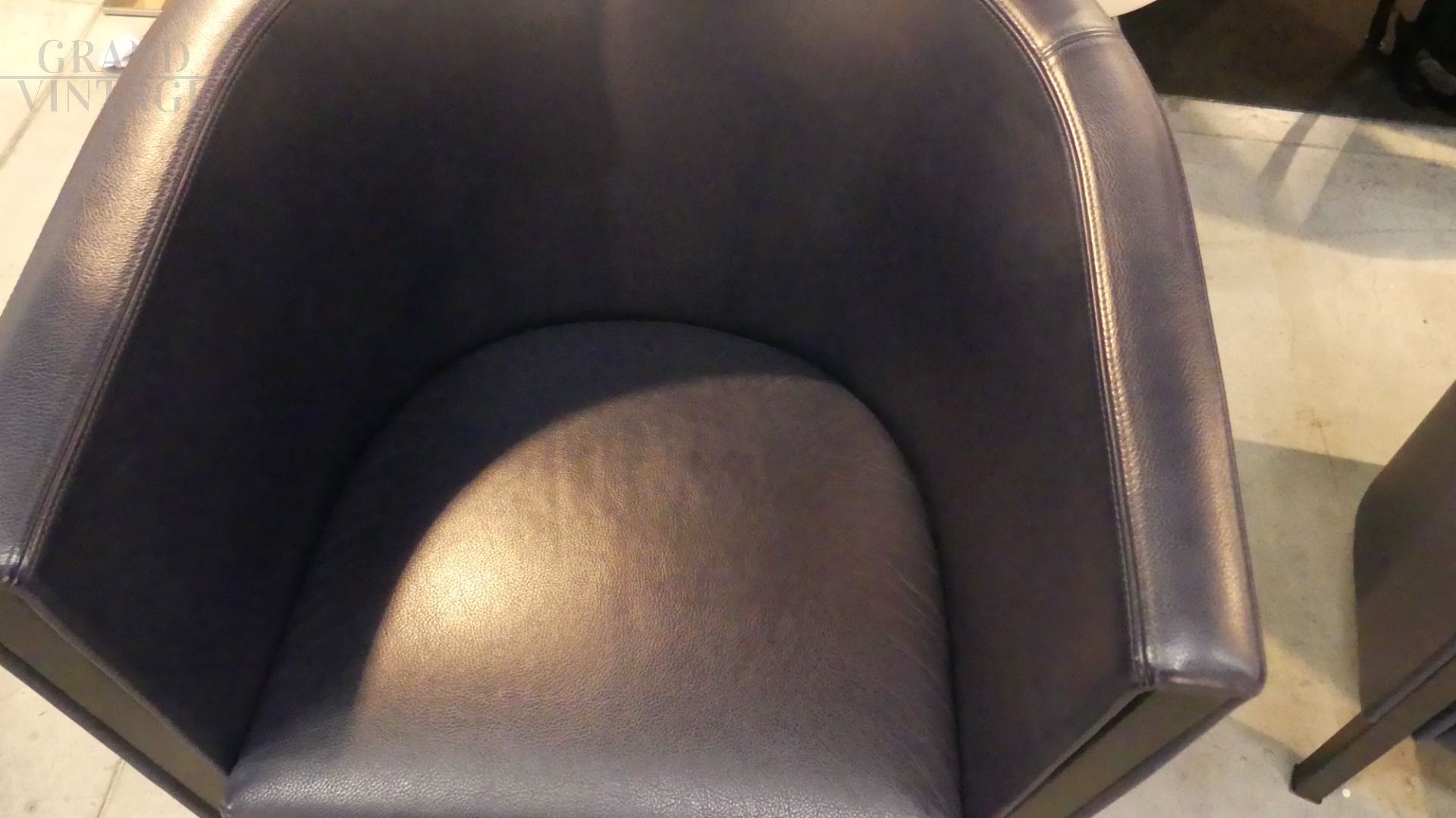 Coppia di poltroncine Novecento di Antonio Citterio per Moroso in vera pelle blu scuro, con il caratteristico appoggio a ferro di cavallo nella parte posteriore. In ottime condizioni.