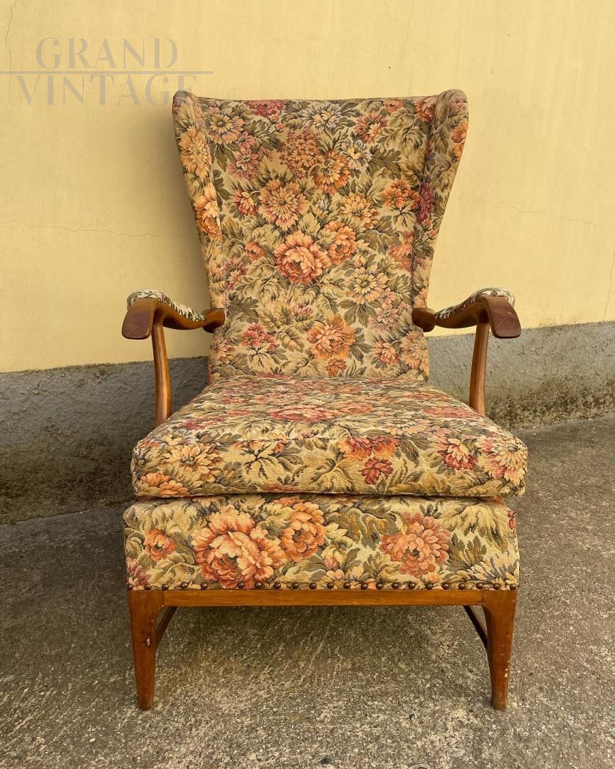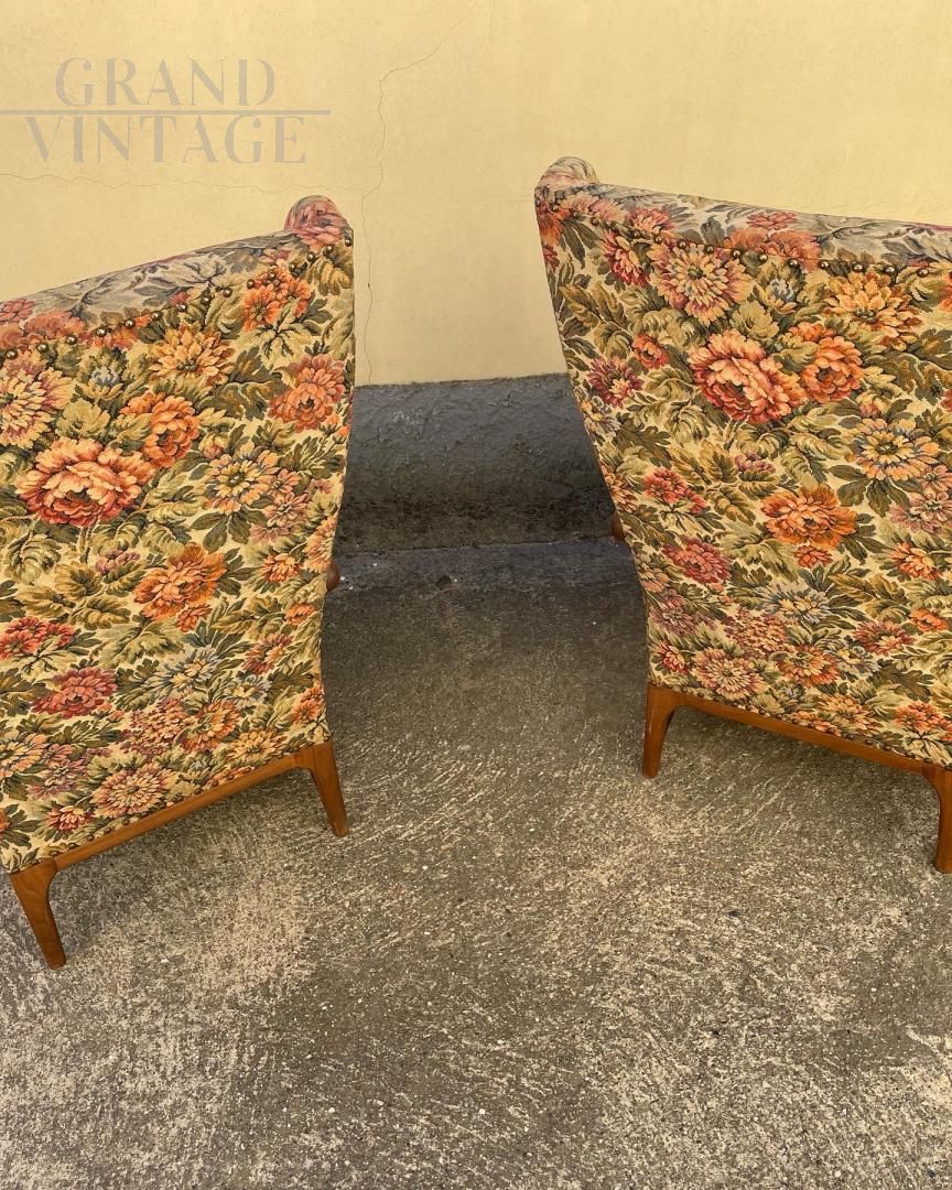 Coppia di poltrone alate design di Paolo Buffa per Frama degli anni '50, in ottime condizioni con tessuto floreale originale, presentano alcuni punti più consumati, come da foto.