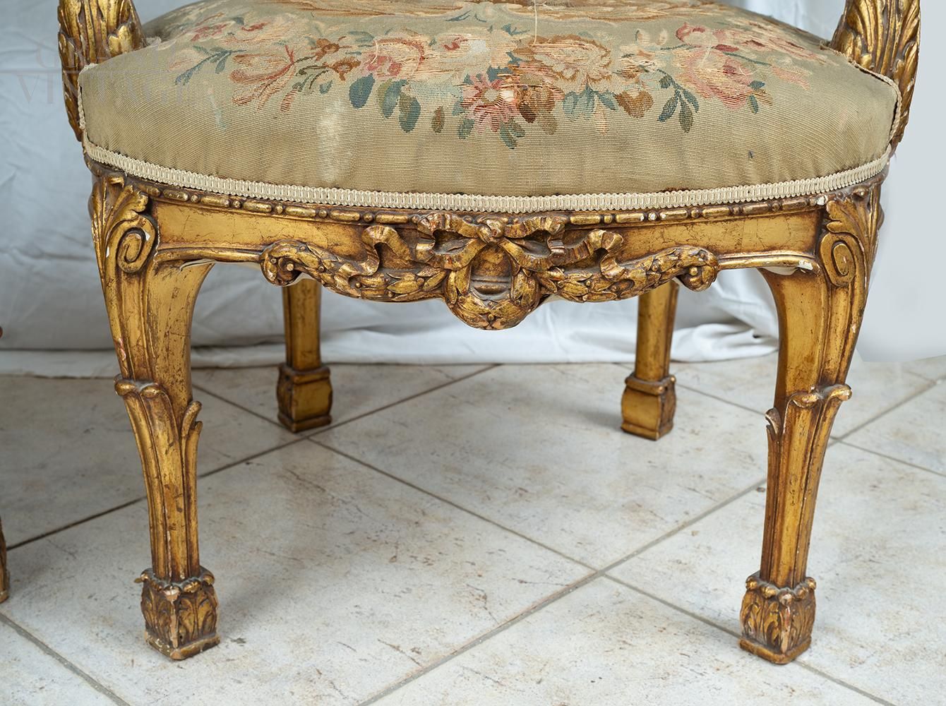 Coppia di poltrone antiche in legno dorato con tessuto Aubusson