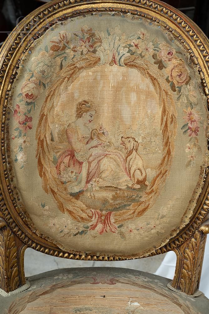 Coppia di poltrone antiche di epoca Napoleone III in legno dorato e intagliato appartenenti alla seconda metà del XIX secolo. Lo schienale di forma circolare presenta un intaglio a motivo geometrico e reca al centro un medaglione in tessuto Aubusson con scena galante. I due braccioli hanno un andamento curvilineo e sono collegati alla seduta tramite intaglio fogliaceo. I piedi di forma troncoconica sono collegati tramite un grembiule mistilineo con al centro una ghirlanda.
