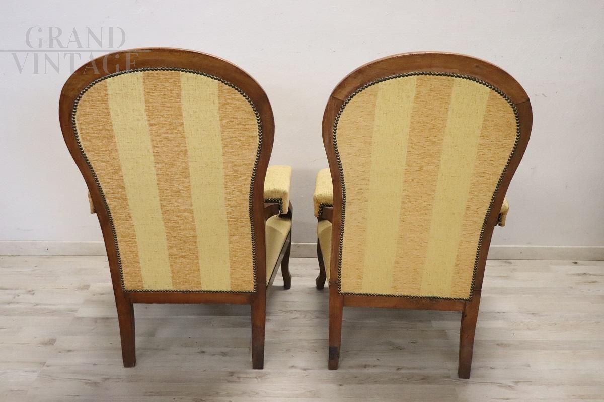 Vi presentiamo una magnifica coppia di antiche poltrone imbottite italiane, realizzate a metà del XIX secolo durante l'elegante periodo Luigi Filippo. Queste squisite poltrone sono costruite in legno di noce di alta qualità e presentano un design senza tempo che bilancia comfort e stile. I sedili e gli schienali sono generosamente imbottiti e rivestiti in un ricco tessuto giallo intenso che aggiunge un tocco di calore e raffinatezza a qualsiasi spazio. Una caratteristica distintiva di queste poltrone è lo schienale reclinabile, che consente il massimo relax e la massima versatilità d'uso: perfetto per godersi un buon libro, conversare o semplicemente rilassarsi dopo una lunga giornata. Ottime condizioni, prezzo trattabile. Altezza della seduta 40 cm