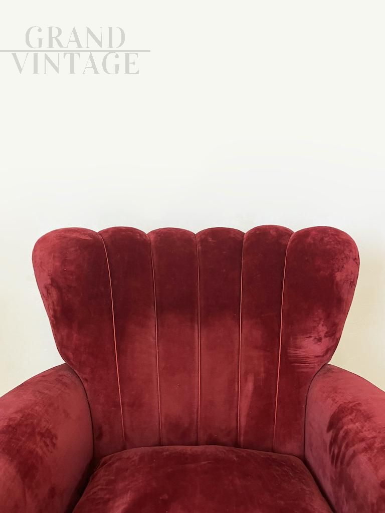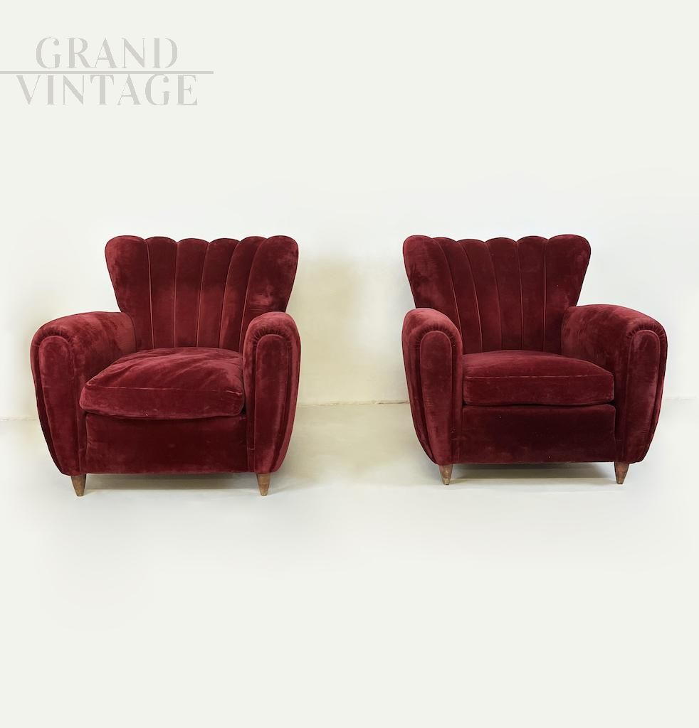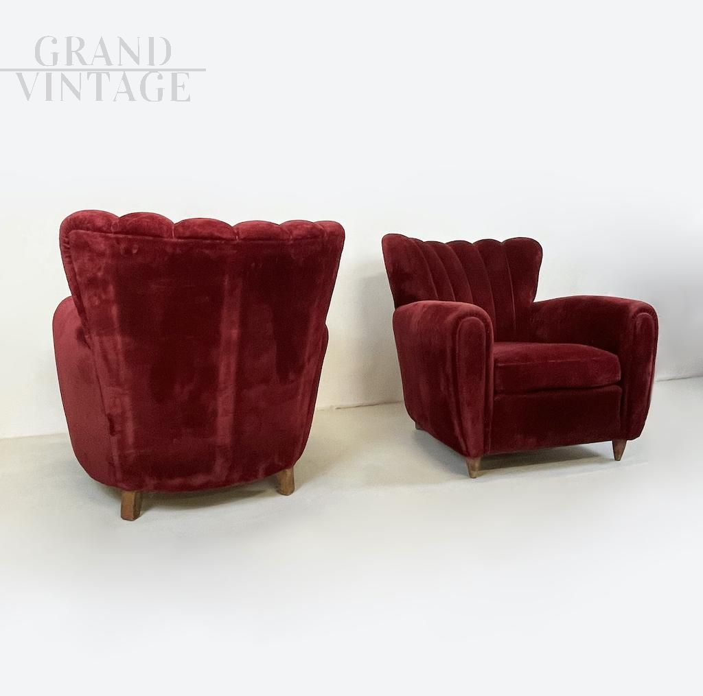Elegante coppia di poltrone Art Déco italiane anni '40 interamente imbottite e rivestite in velluto rosso bordeaux, struttura e piedini sono in legno.