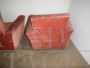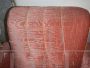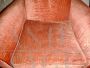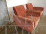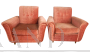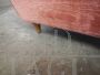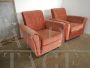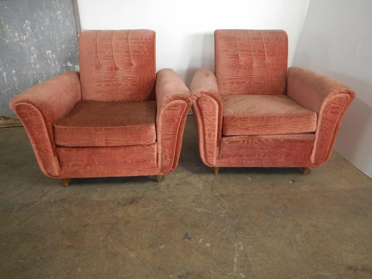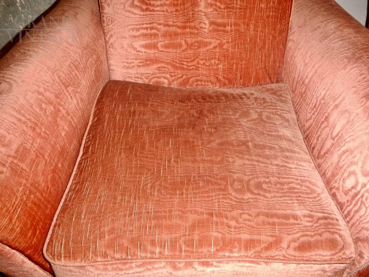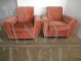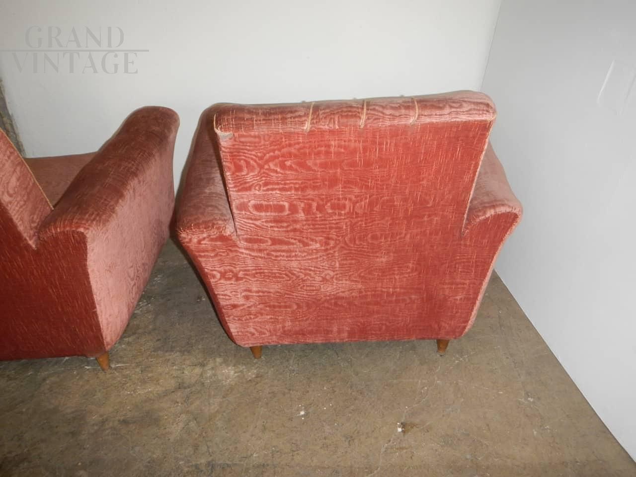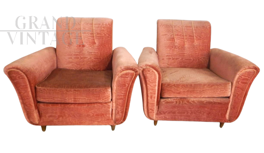 Coppia di poltrone vintage anni '50 in velluto rosso chiaro con gambe in legno, in buono stato, con molle della seduta da rivedere.