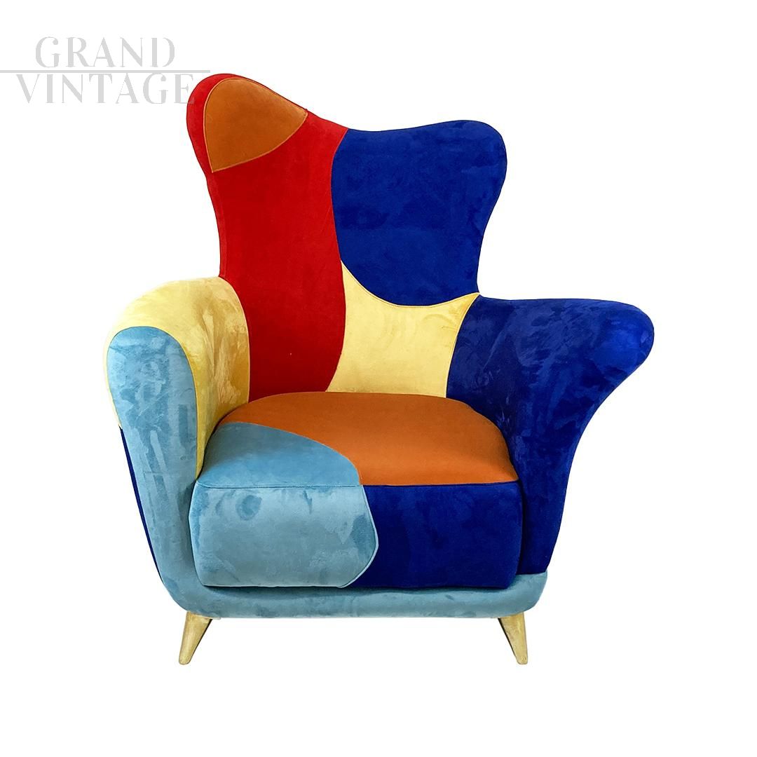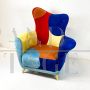 Coppia di poltrone color block asimmetriche dal design anticonformista e post-moderno, con struttura in legno, imbottite e rivestite in tessuto multicolore, piedi in ottone dorato.