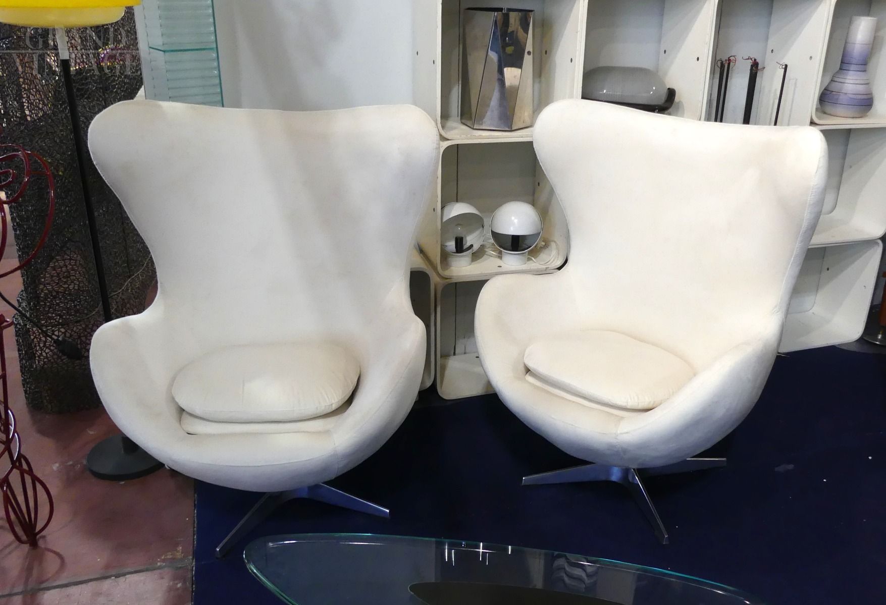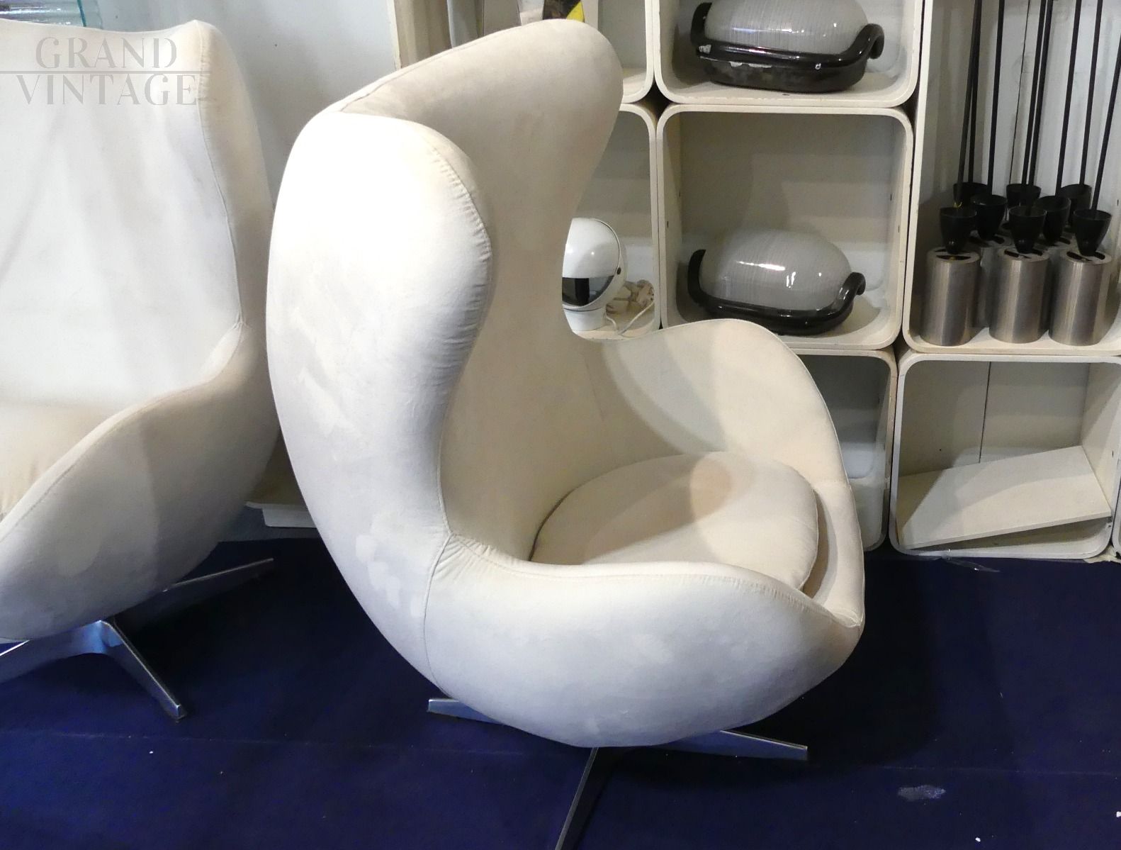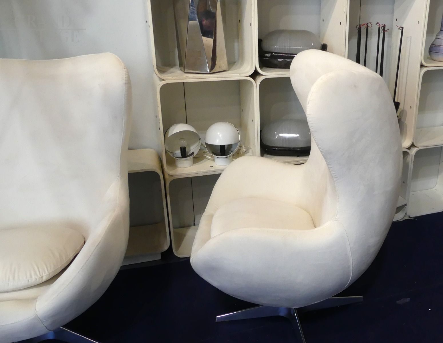 Coppia di poltrone design girevoli anni '70 in tessuto bianco, stile space age, con base in metallo cromato. In ottime condizioni.