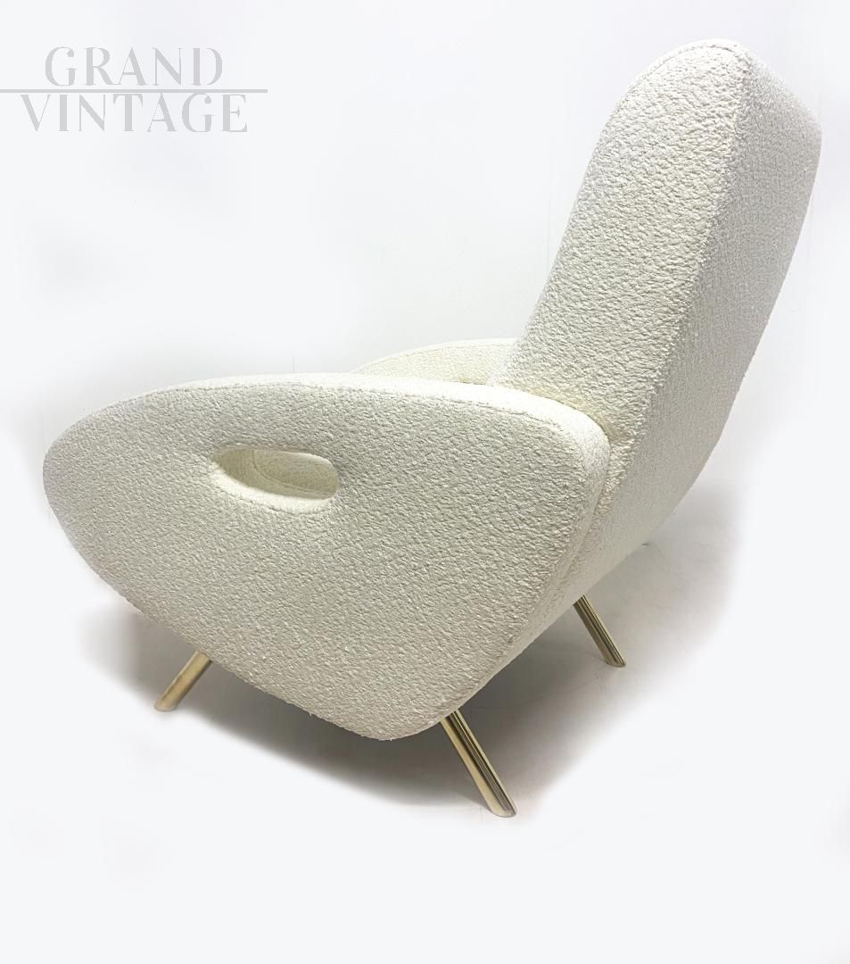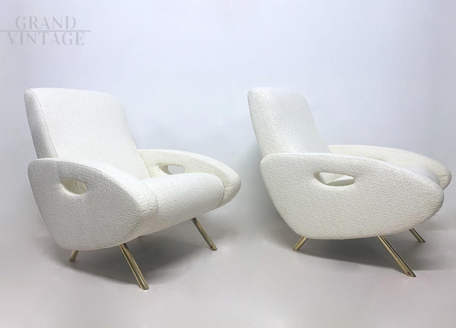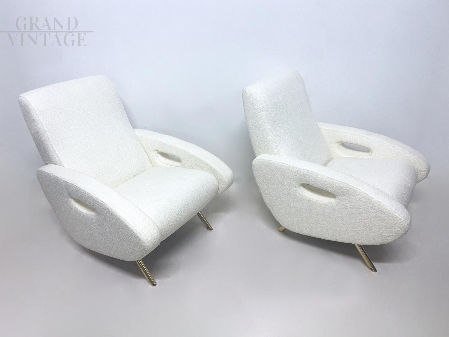 Coppia di poltrone design vintage modernariato anni '70 rivestite in tessuto ciniglia bouclé bianco con struttura in ottone, Italia anni '70.