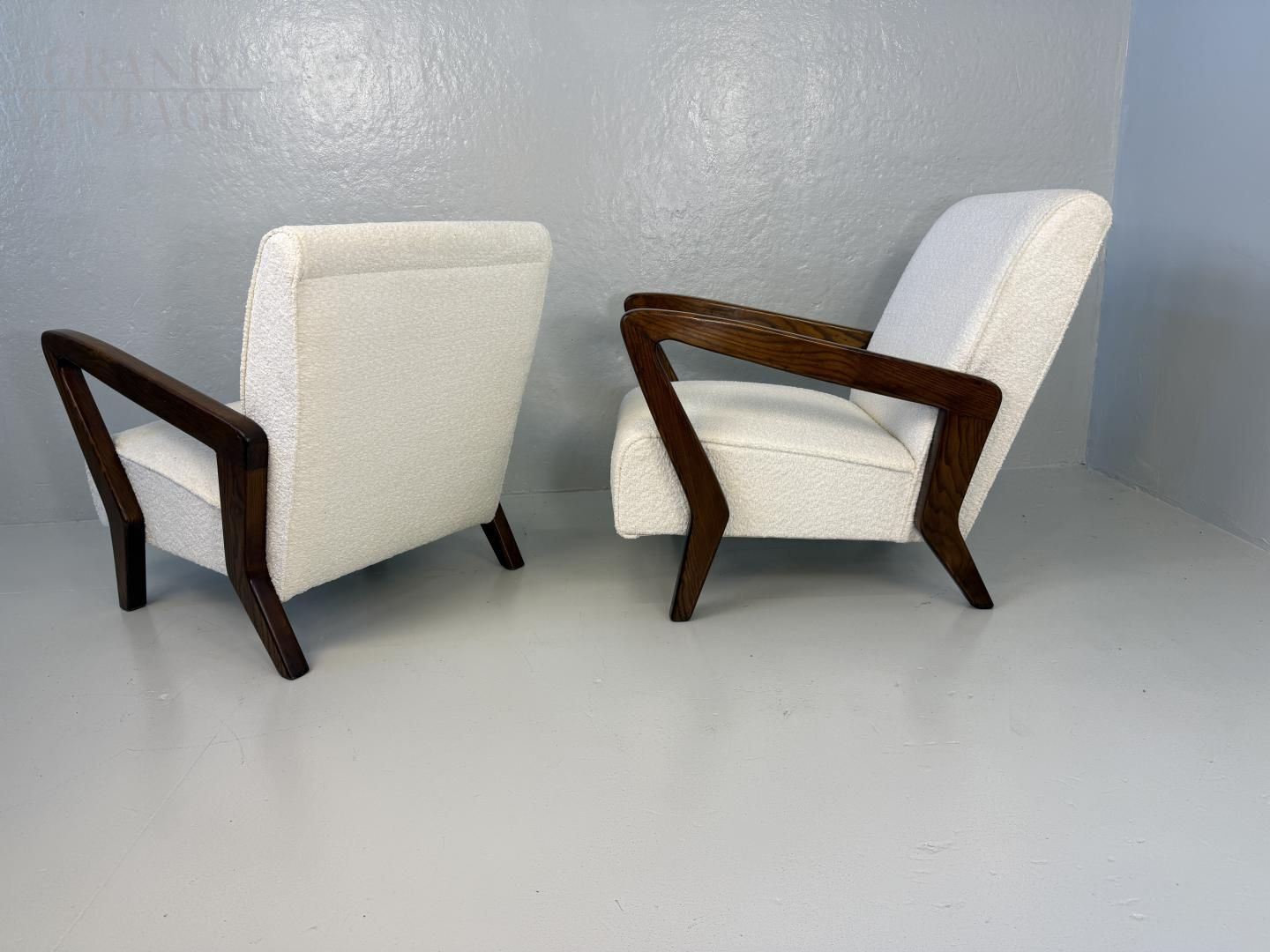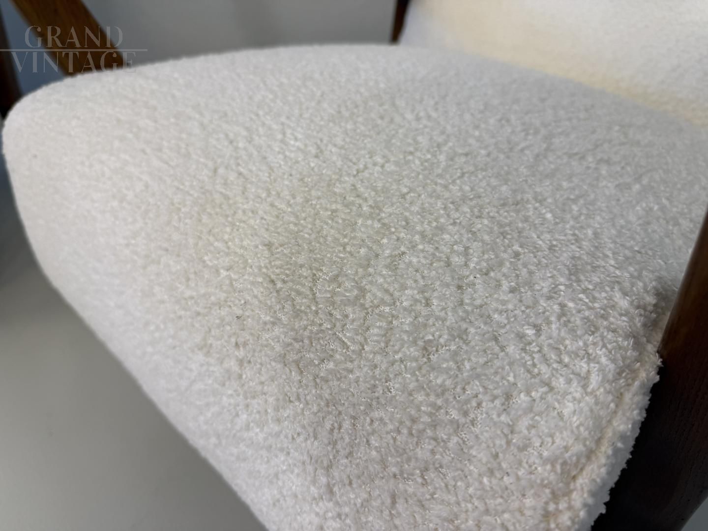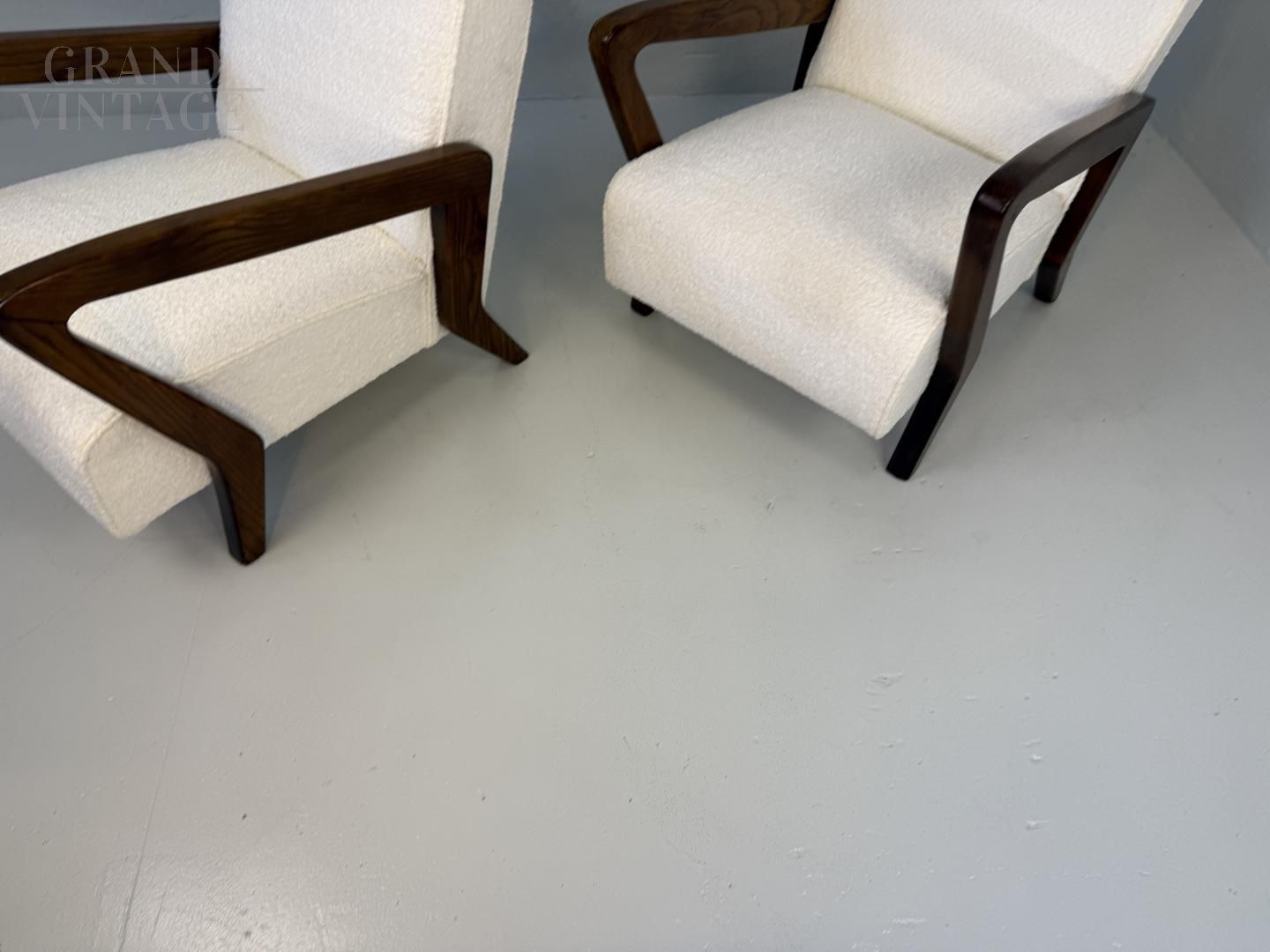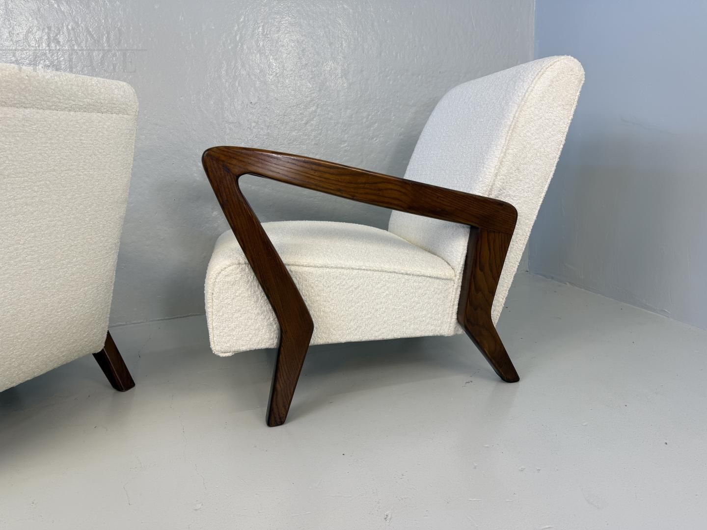 Rara coppia di poltrone disegnate da Gio Ponti negli anni '50, realizzate in legno di noce e rifoderate con tessuto bouclé bianco.