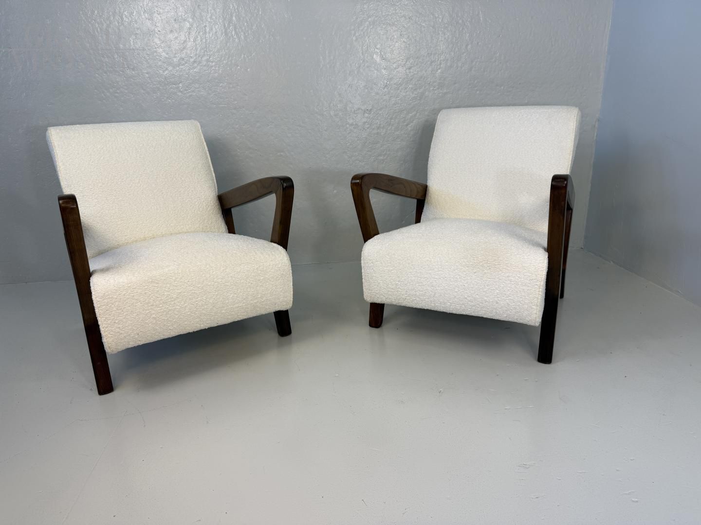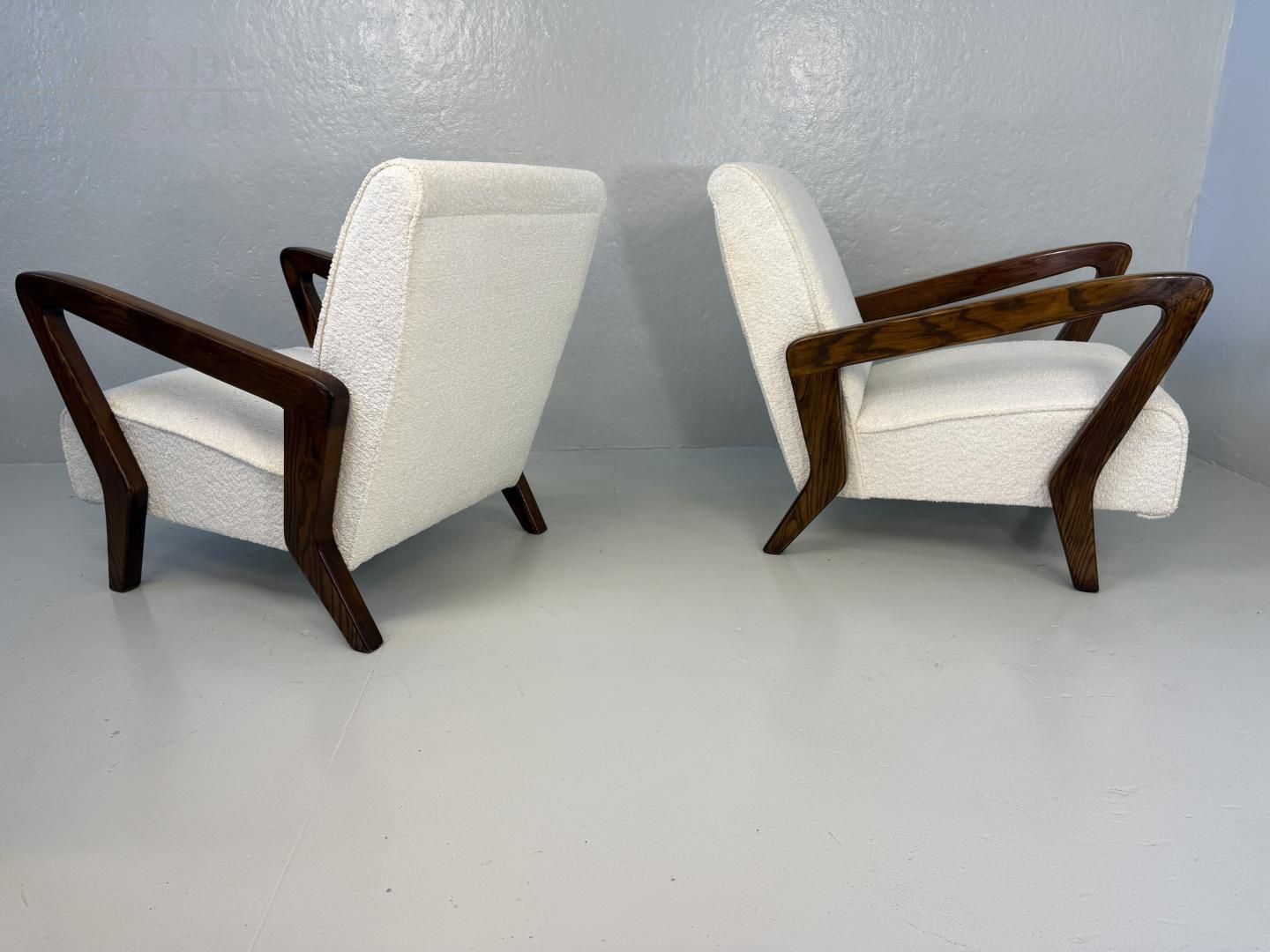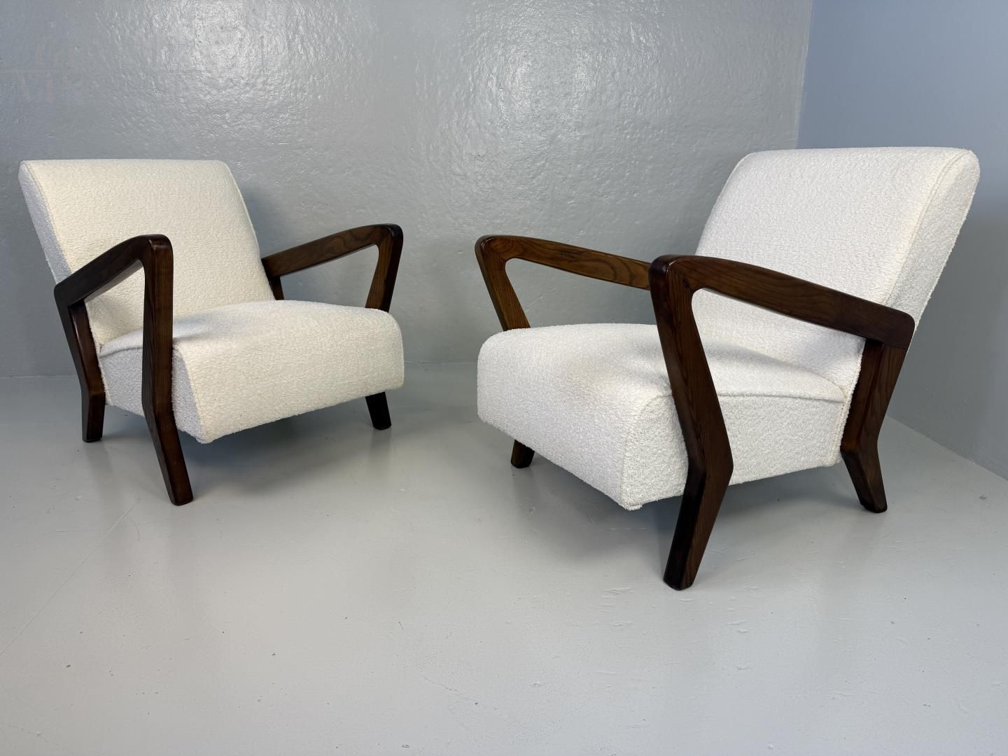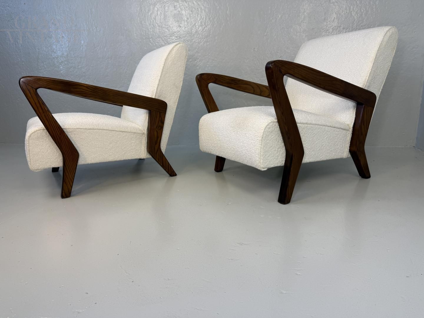 Rara coppia di poltrone disegnate da Gio Ponti negli anni '50, realizzate in legno di noce e rifoderate con tessuto bouclé bianco.